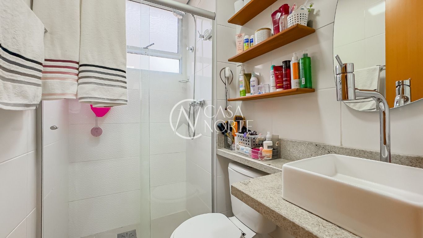 Banheiro com ventilação natural, box fechado e água quente.
