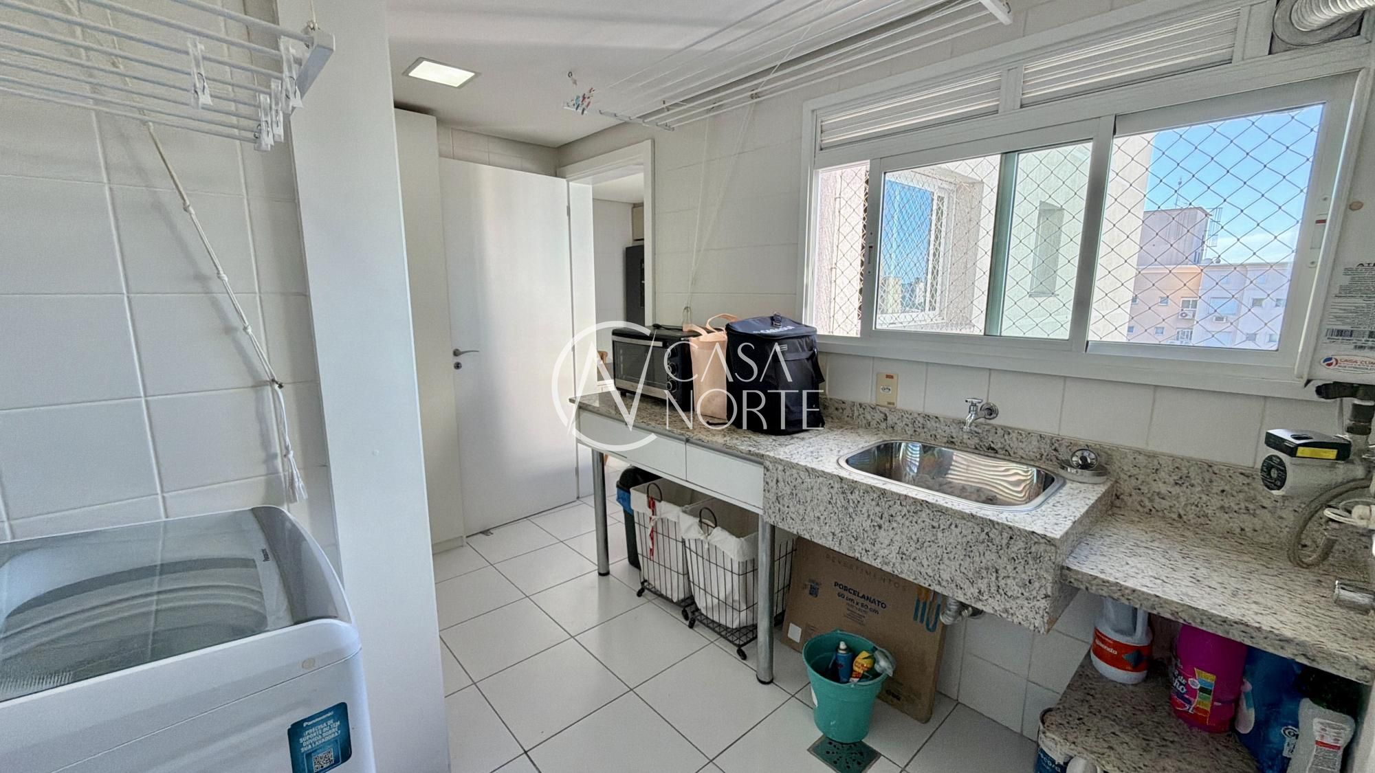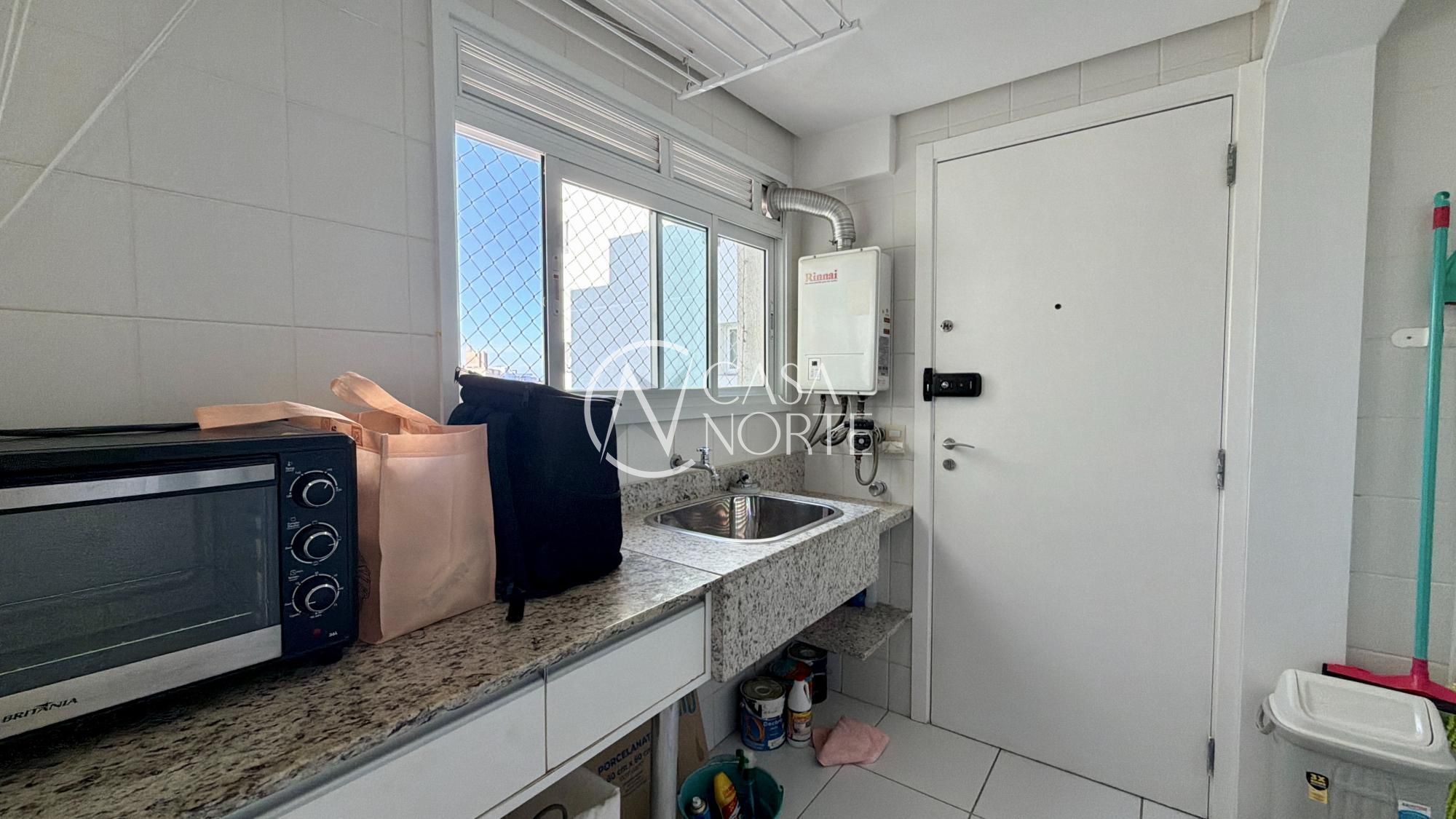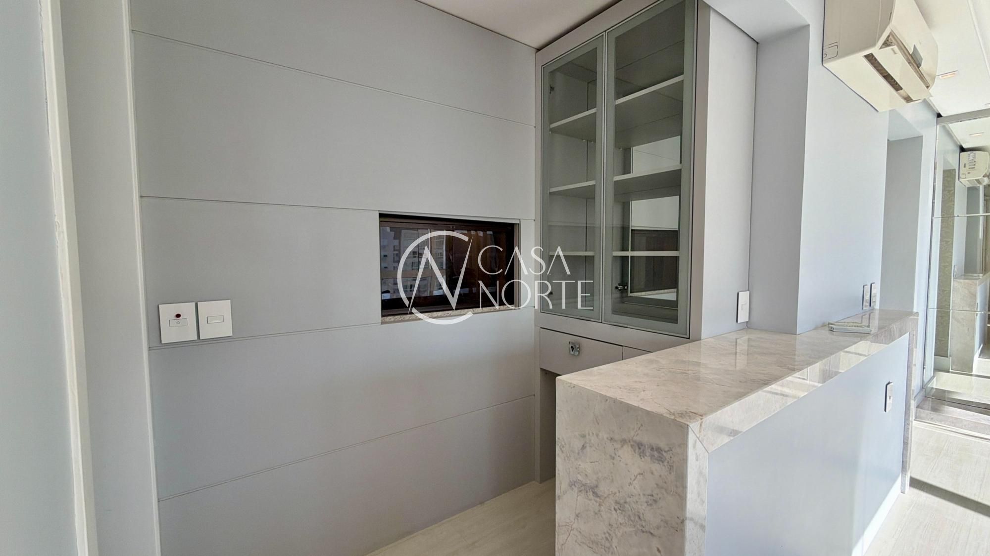 O espaço gourmet com churrasqueira se integra ao living, criando aquele ambiente que funciona tanto para encontros especiais quanto para a rotina. O apartamento ainda conta com lavabo, gabinete, cozinha com móveis planejados, área de serviço independente, banheiro de serviço e entrada de serviço separada — detalhes que fazem diferença para quem valoriza organização e funcionalidade.