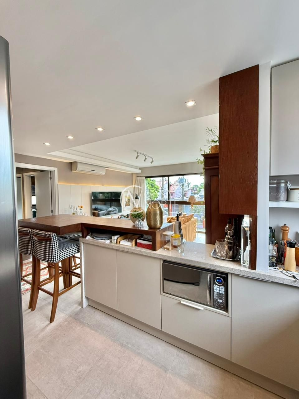 A cozinha em conceito aberto é um verdadeiro destaque, equipada com marcenaria planejada, bancada sofisticada e um elegante espaço gourmet com churrasqueira, ideal para quem aprecia praticidade aliada ao design.