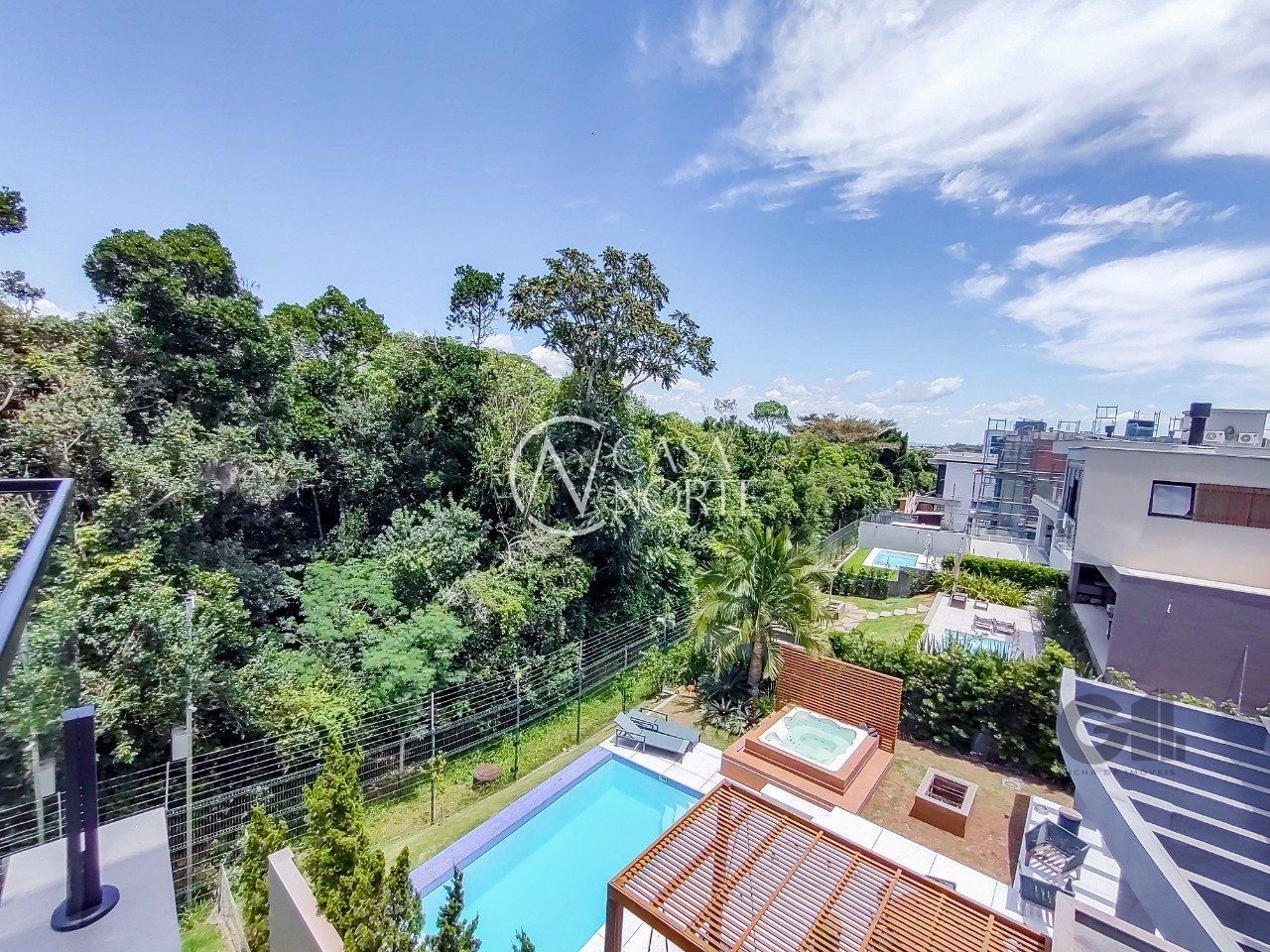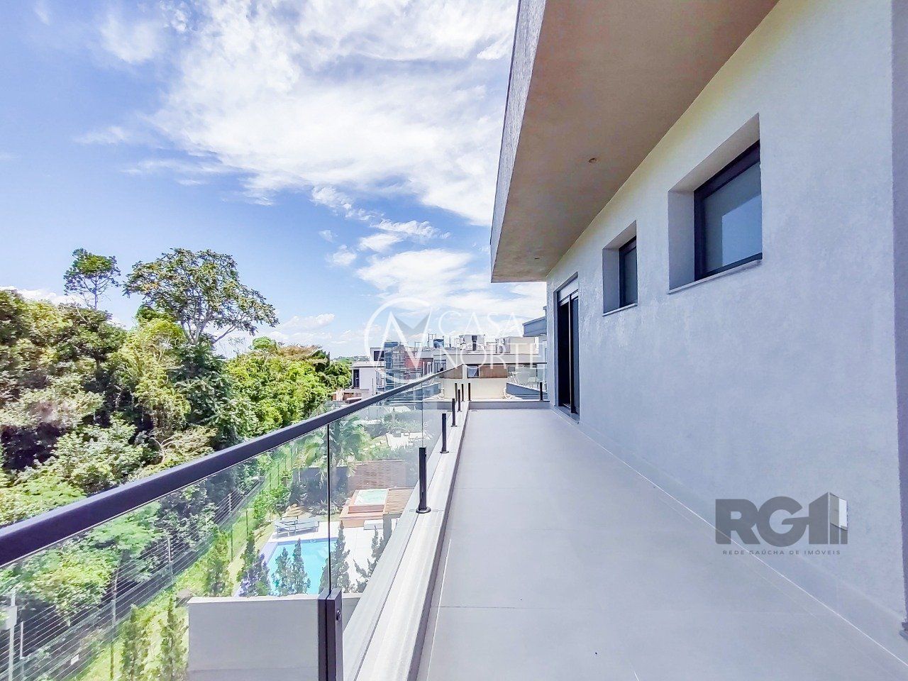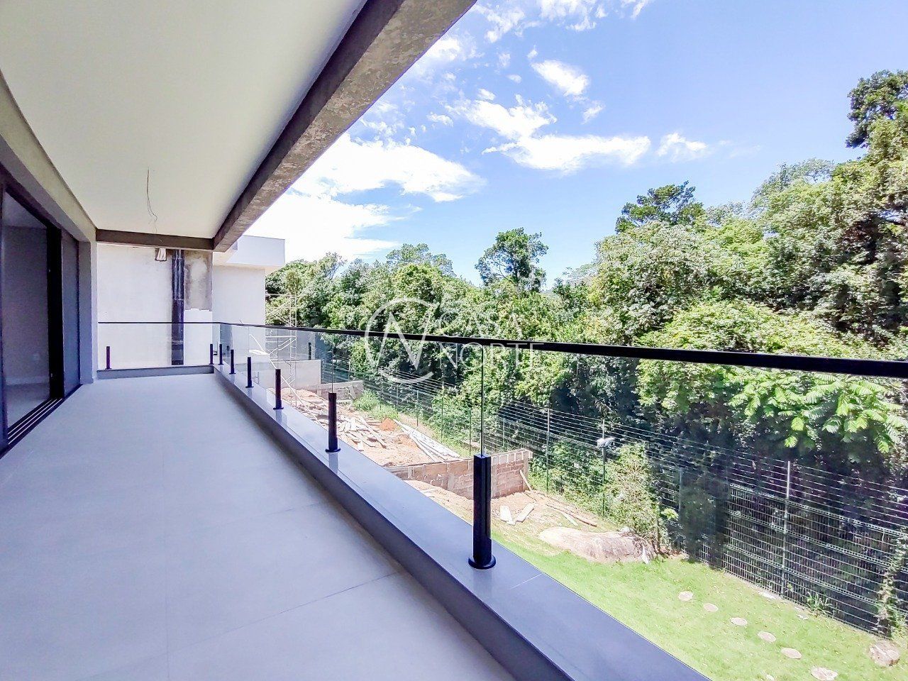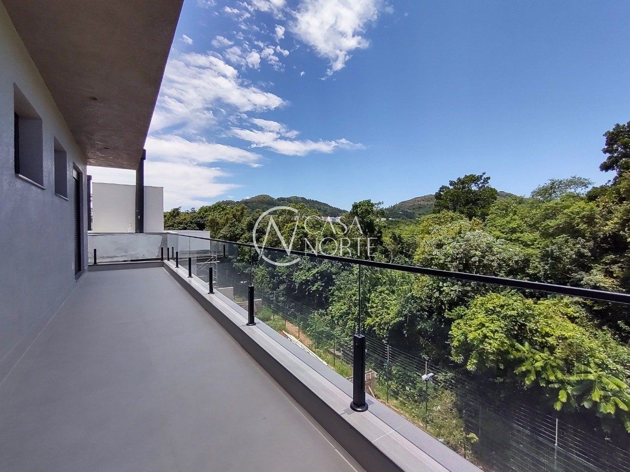 Parte superior são 3 suítes, sendo uma máster voltada para a área de preservação, com closet e sacada interligando à 2ª suíte. 3ª suíte voltada para frente com terraço amplo,