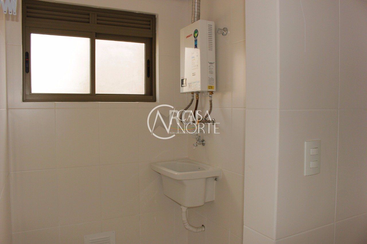 O apartamento possui área privativa de 56,67m² úteis, dois dormitórios, sendo um deles suíte, uma vaga de garagem, living espaçoso ideal para dois ambientes, banheiro social e banheiro na suíte. A cozinha é equipada com balcão e armário aéreo, e a área de serviço é integrada à cozinha. O piso laminado está presente na sala e nos dormitórios, conferindo elegância e praticidade aos ambientes.