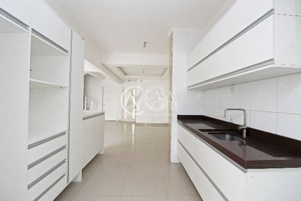 A cozinha é montada em conceito aberto, integrada à área social, além de lavanderia fechada.