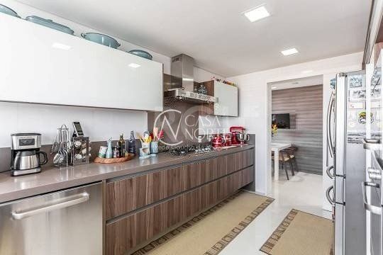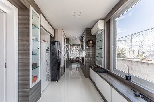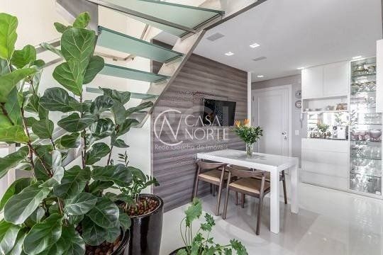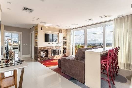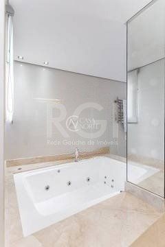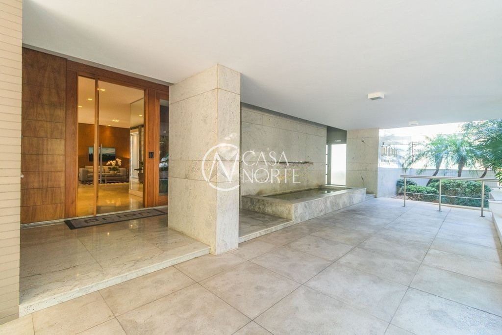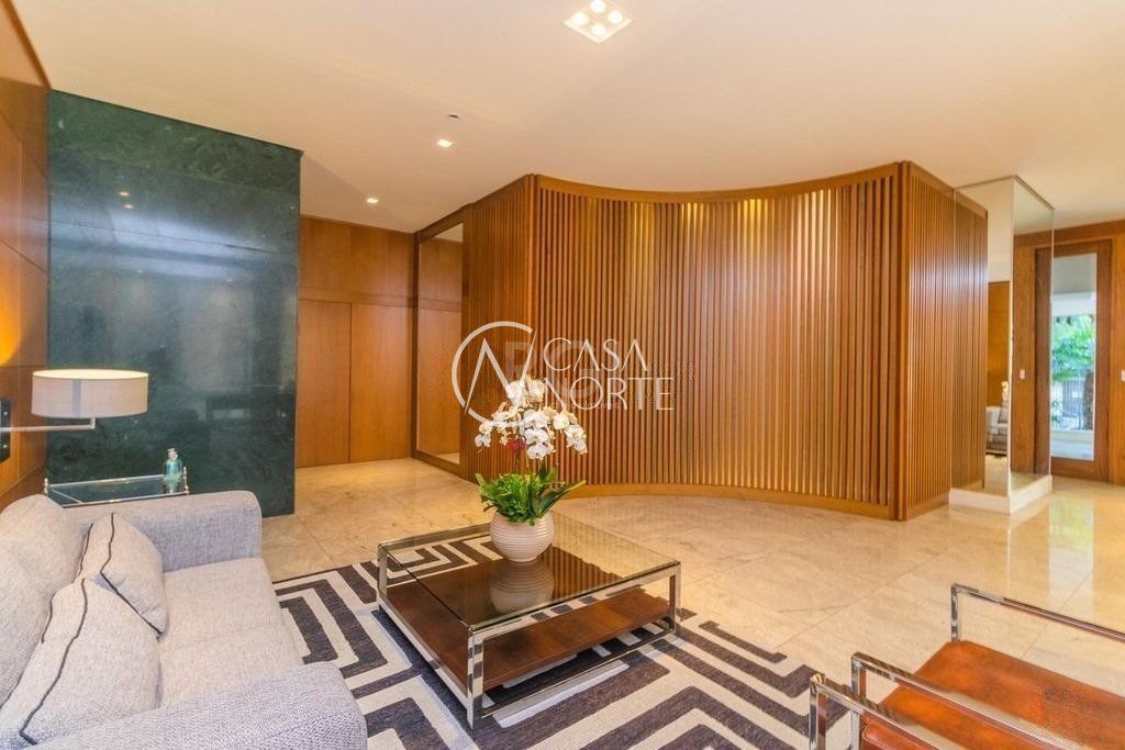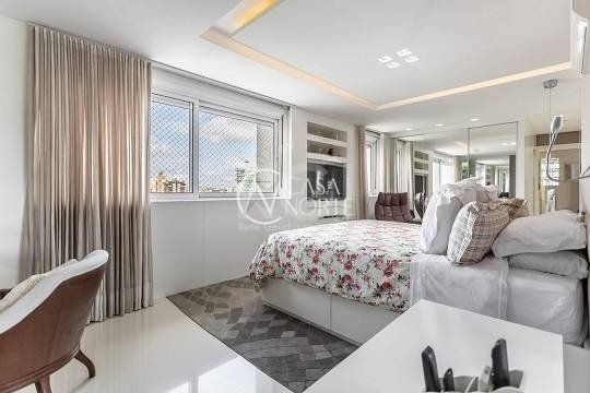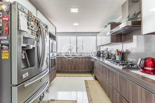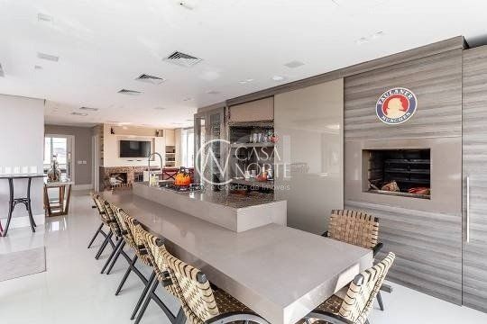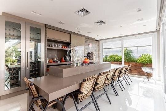 No pavimento superior estão mais 2 suítes, cozinha completa, estar com lareira e janta, ótimo espaço gourmet com adega, bancada com churrasqueira que fica interligado com um belo terraço com jacuzzi. Todos os ambientes possuem climatização, ficam todos os itens eletrônicos e eletrodomésticos. O imóvel conta com 7 vagas de garagem individuais e amplo depósito privativo.