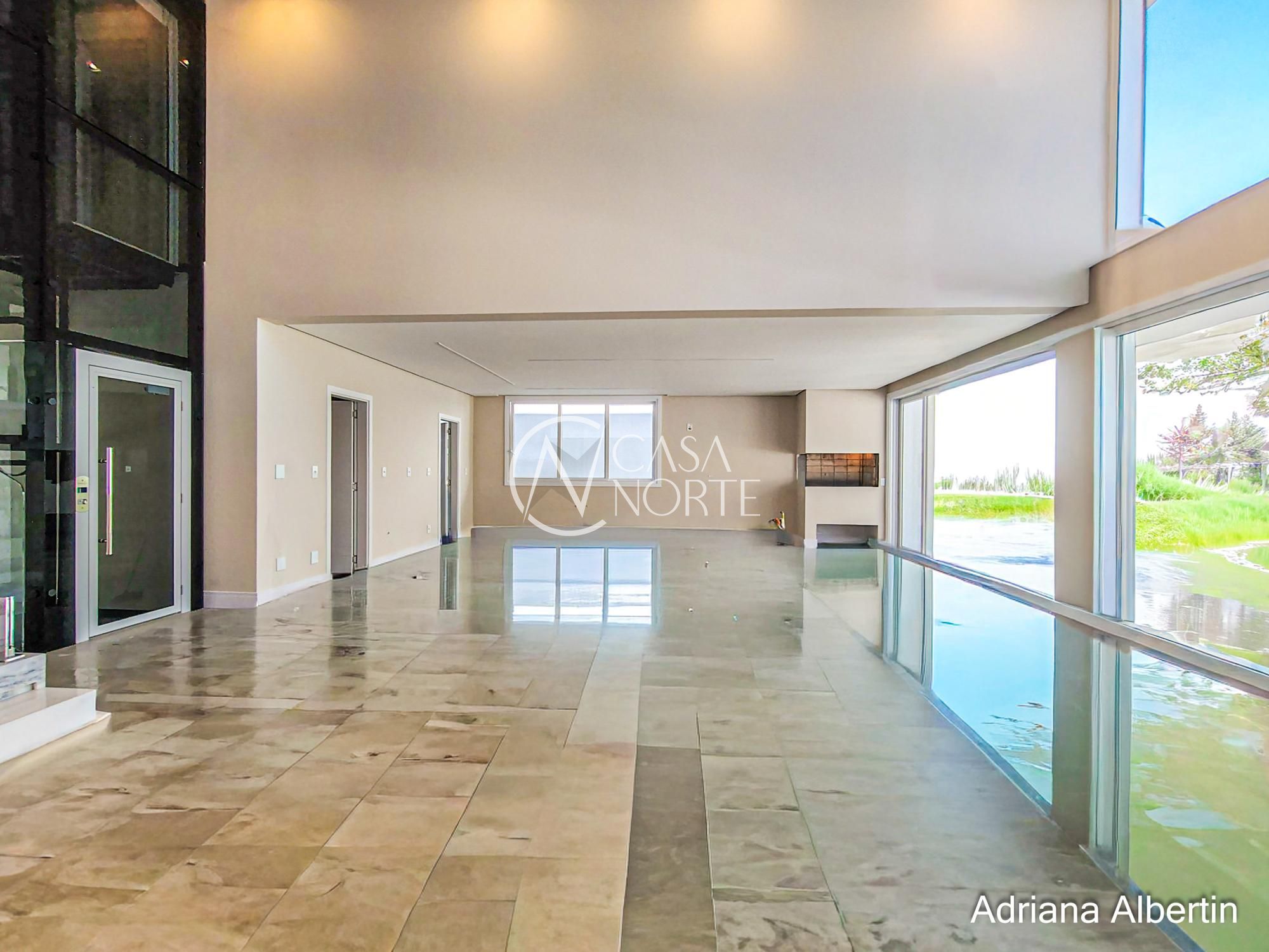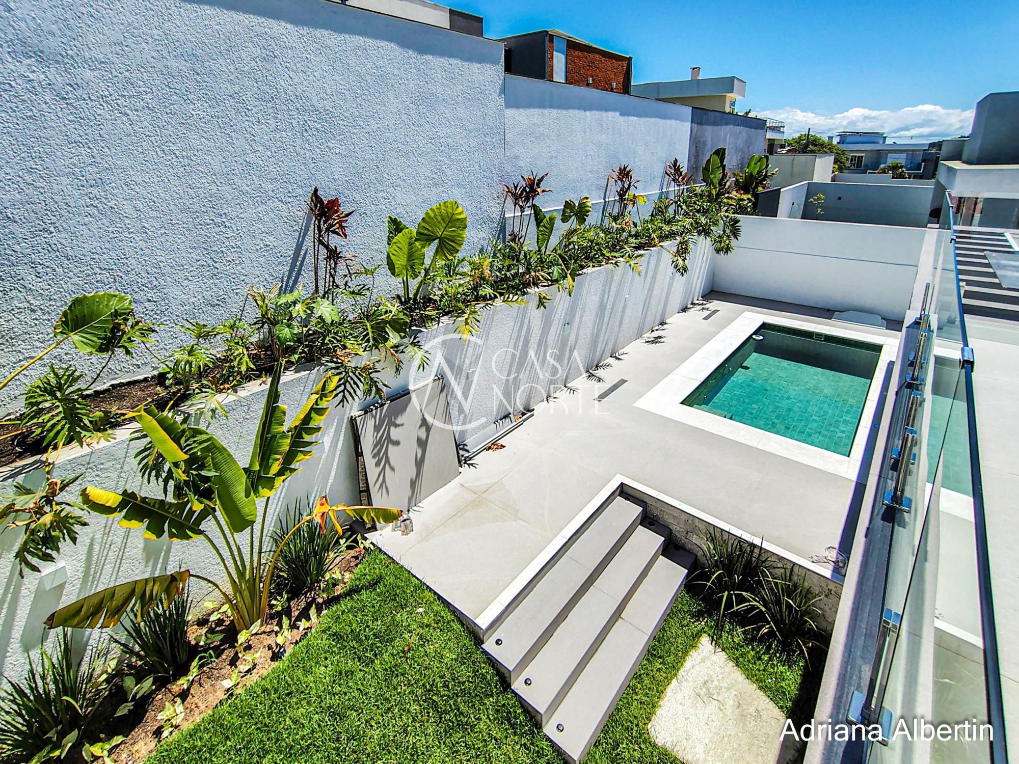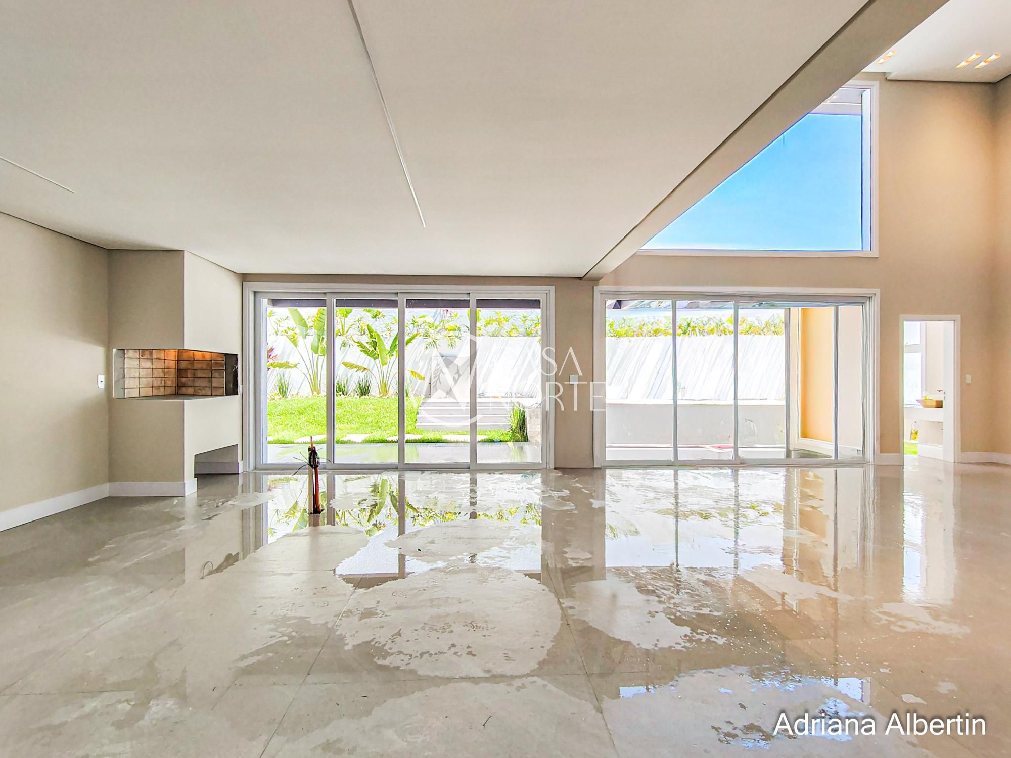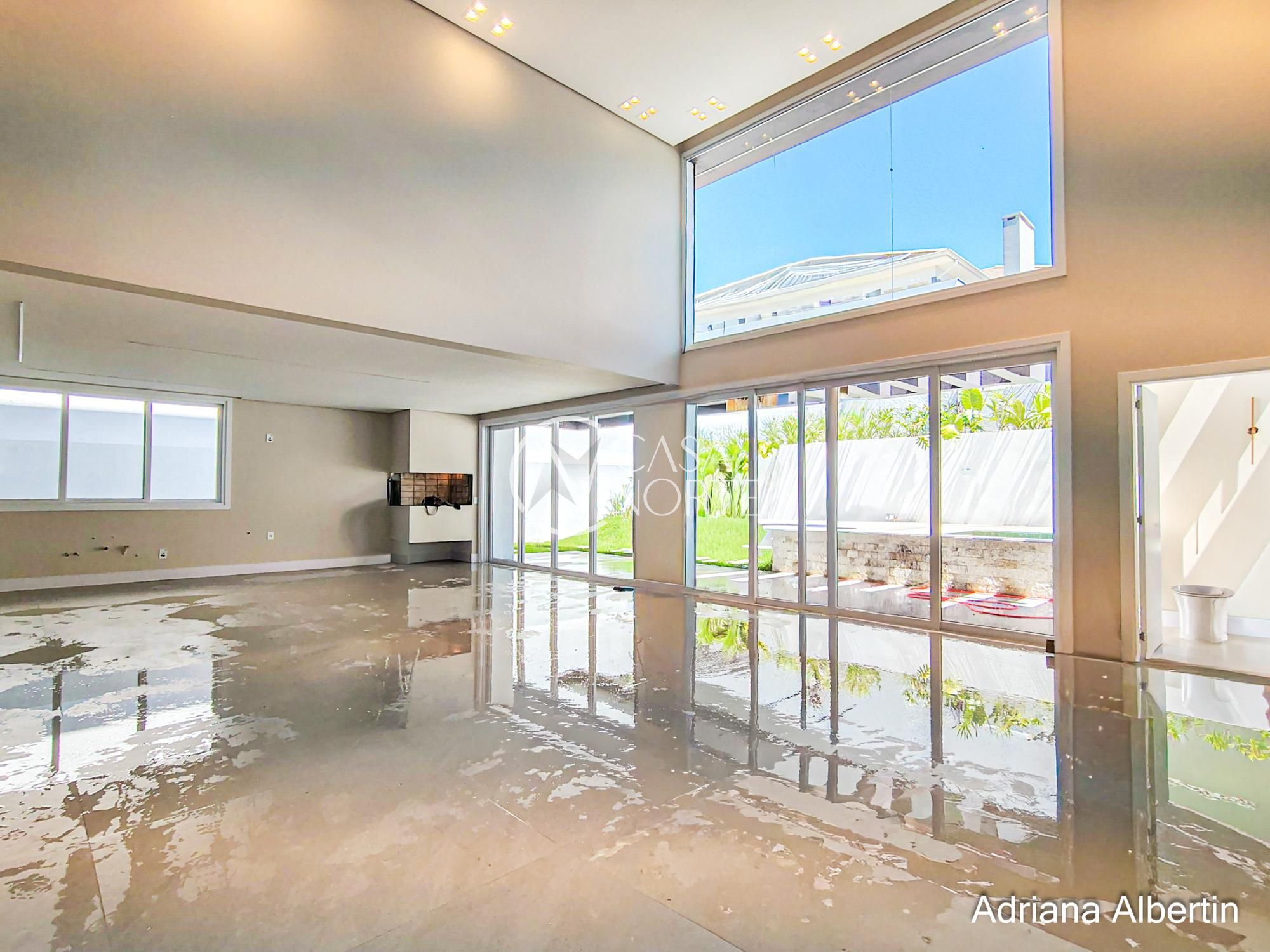 Parte inferior composta por living, sala de jantar, espaço gourmet integrados, lavanderia, despensa, lavabo, pátio com piscina, garagem coberta para três carros.