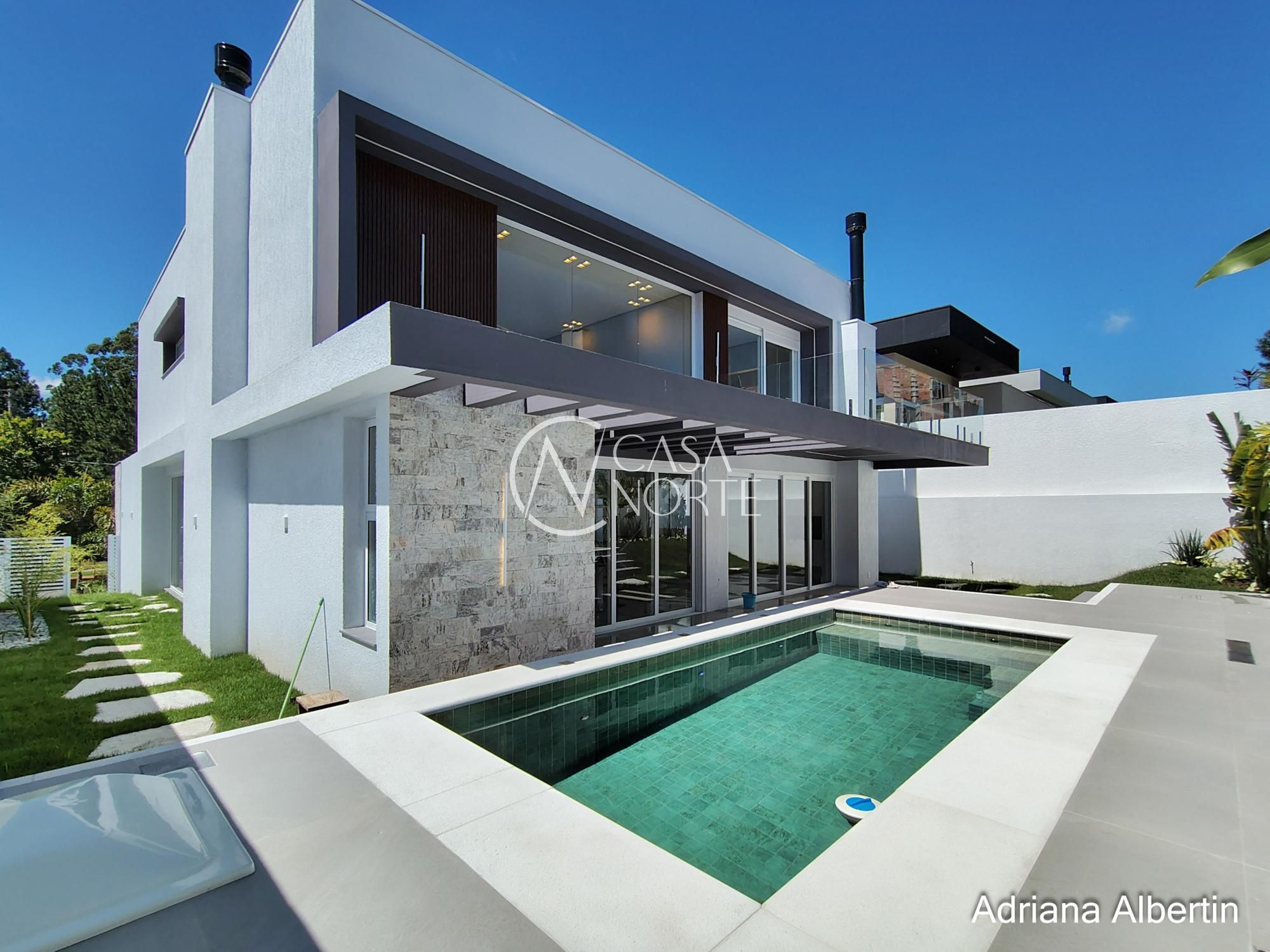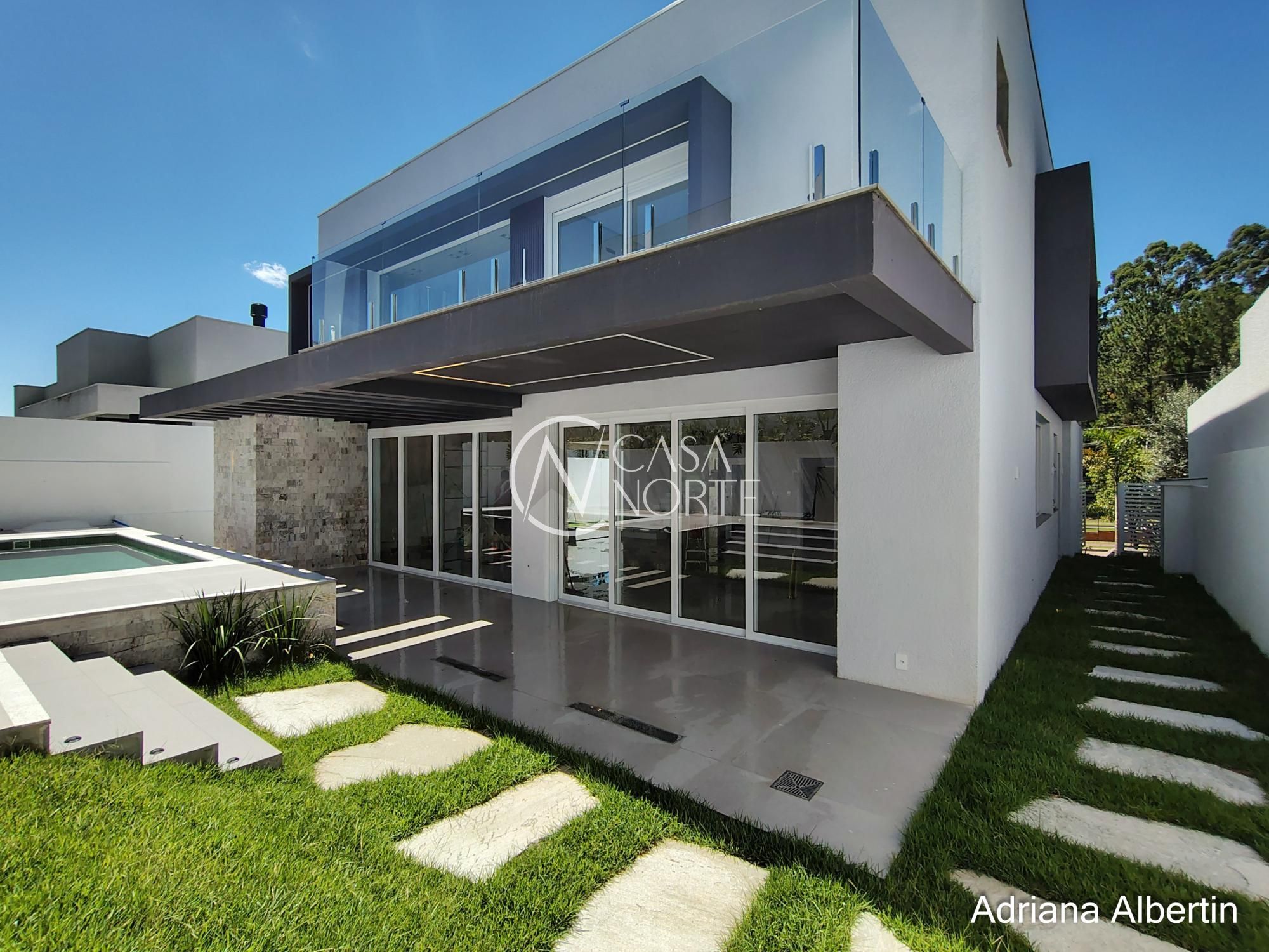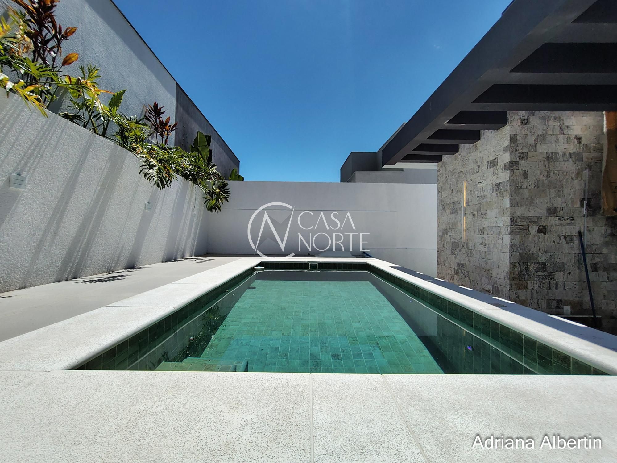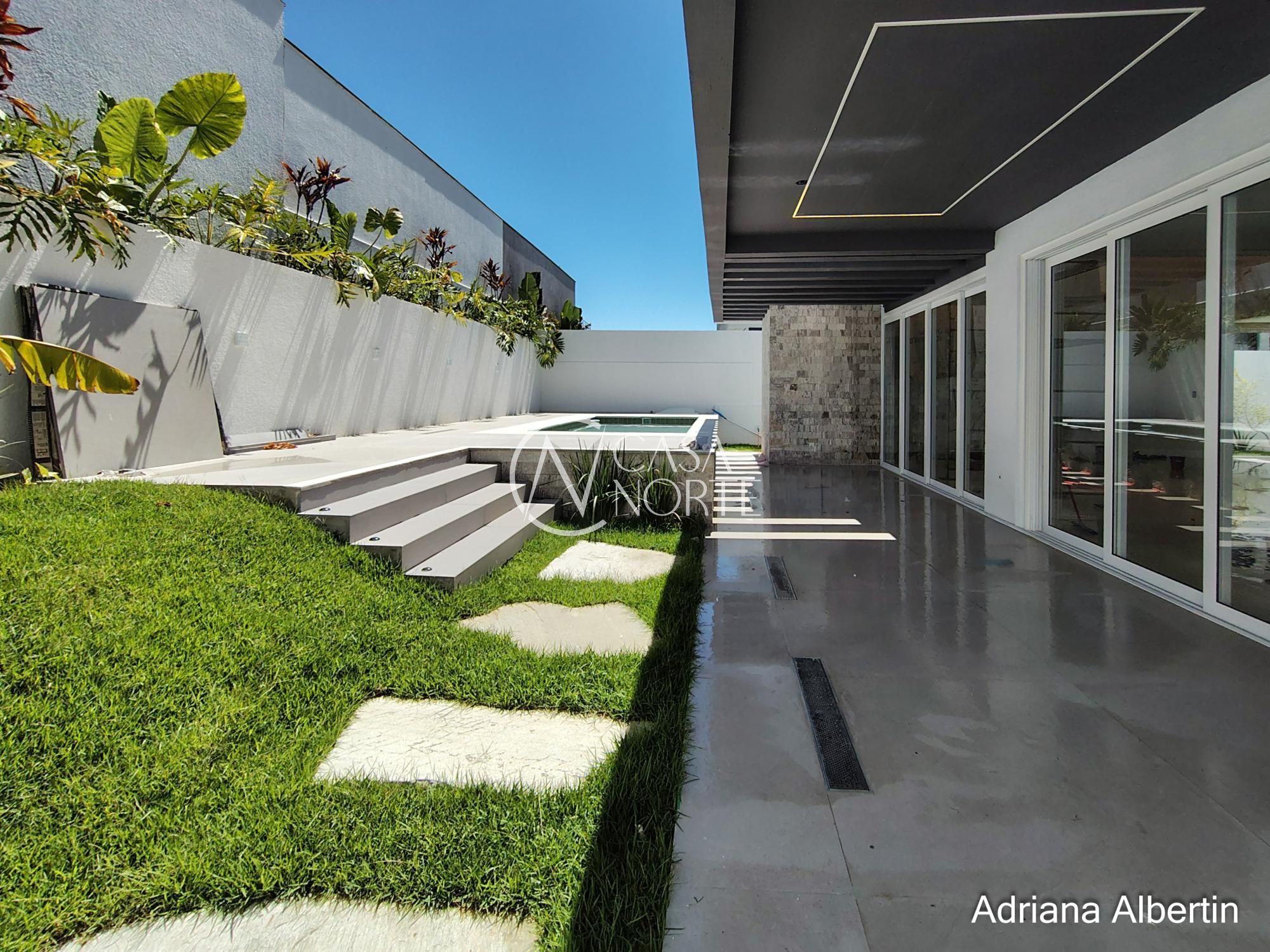 Parte inferior composta por living, sala de jantar, espaço gourmet integrados, lavanderia, despensa, lavabo, pátio com piscina, garagem coberta para três carros.