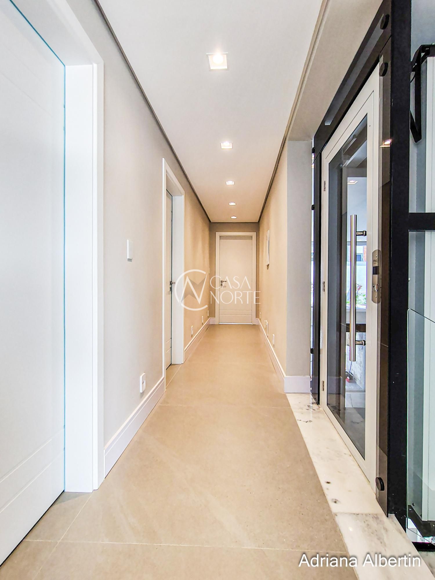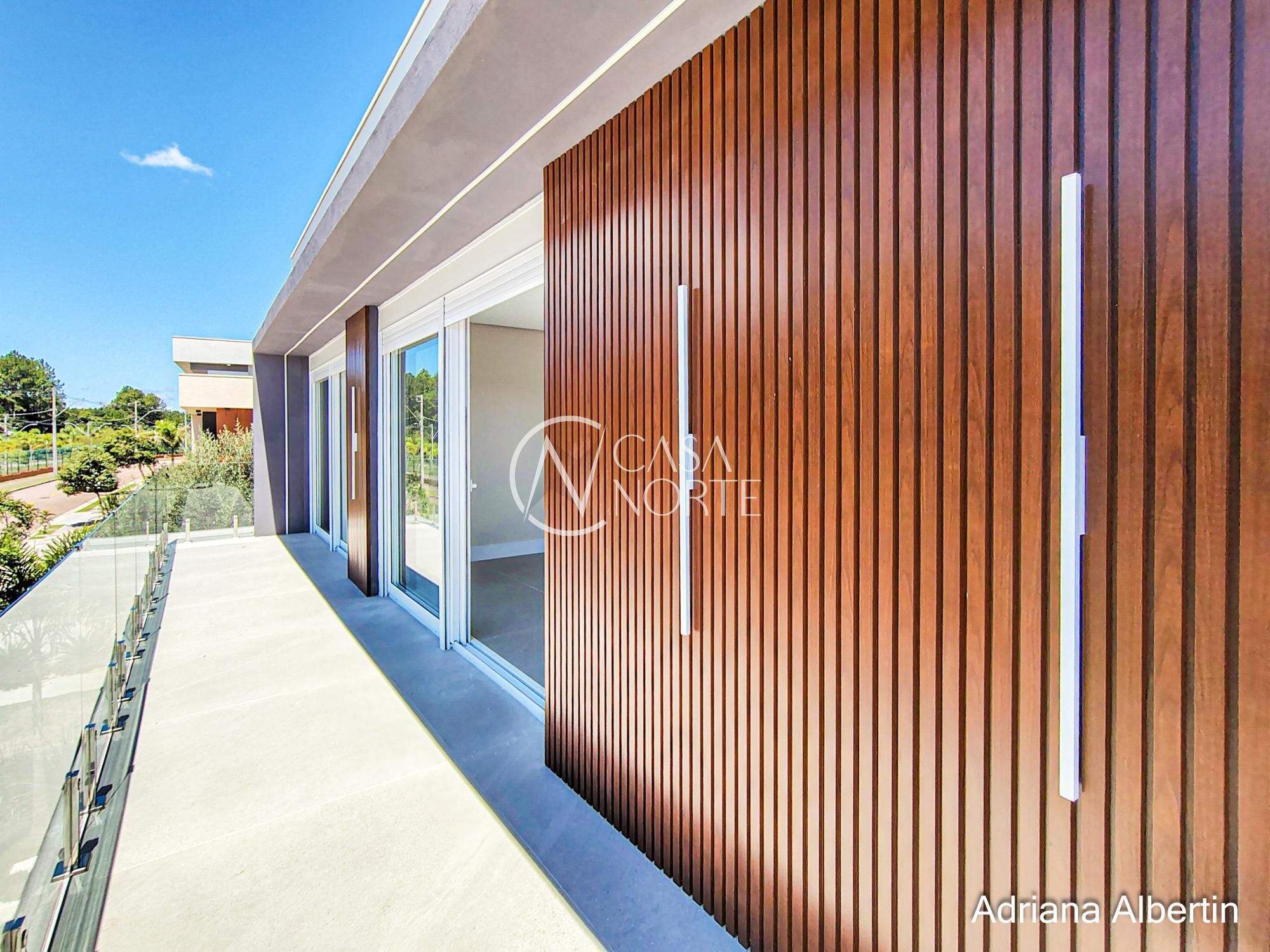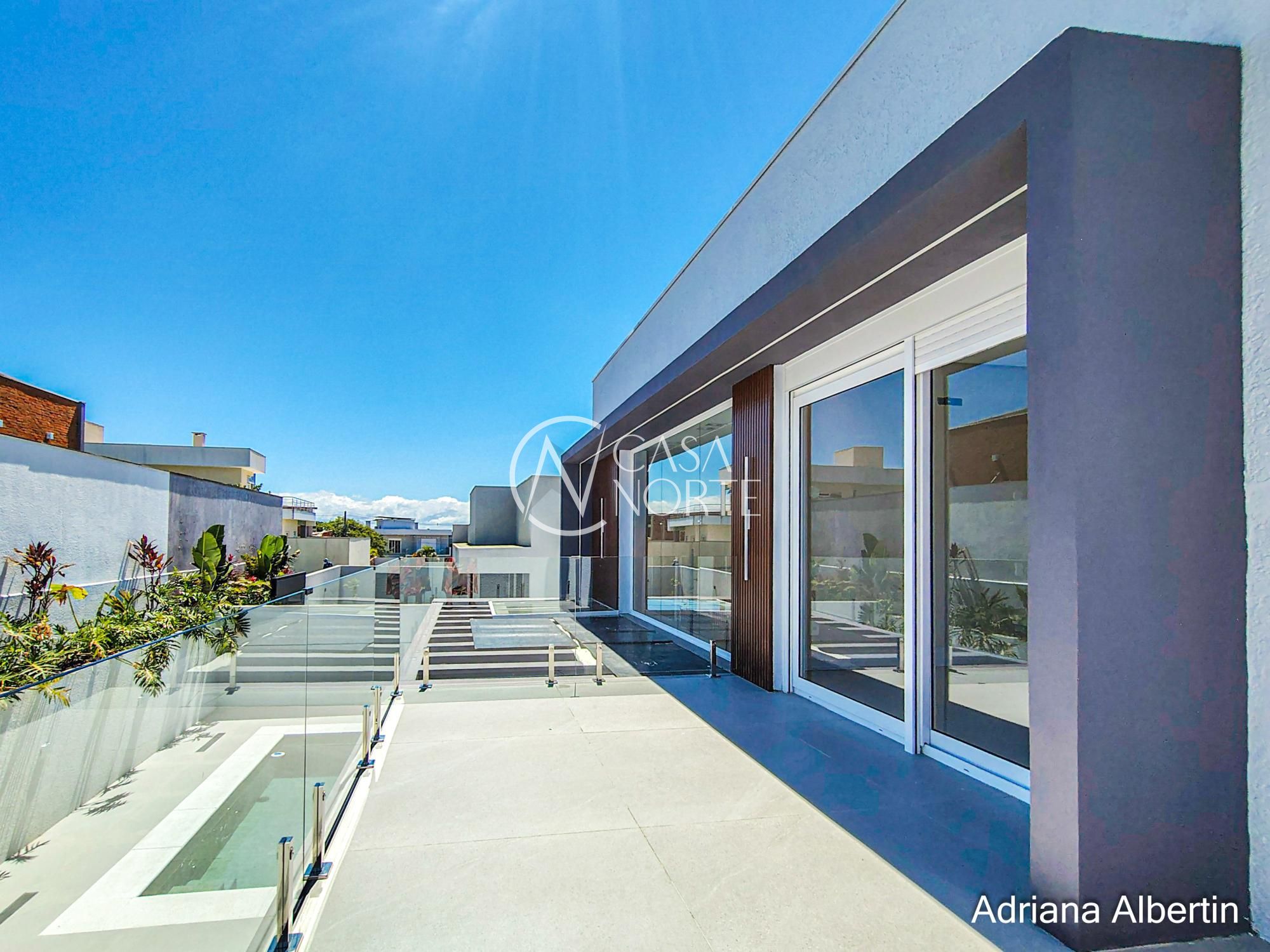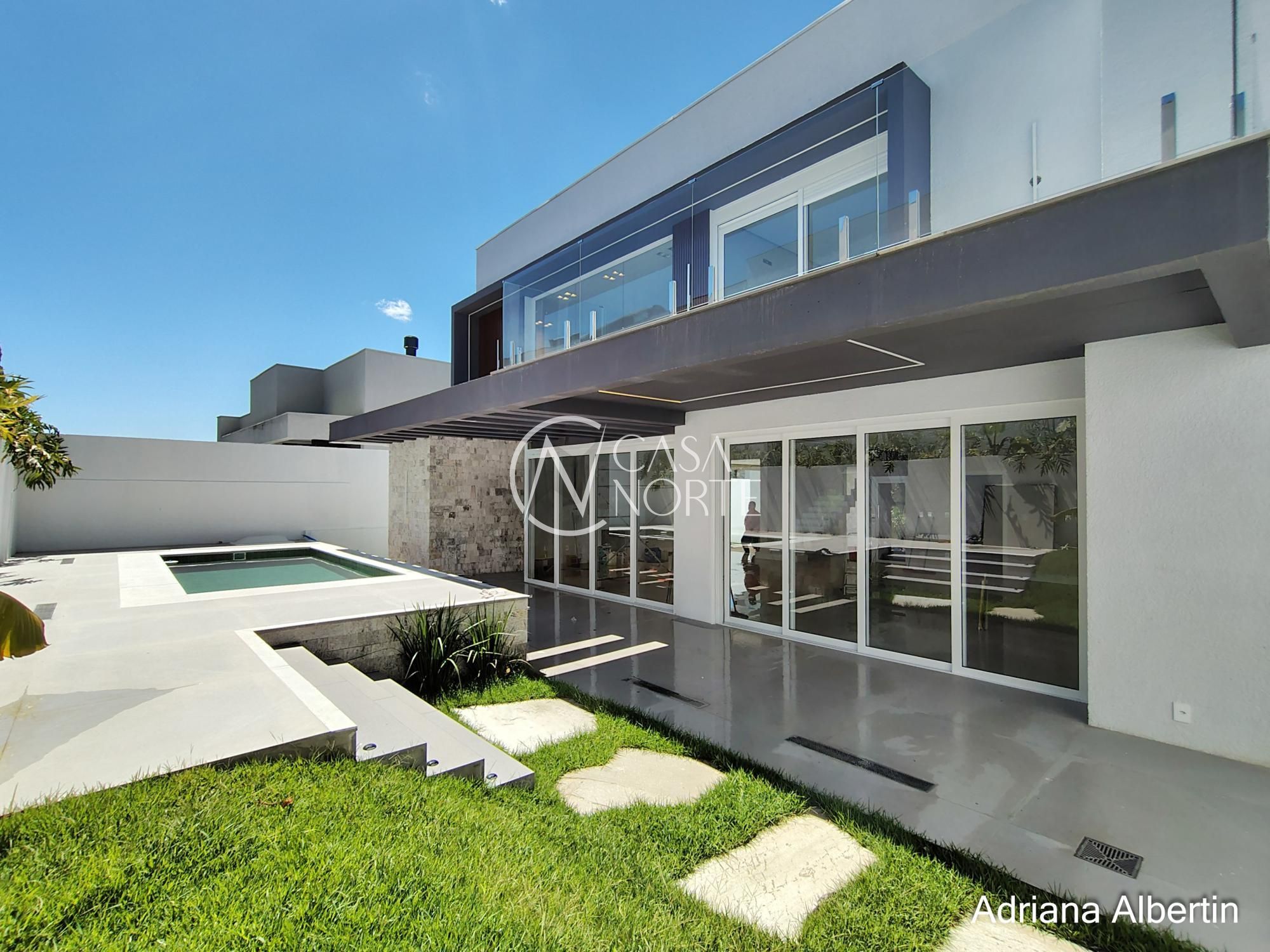 Parte inferior composta por living, sala de jantar, espaço gourmet integrados, lavanderia, despensa, lavabo, pátio com piscina, garagem coberta para três carros.