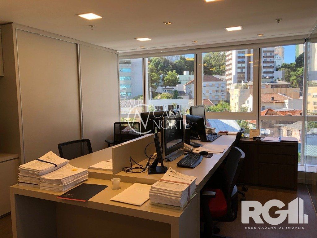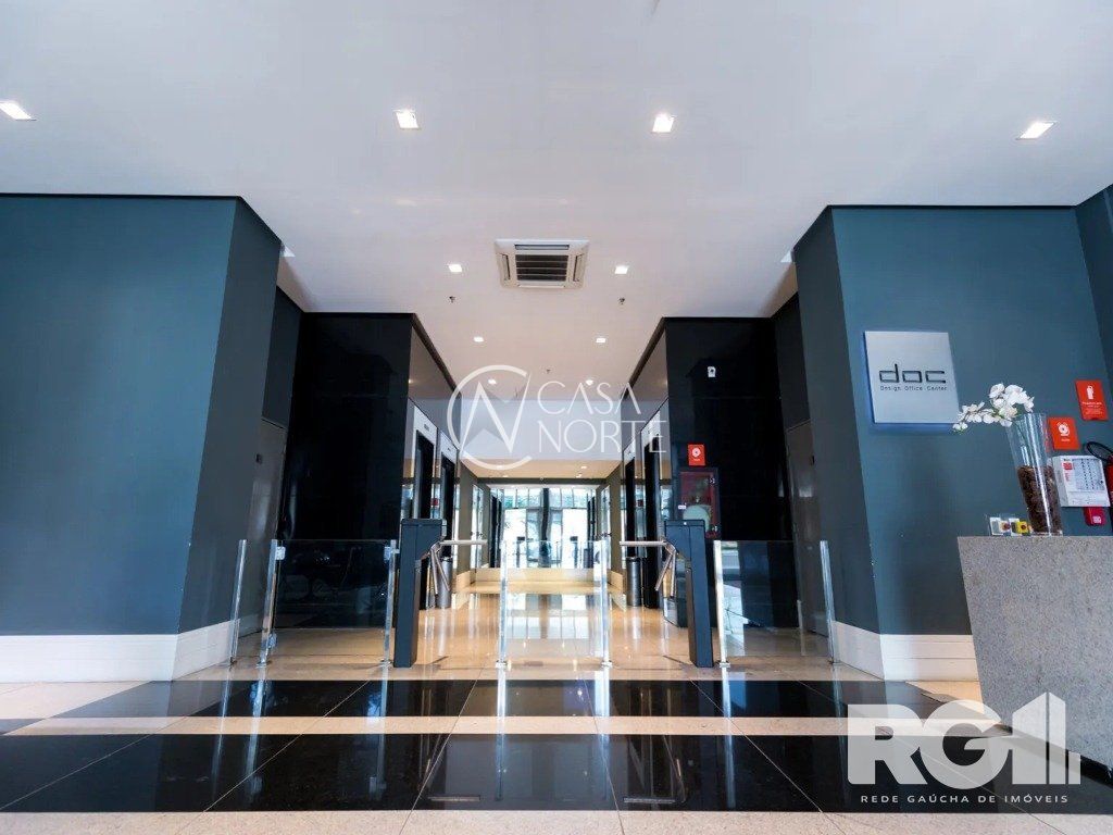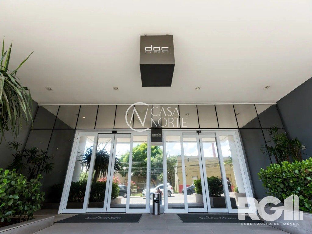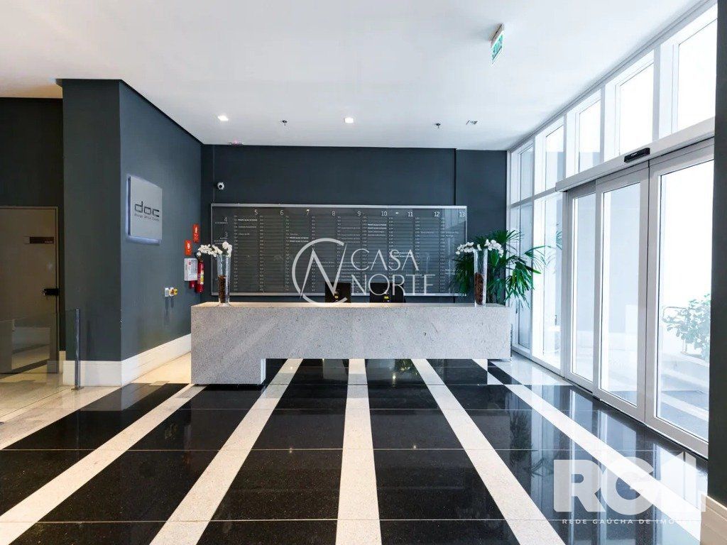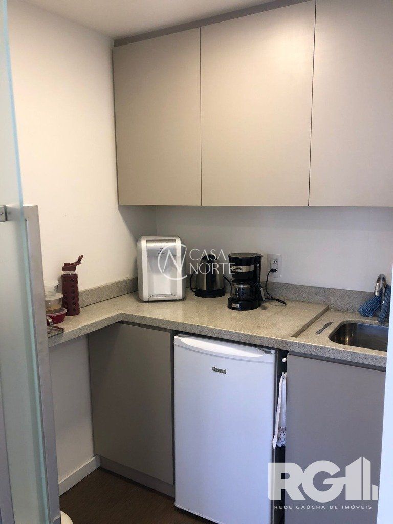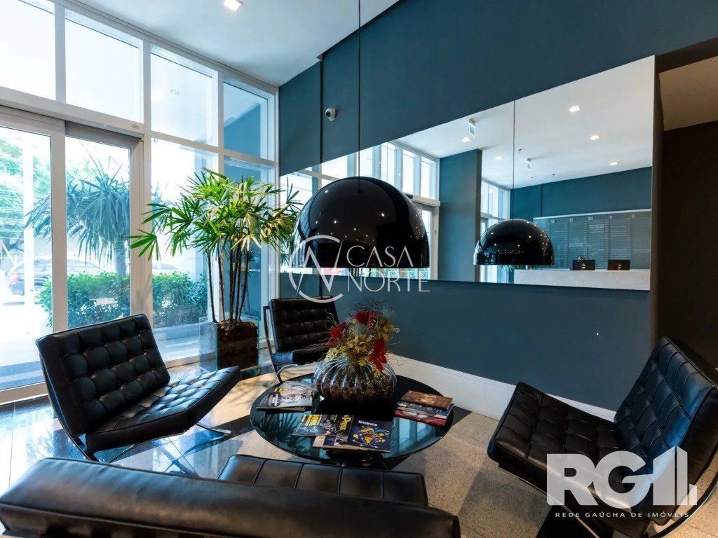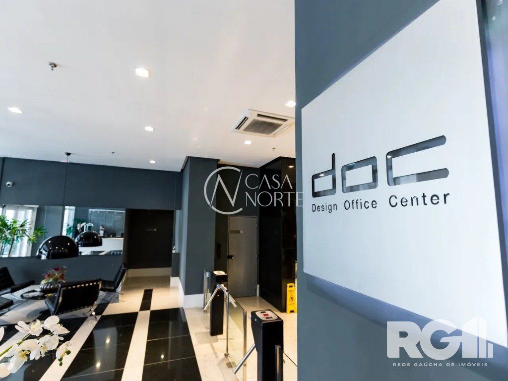 A sala possui um banheiro montado e decorado e janelões em duas faces, além de ter uma vaga