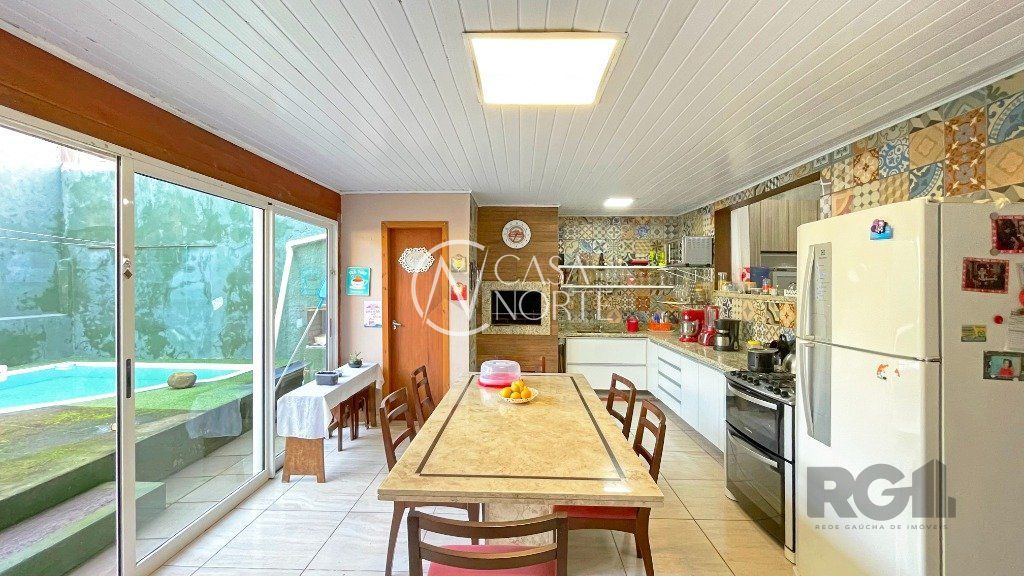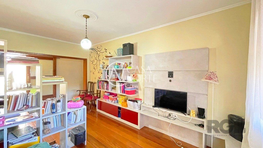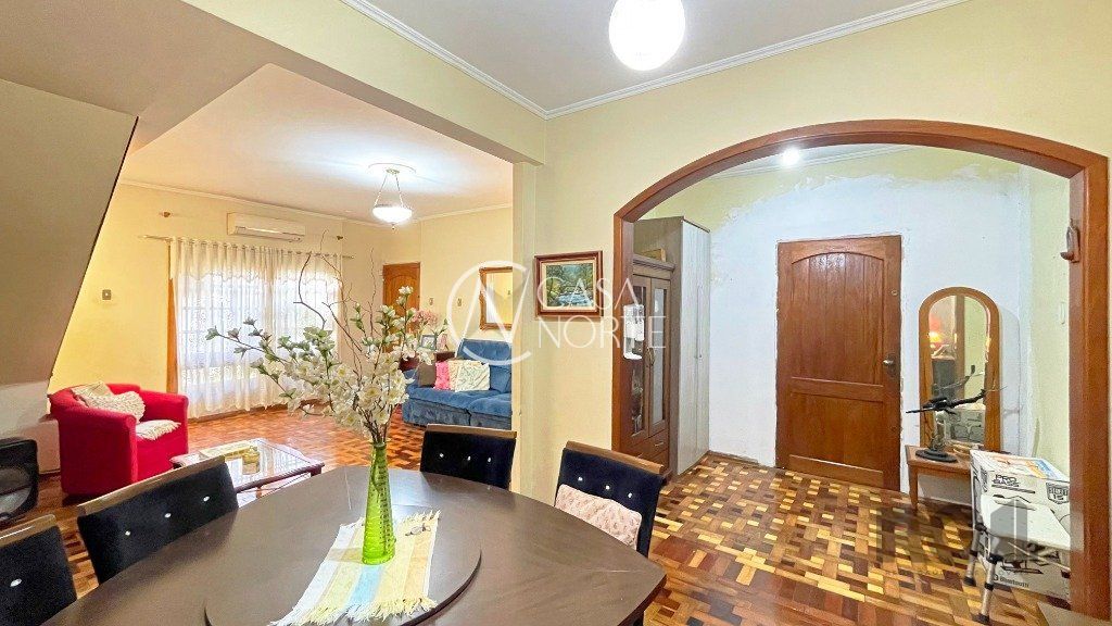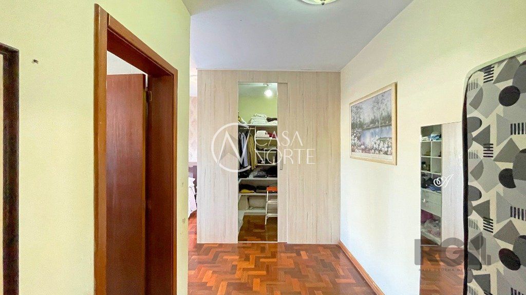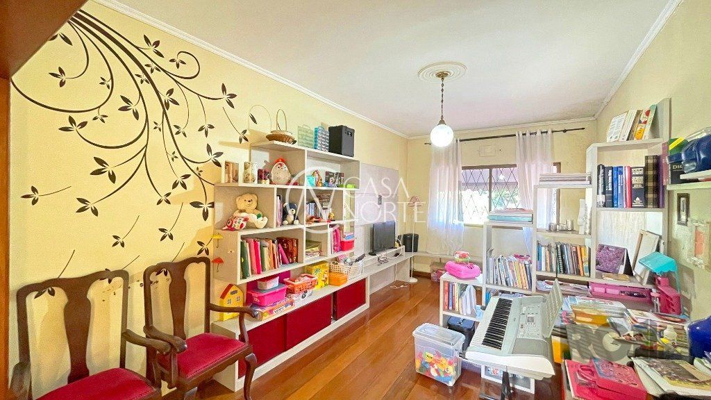 Na parte inferior, há um living com dois ambientes, copa-cozinha, lavabo, 1 suíte com sacada e closet e uma edícula com banheiro social, que pode ser utilizada como escritório. O pátio conta com churrasqueira e piscina. Na parte superior, encontram-se 3 dormitórios, banheiro social e sala de TV.