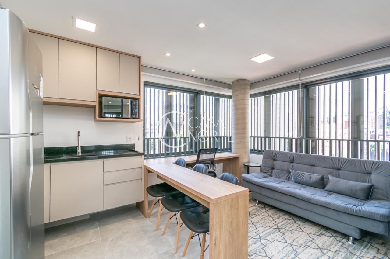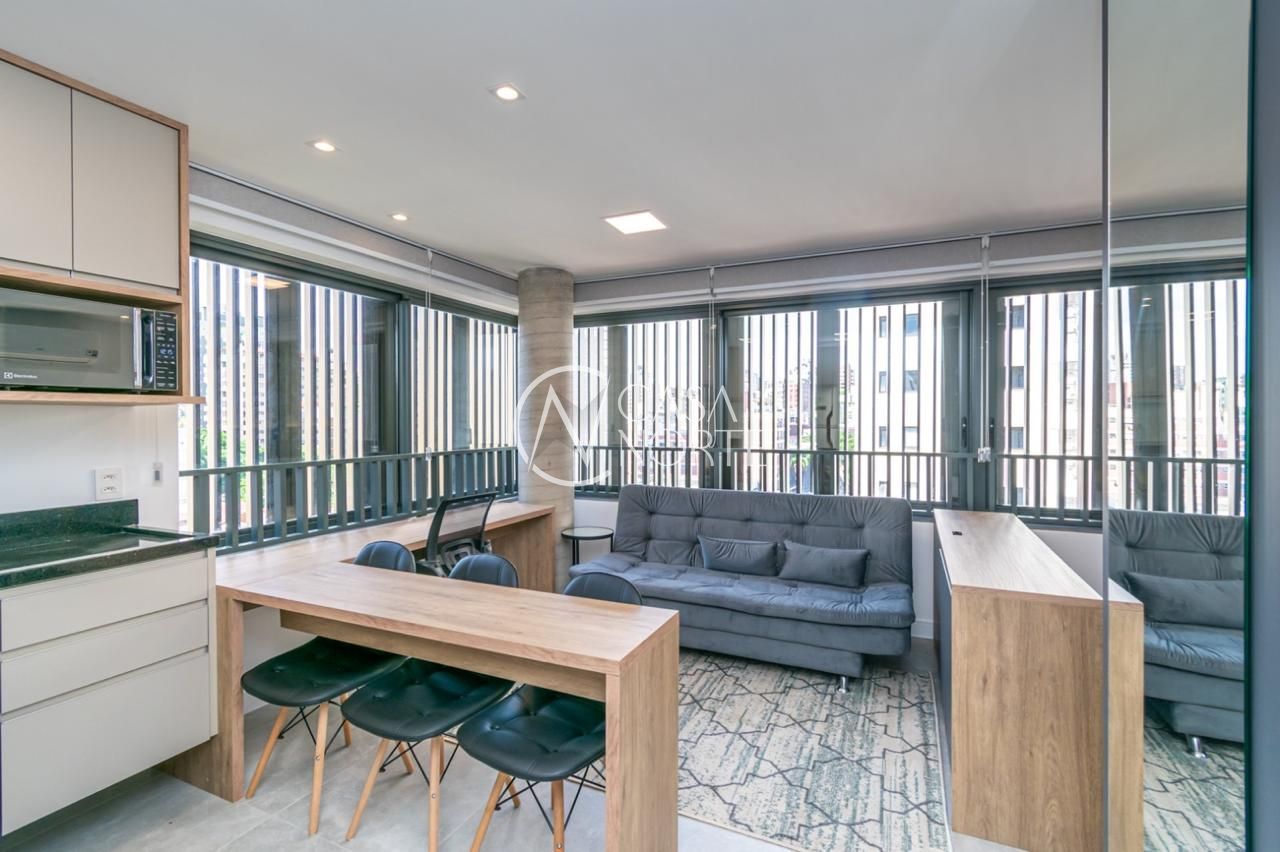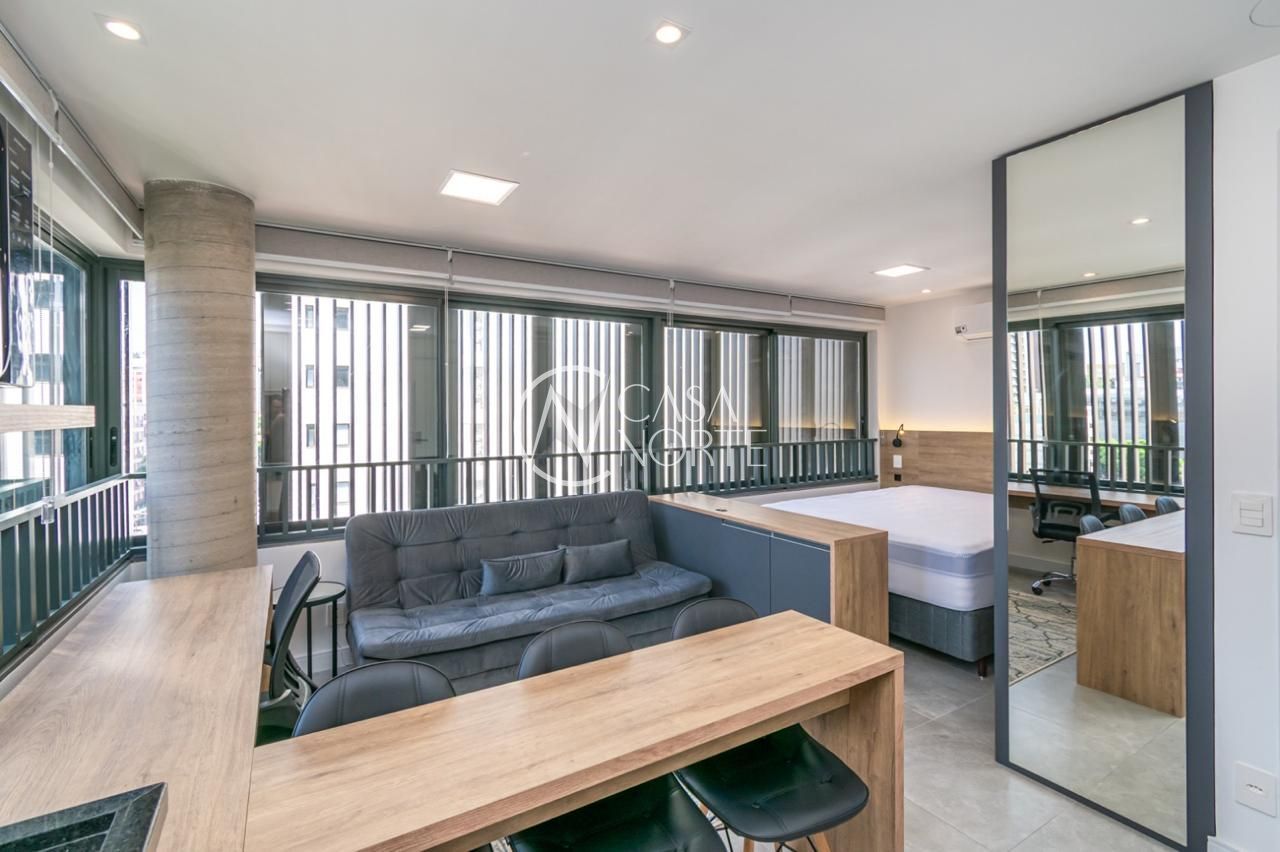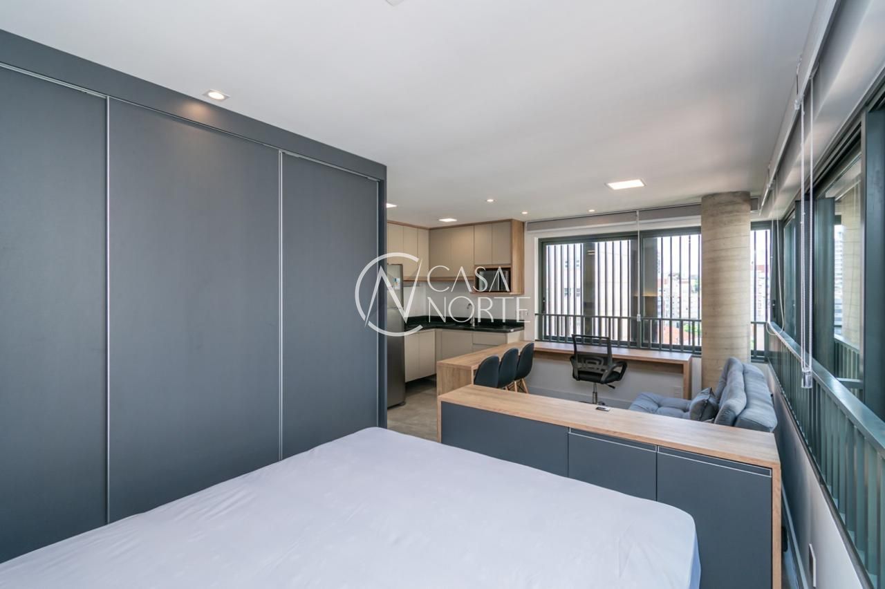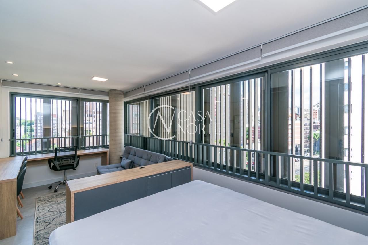 Loft de alto padrão construtivo no bairro Moinhos de Vento, planta de 30 m2 privativos com porcelanato, forro em gesso e aberturas em alumínio com vidros duplos.