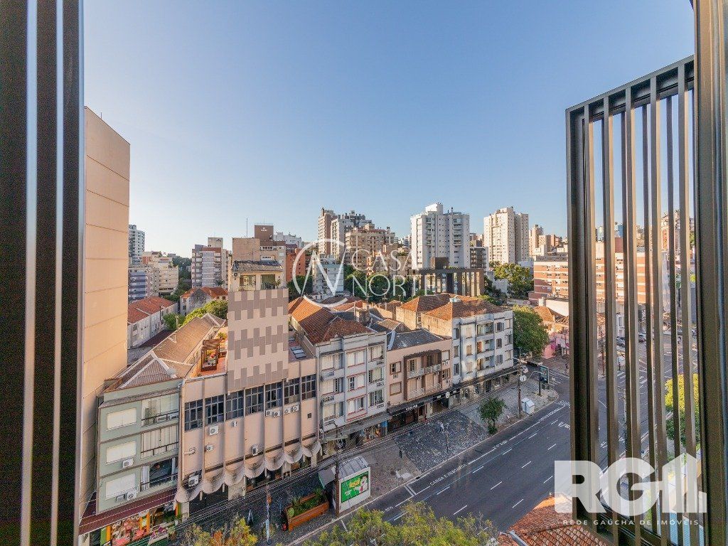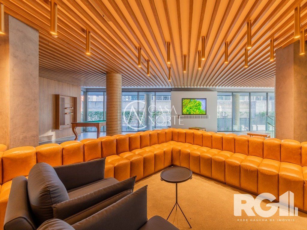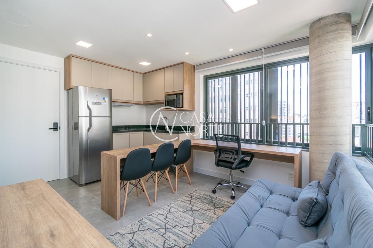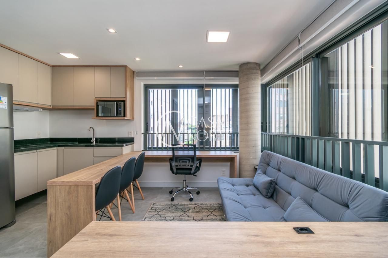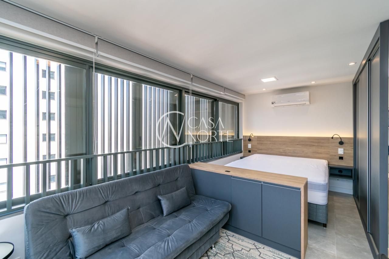 Loft de alto padrão construtivo no bairro Moinhos de Vento, planta de 30 m2 privativos com porcelanato, forro em gesso e aberturas em alumínio com vidros duplos.