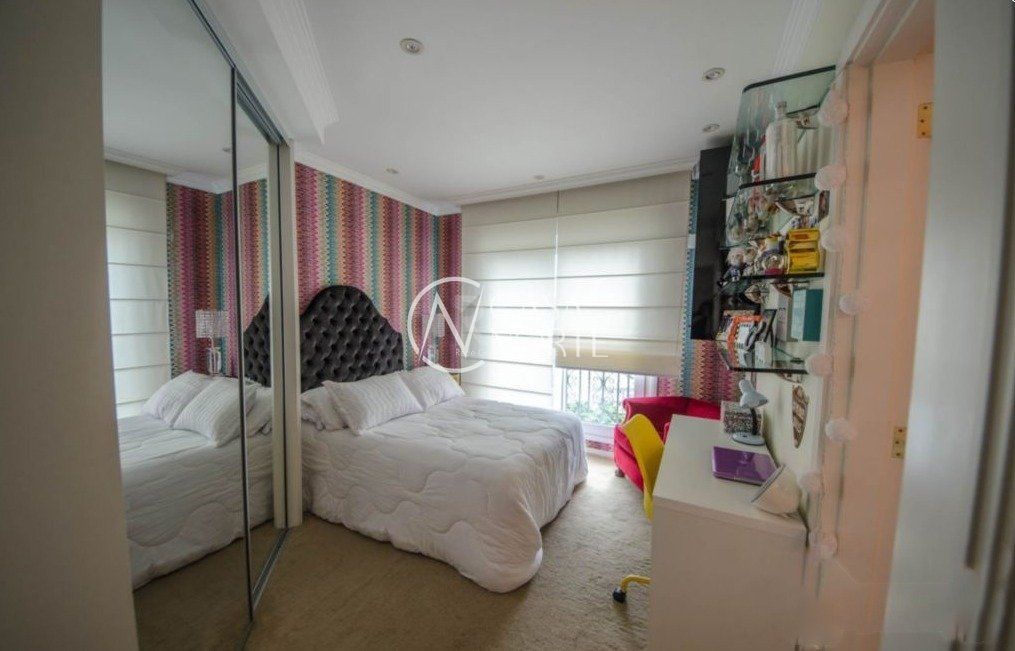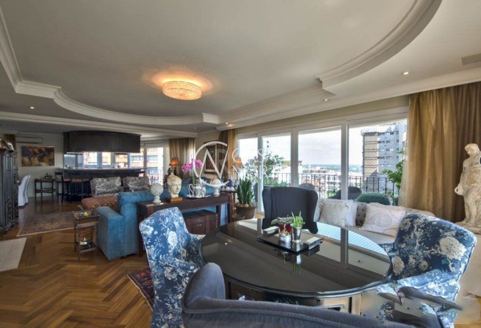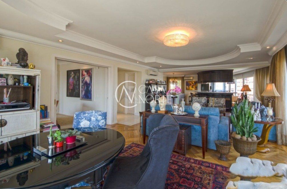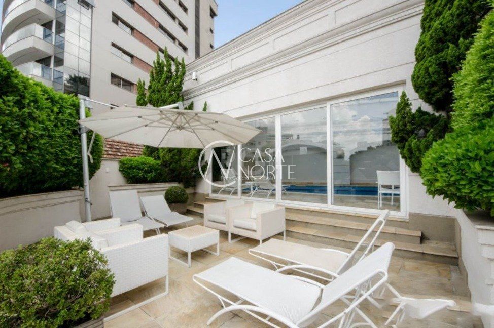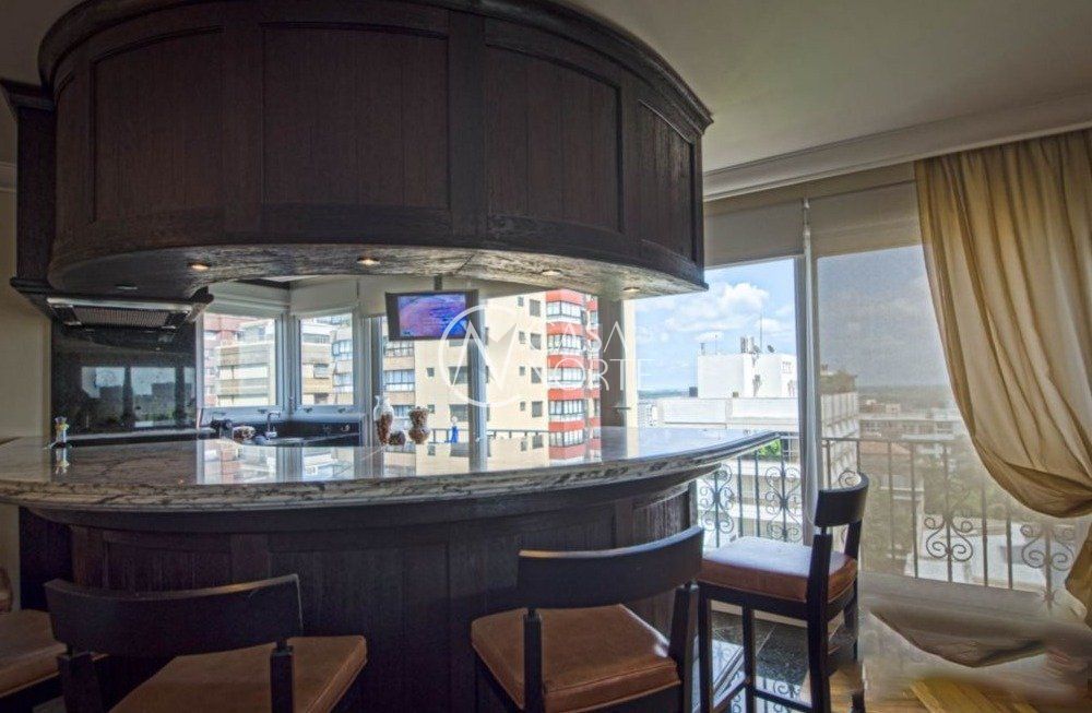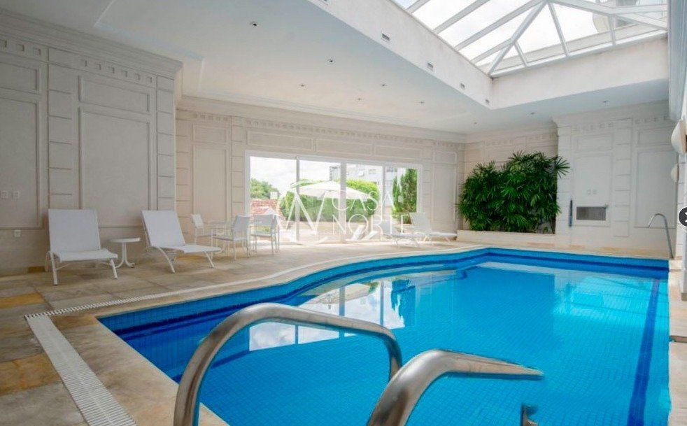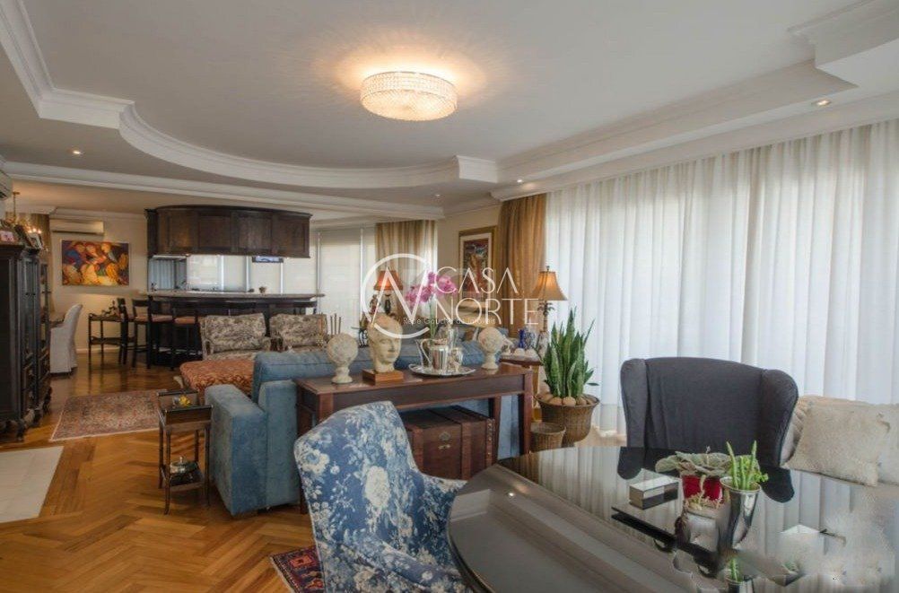 Semi mobiliado! Luxuoso apto na rua mais charmosa do bairro. Vista deslumbrante, andar alto. Hall de entrada, 3 suítes (master c/ closet e hidro), lavabo, living 5 ambientes c/ lareira e piso em parquet, espaço churrasco, gabinete, estar íntimo c/ sacada, cozinha/copa montada, lavanderia, despensa e dependência completa de empregada. Prédio c/ salão de festas, fitness, segurança 24h, zelador, gerador próprio, piscina aquecida, garagem para 4 carros, depósito, terraço coletivo c/ vista de 360°, jardins e elevador.