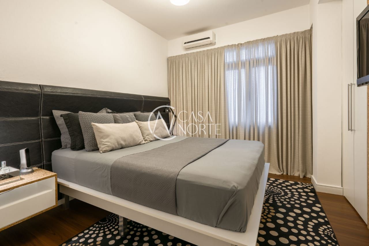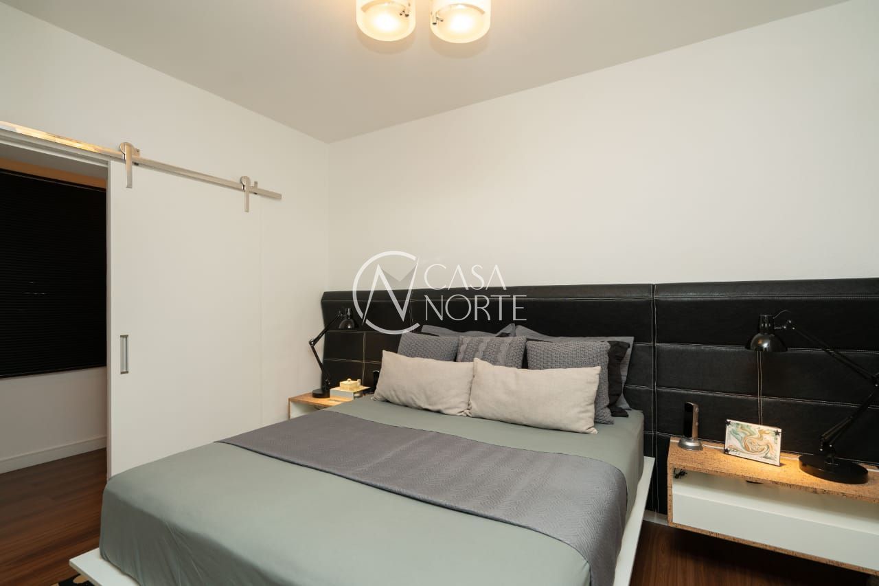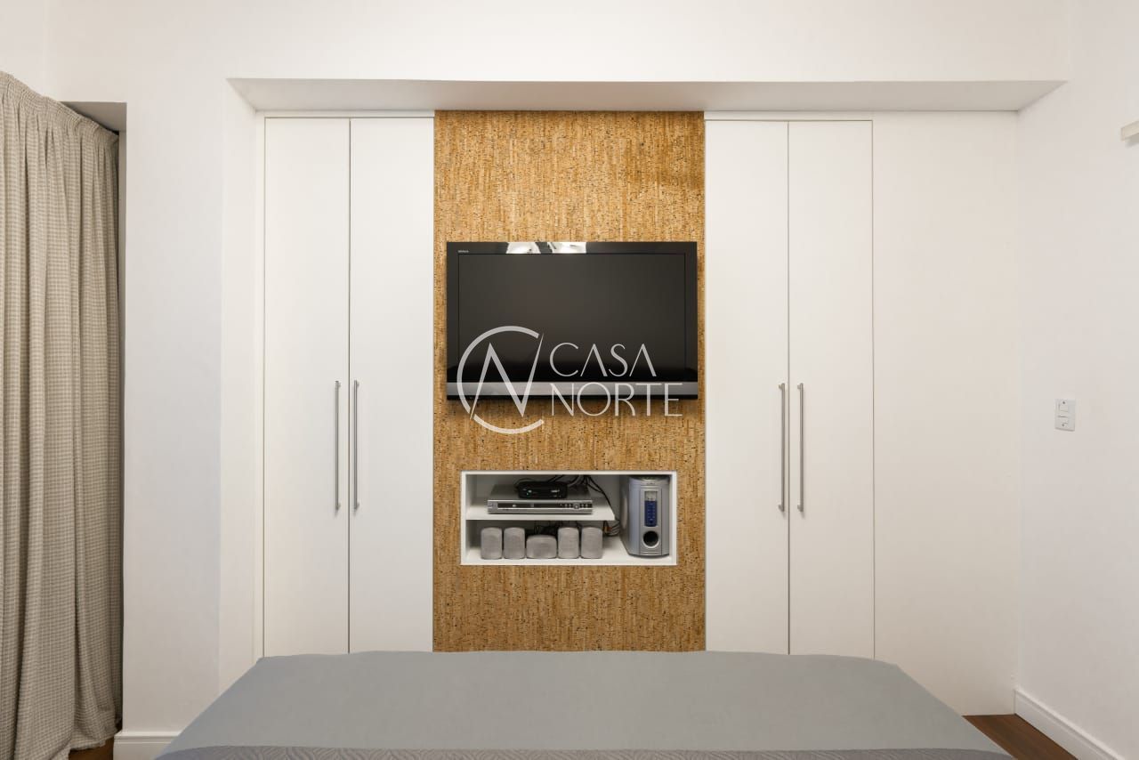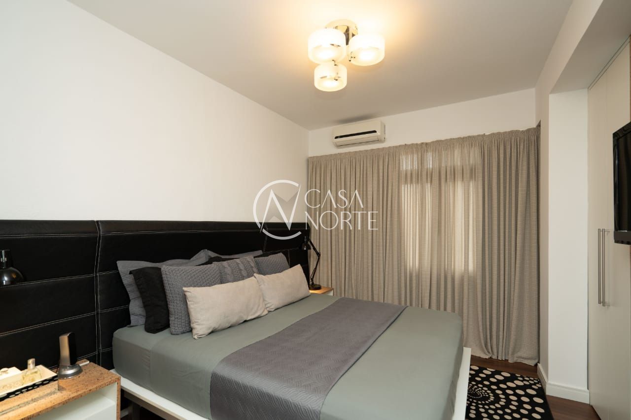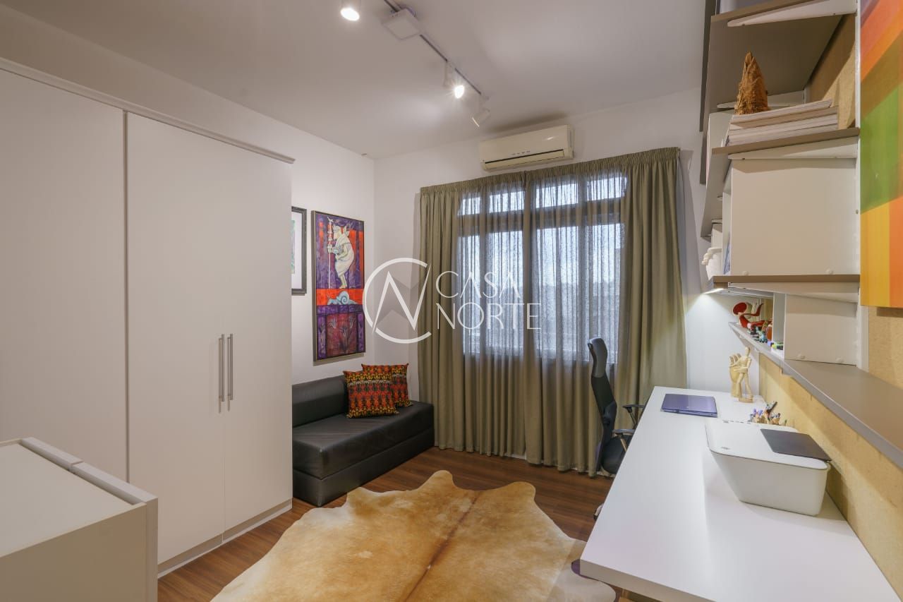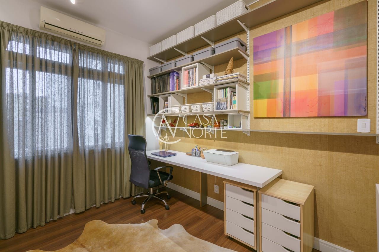 O imóvel conta com dois dormitórios, sendo um deles transformado em um refinado escritório, além de um closet exclusivo e um banheiro social de acabamento impecável.