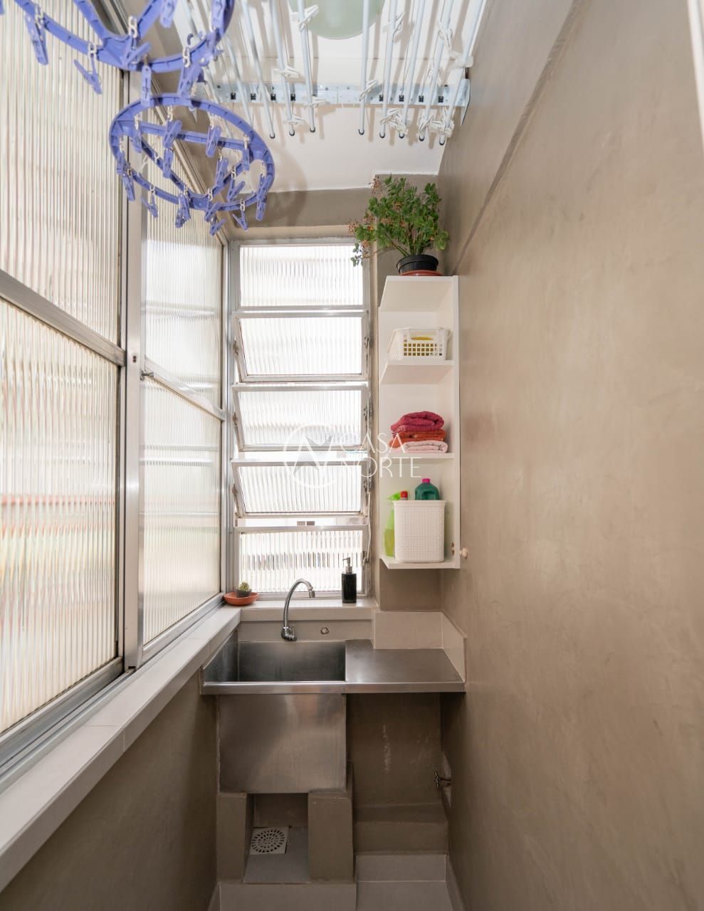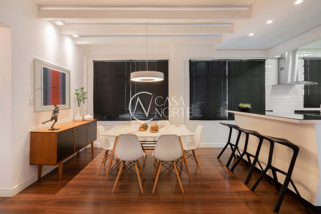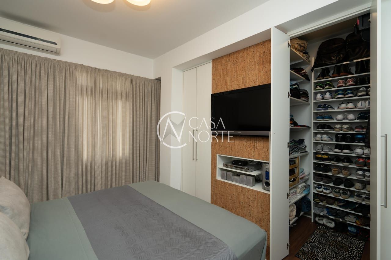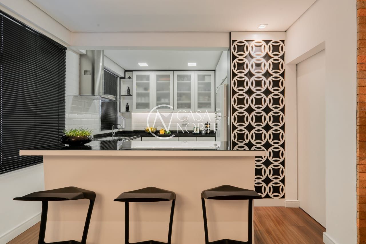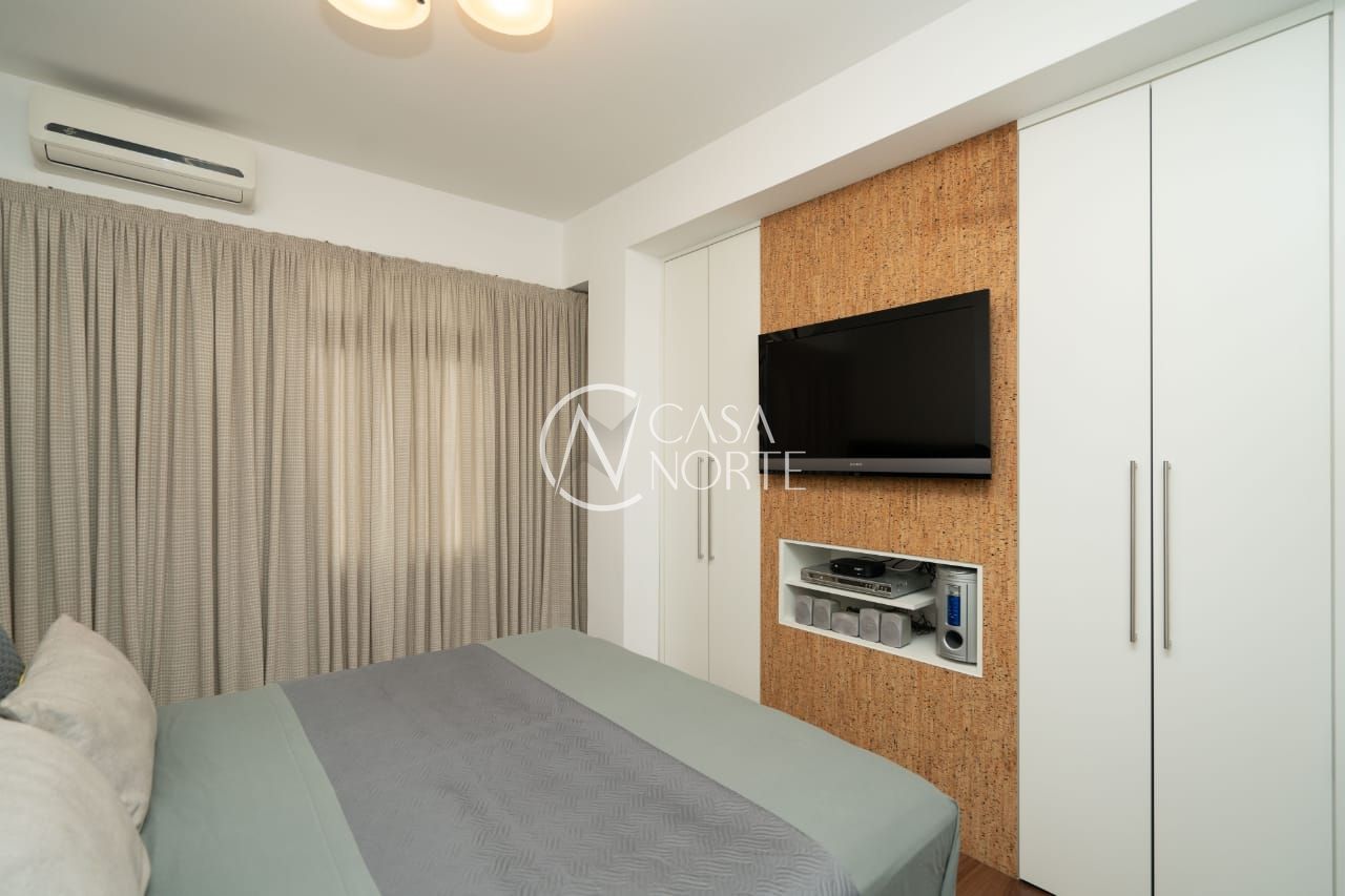 O imóvel conta com dois dormitórios, sendo um deles transformado em um refinado escritório, além de um closet exclusivo e um banheiro social de acabamento impecável.
