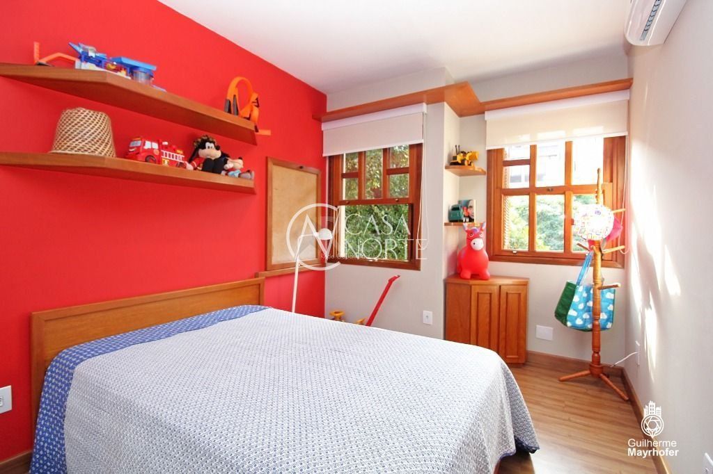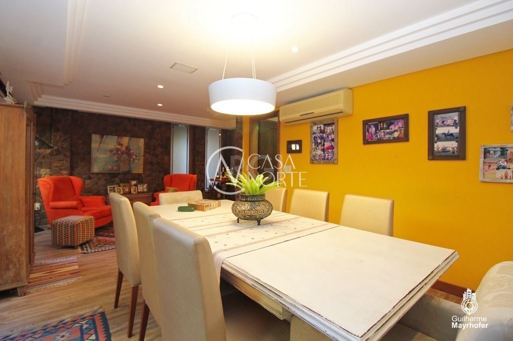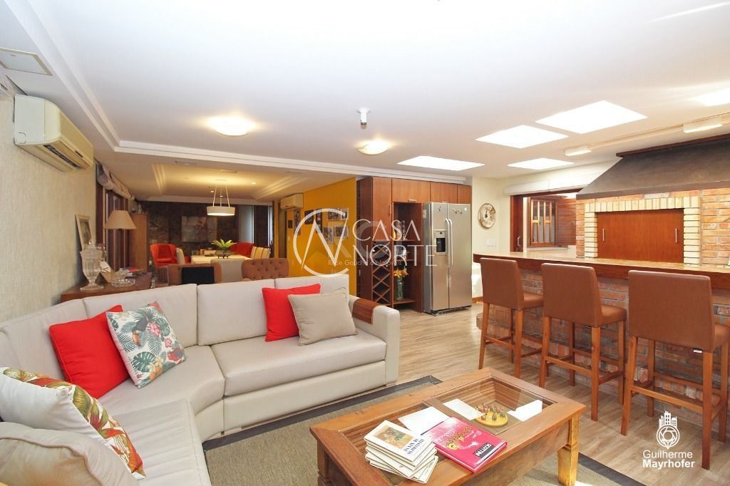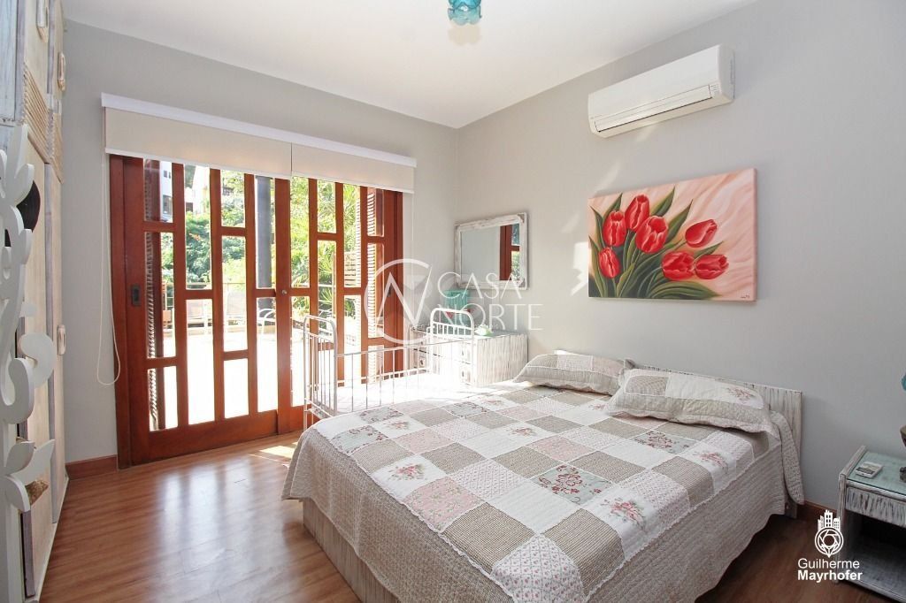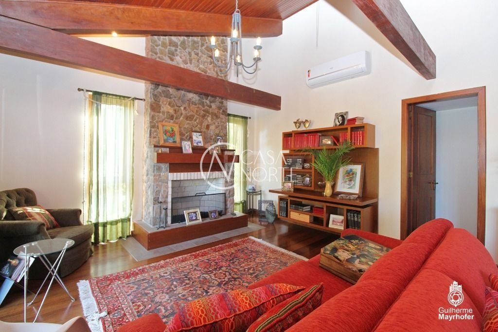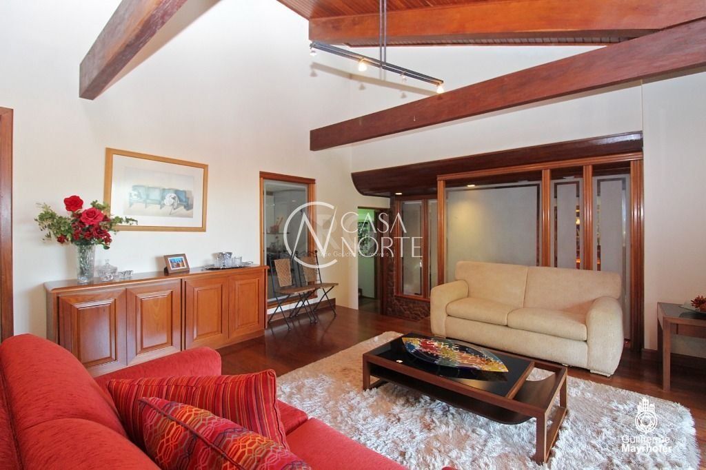 A Suíte do casal com terraço, hidromassagem e piso aquecido no banheiro do casal. A outra com terraço/solarium. Os outros três dormitórios com banheiro social. Os dormitórios são amplos, iluminados e ventilados, todos com ar condicionado Split. Living room de dois ambientes , com sacada, lareira, piso de Ipê, pé direito alto com vigas de madeira aparente (ipê maciço).