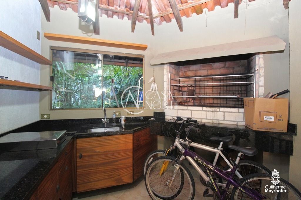 Estar íntimo com home theater, espaço gourmet com churrasqueira, fogão a lenha, forno de pizza, lareira, integrado com a sala de estar/jantar. Escritório/gabinete com estante envidraçada, mesa ampla de mármore, mobiliado, piso de Ipê. Lavabo. Ampla copa/cozinha, ótima lavanderia com despensa e espaço para dependência de empregada com banheiro auxiliar.