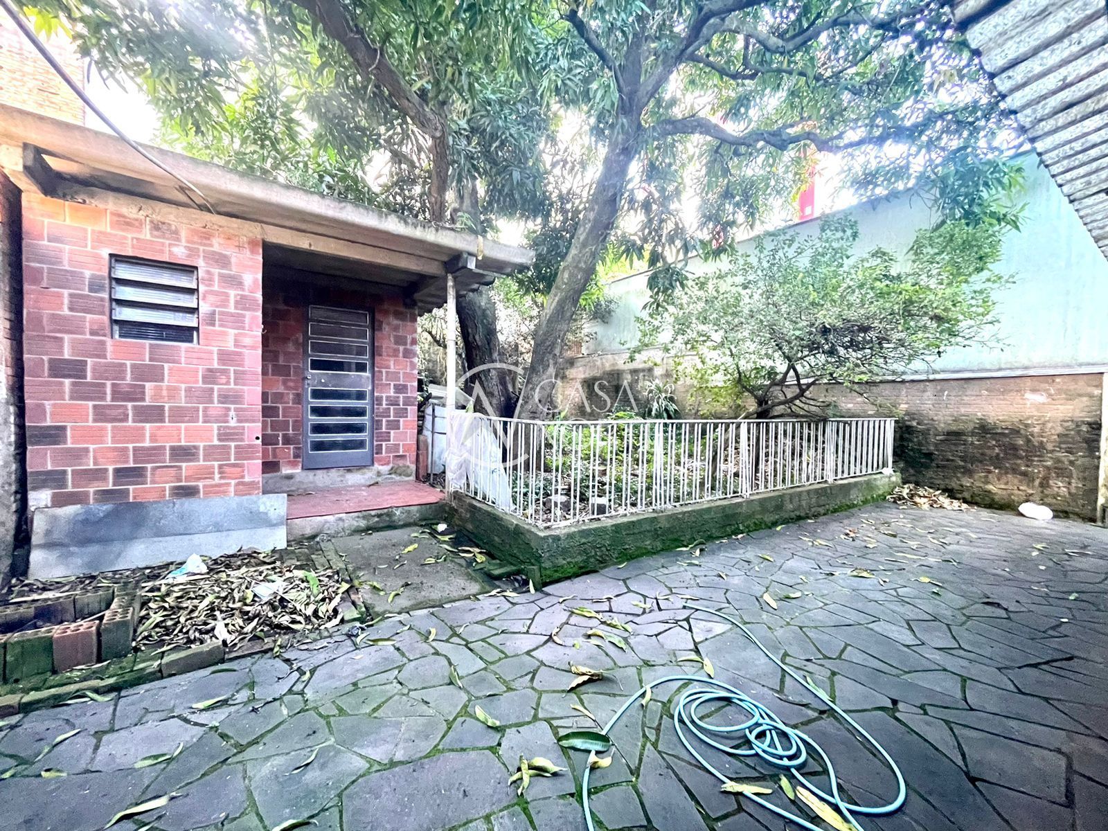 Um pátio grande com uma casa separada edícula, com coxinha e churrasqueira. Pátio grande com área verde a árvores.