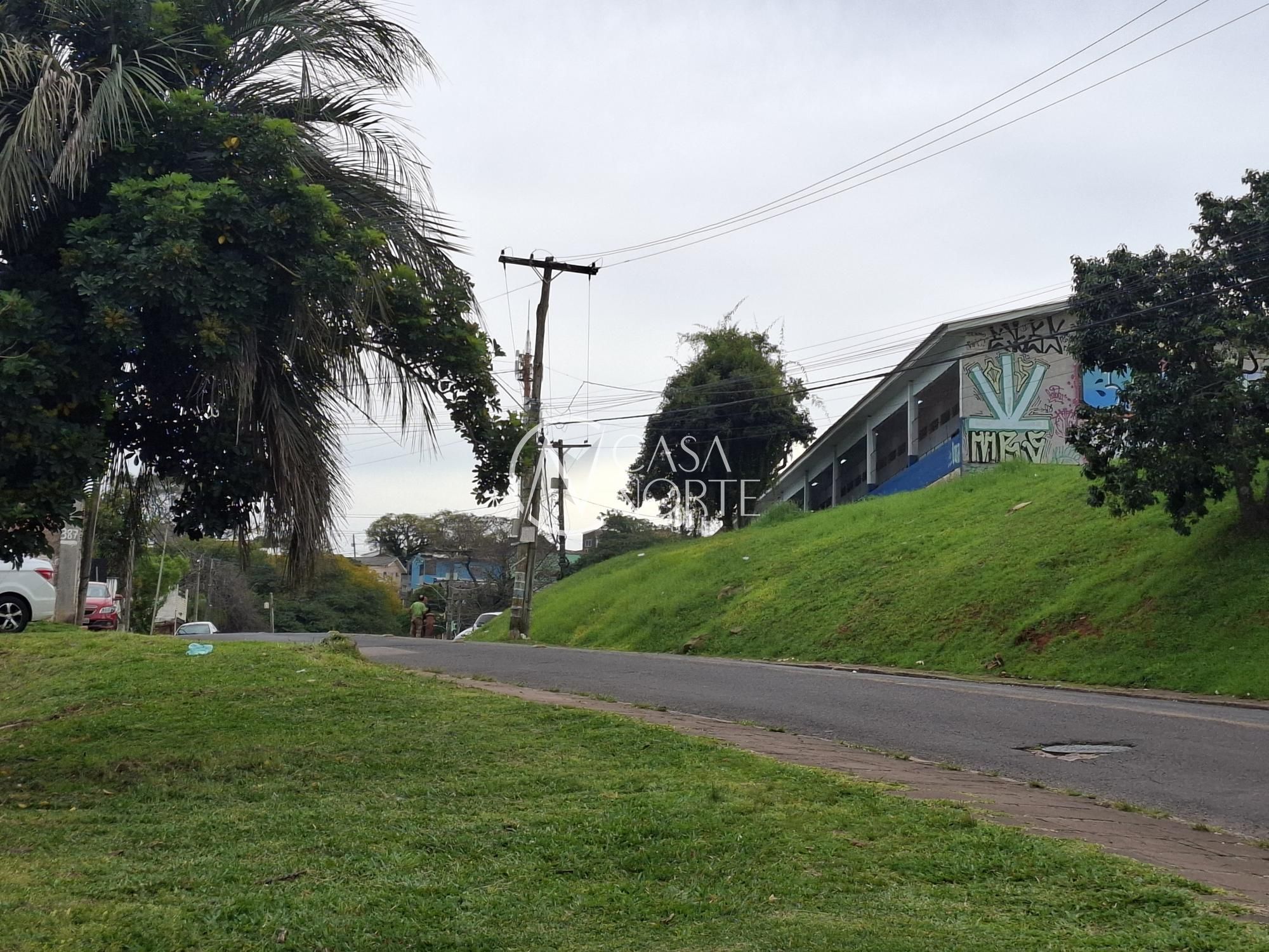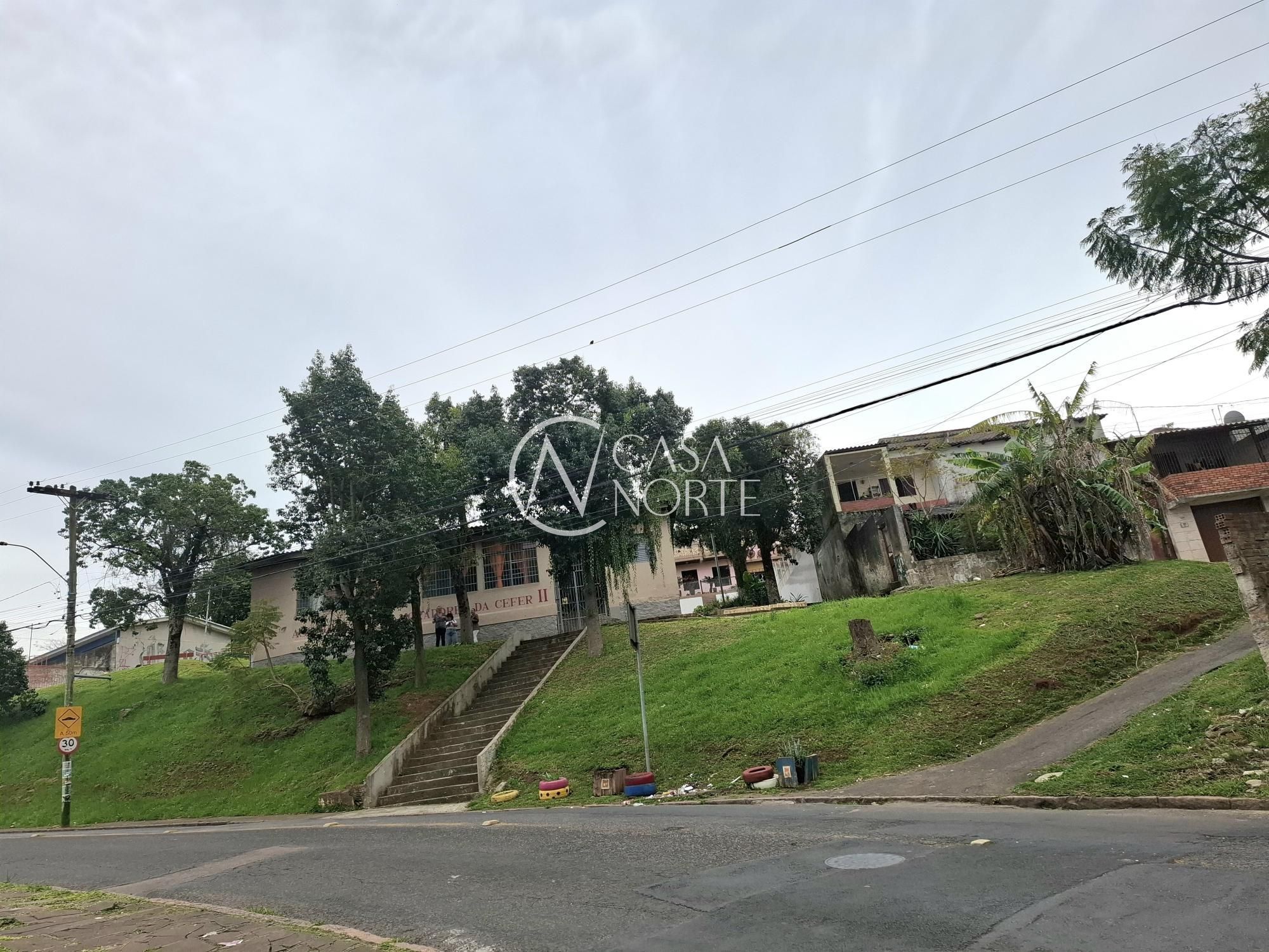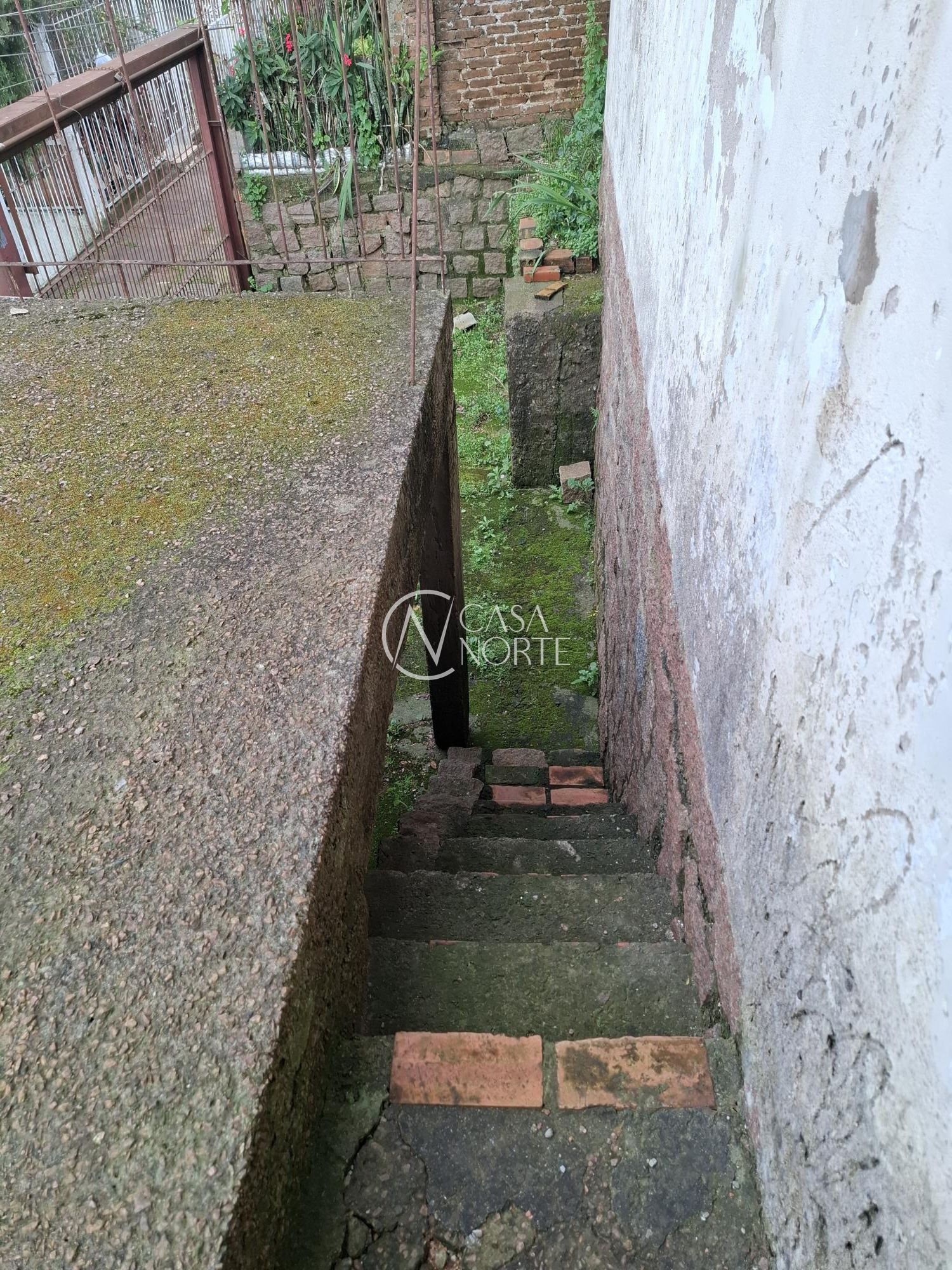 Parte de alvenaria com garagem coberta e terraço, escadaria. Terreno todo fechado, com portão de garagem.