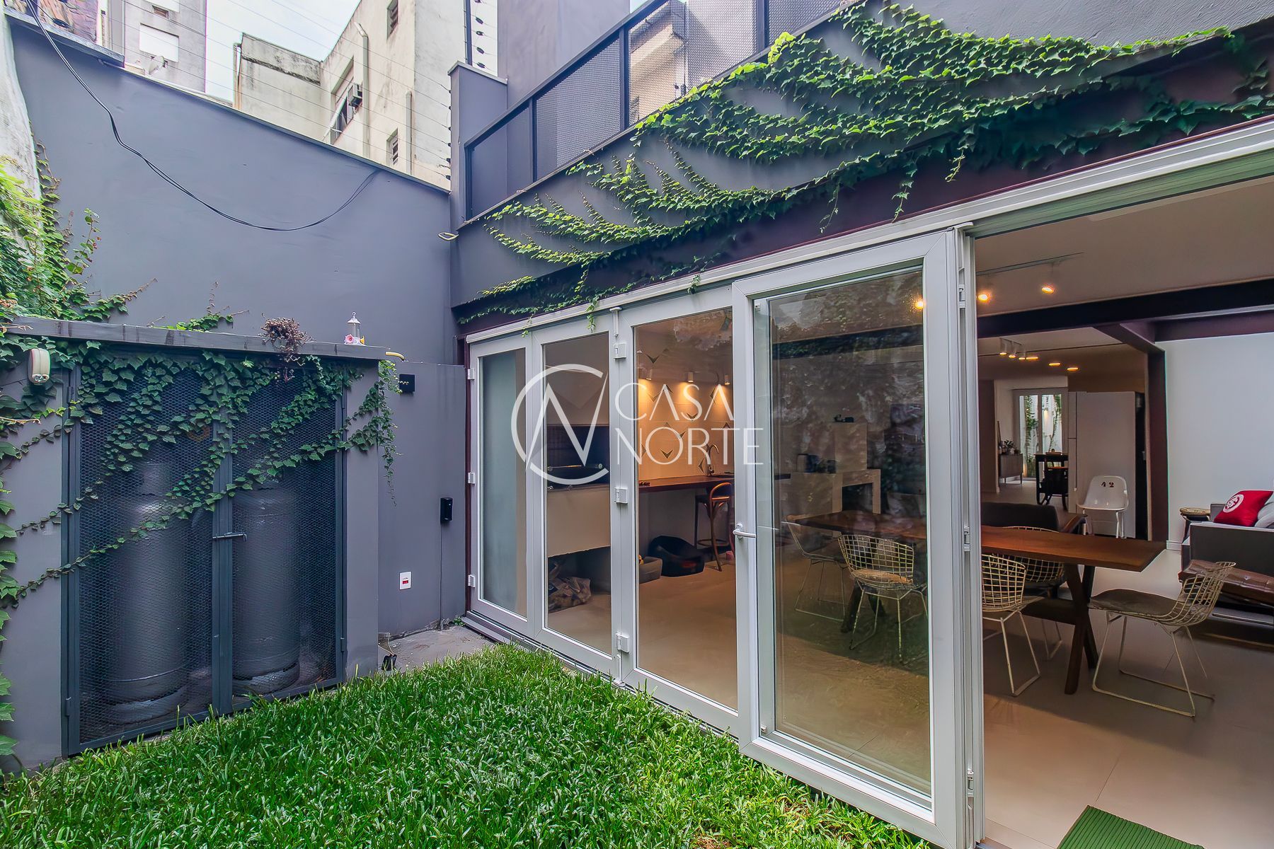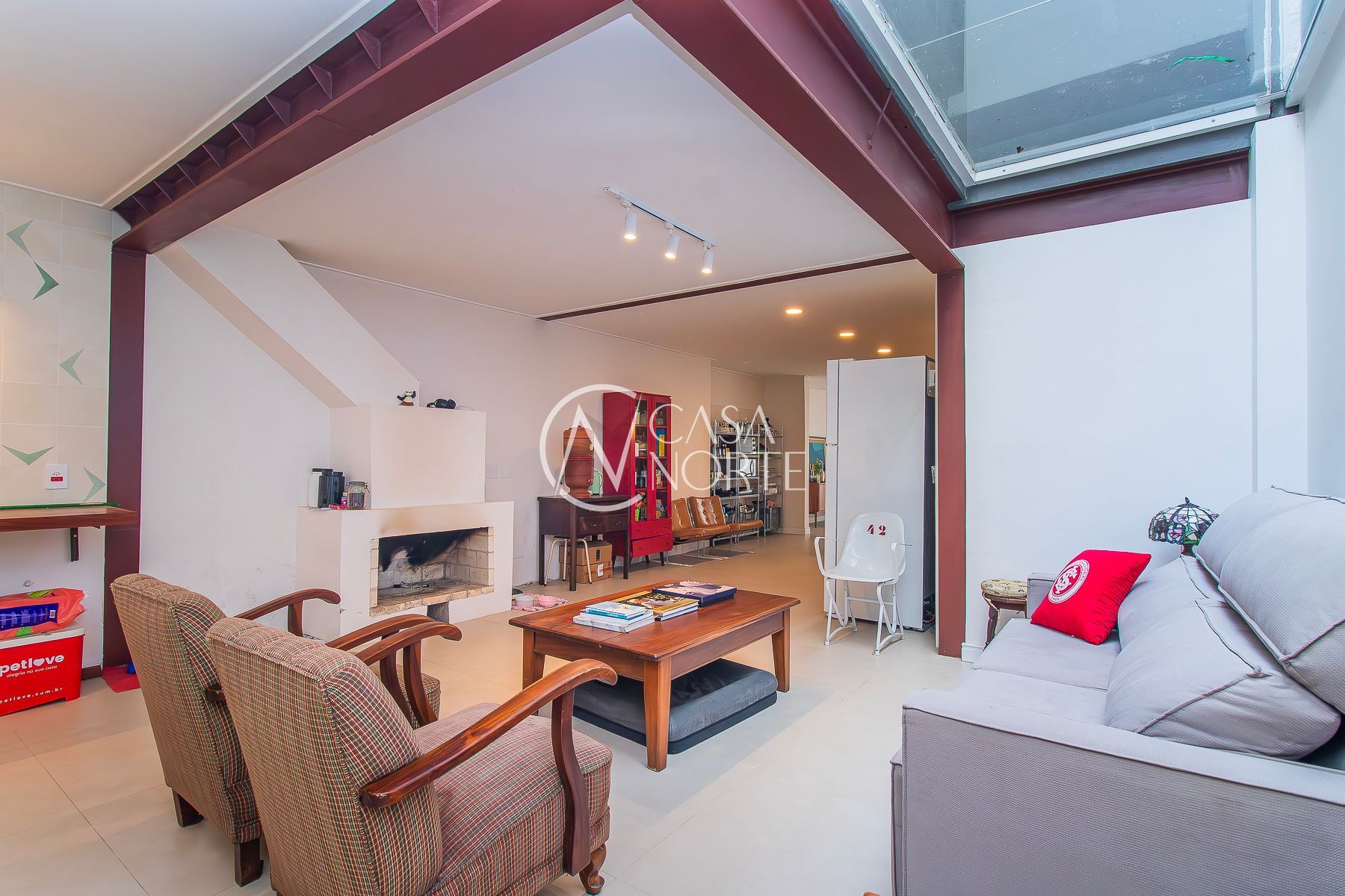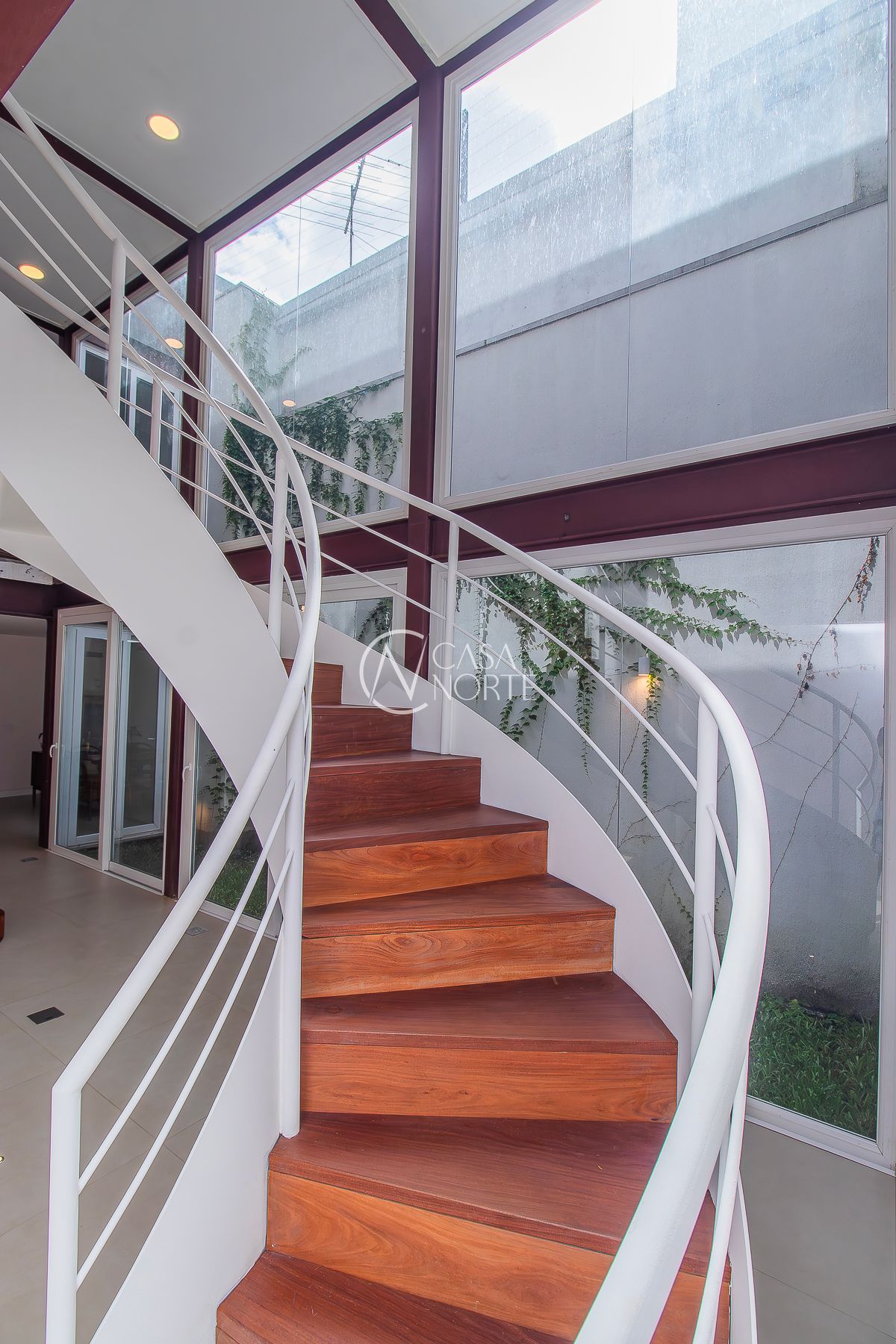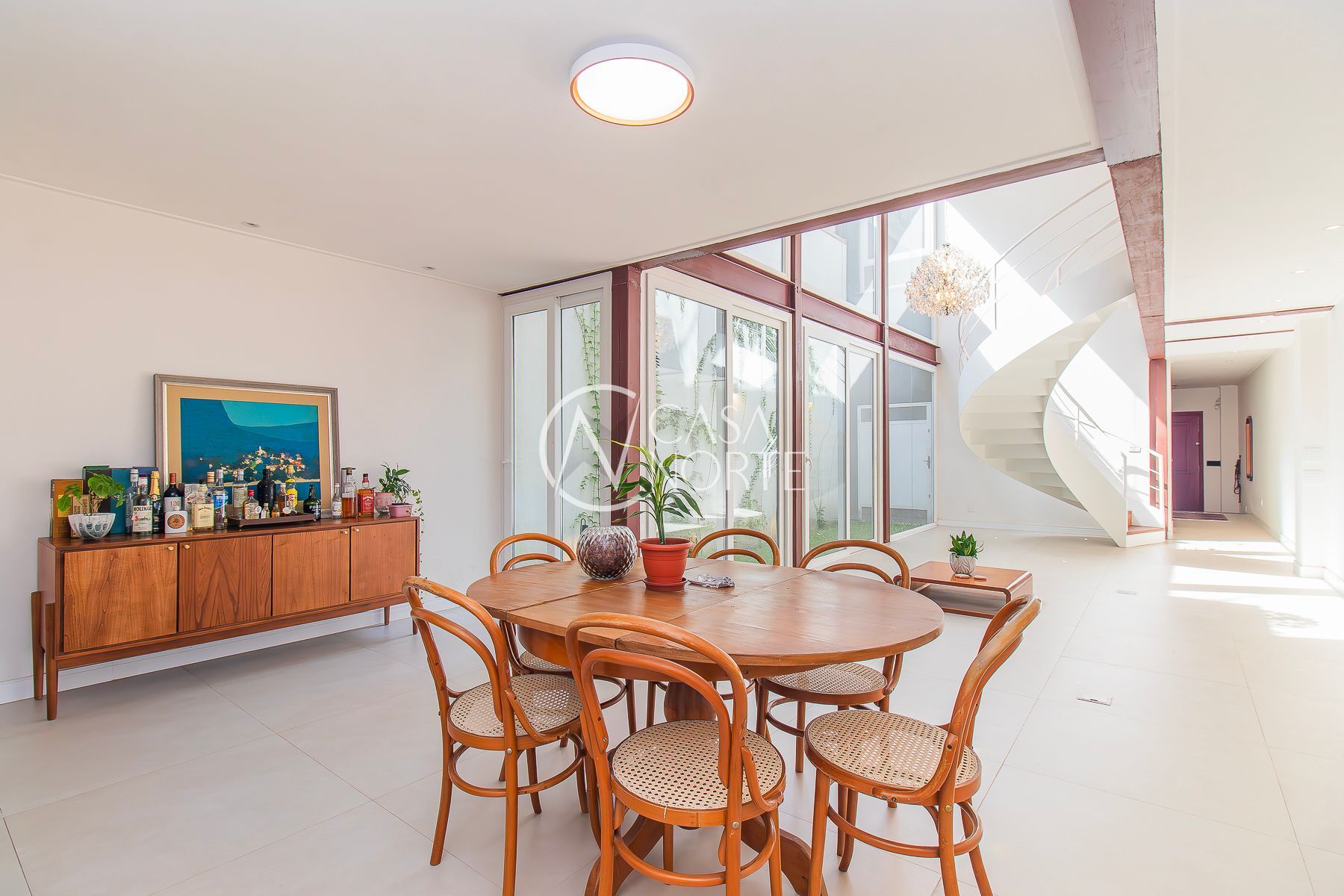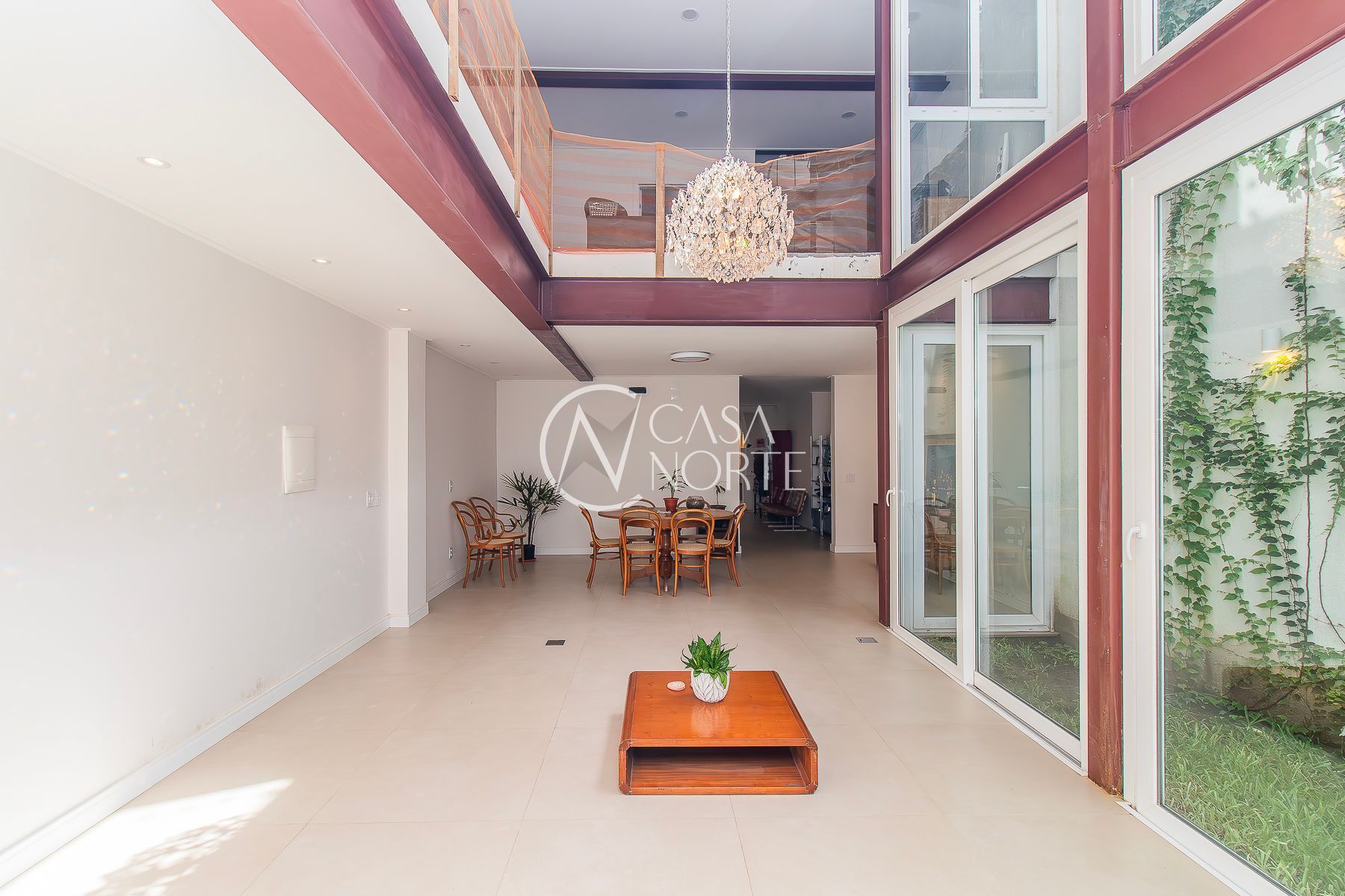 No térreo: Amplo living com acesso ao jardim de inverno que trás um alto astral para o ambiente. Hall de entrada, lavabo, escada com acesso ao mezanino, cozinha, área de serviço, churrasqueira, estar com lareira e pátio externo.