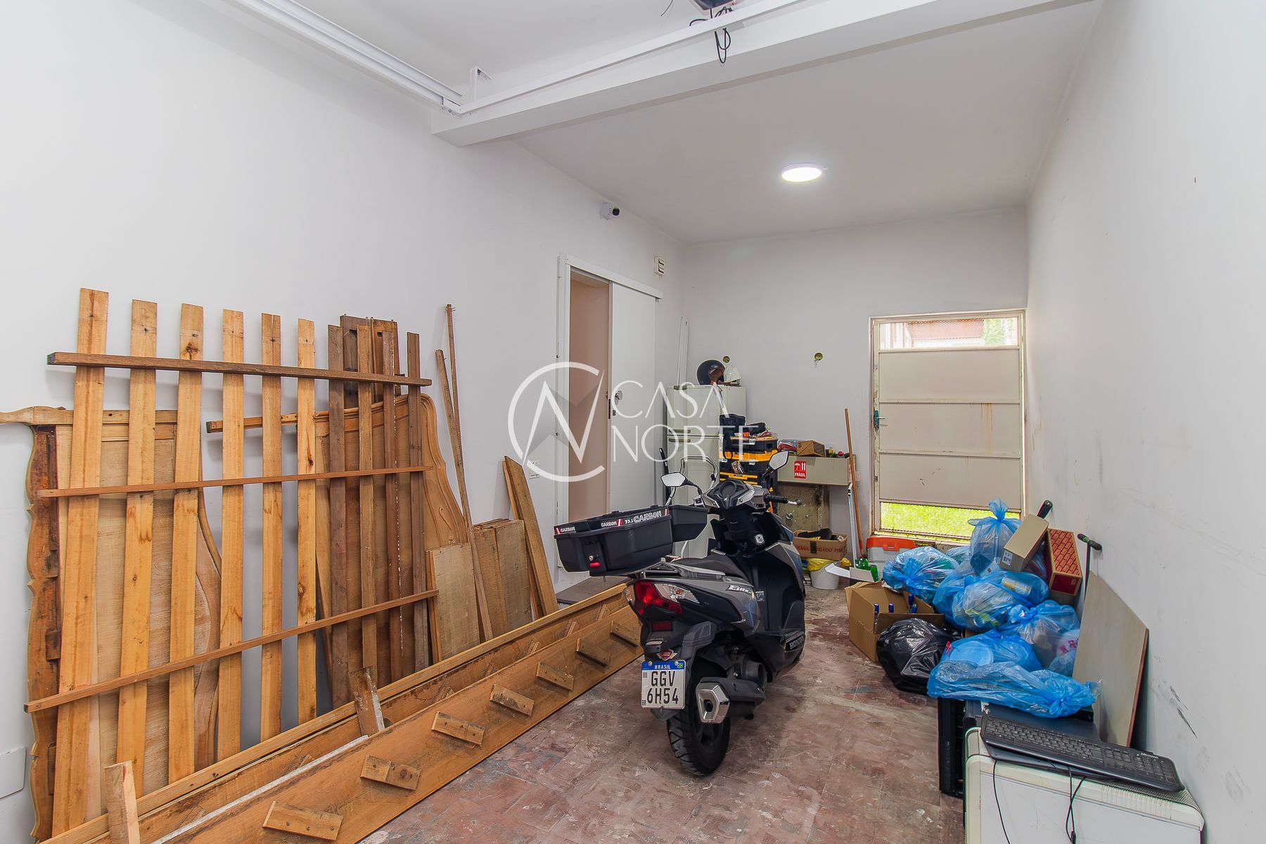 A garagem tem vaga para um carro e bicicletas e motos.