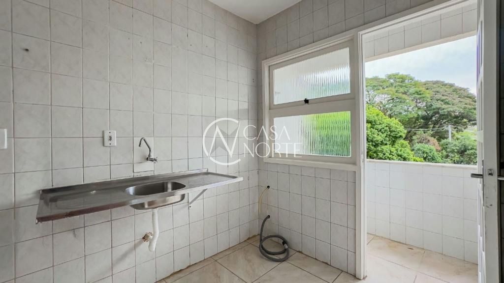 Cozinha ampla, ventilada, com revestimento em cerâmica e área de serviço separada, com abertura e vista livre.