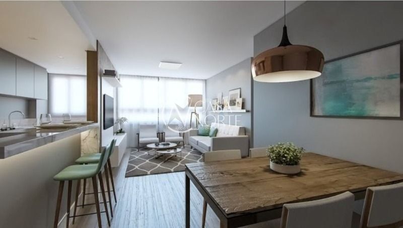 Os apartamentos possuem dois dormitórios, suíte no dormitório do casal, sala de estar/jantar, banheiro social, cozinha americana com churrasqueira integrada. Edifício com piscina e salão de festas, infraestrutura completa.