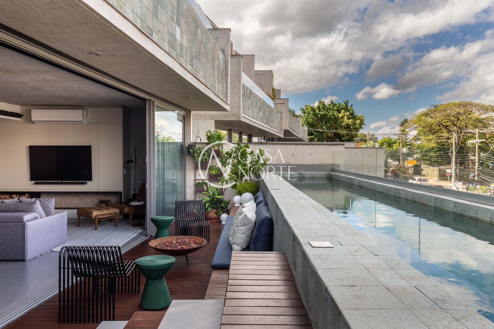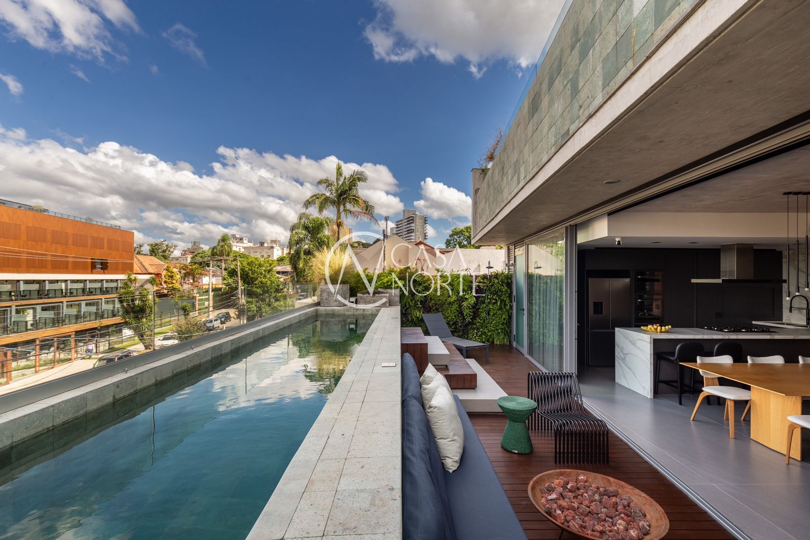 A área social é ampla, iluminada por esquadrias piso-teto e integrada à varanda com piscina privativa – ideal para momentos de convivência. A cozinha e os demais ambientes contam com móveis planejados e assinados da Todeschini, unindo sofisticação e funcionalidade.
