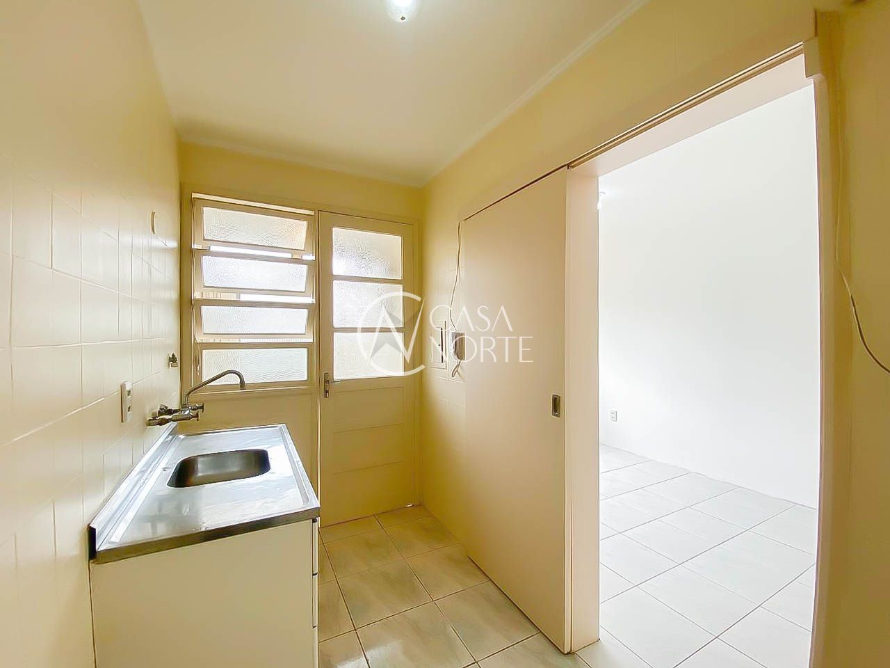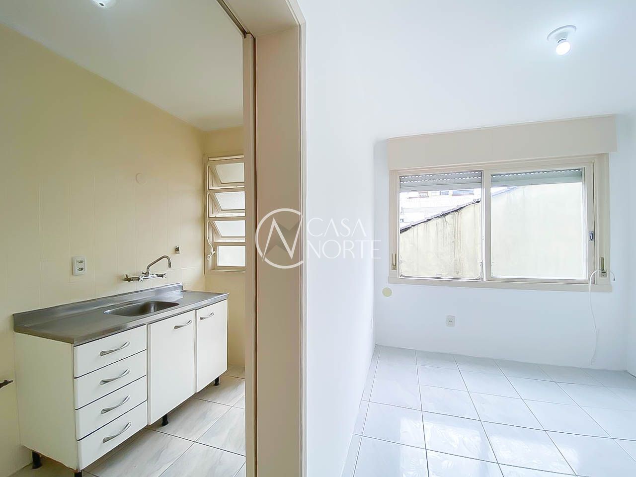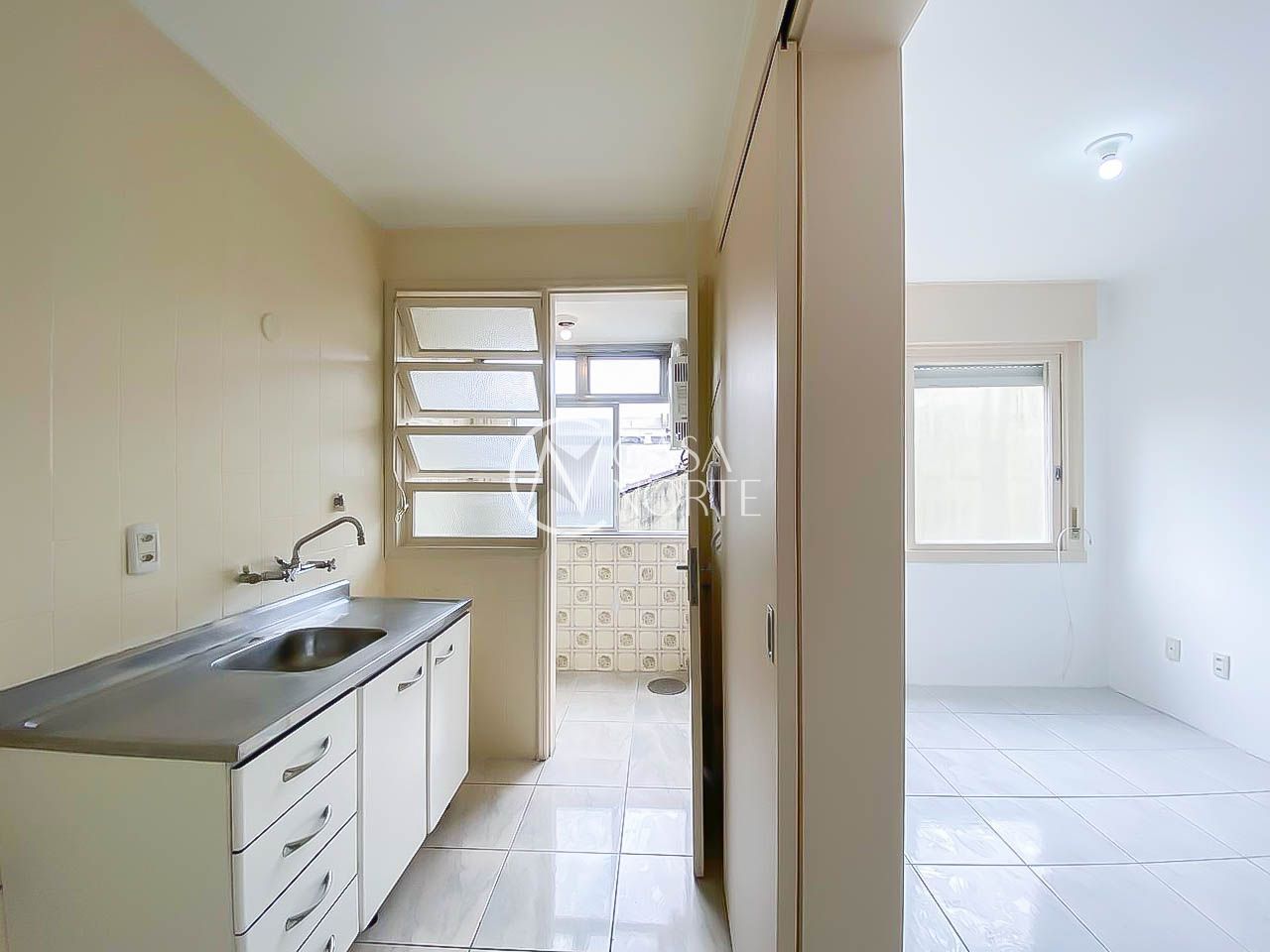 O apartamento conta com 1 dormitório suíte, living amplo e muito bem iluminado, com piso cerâmico claro que traz mais amplitude e praticidade. A cozinha possui armários e boa circulação, conectada a uma área de serviço separada e ventilada por ampla janela. O banheiro dispõe de box, gabinete e chuveiro a gás com junker instalado, garantindo mais conforto no dia a dia.