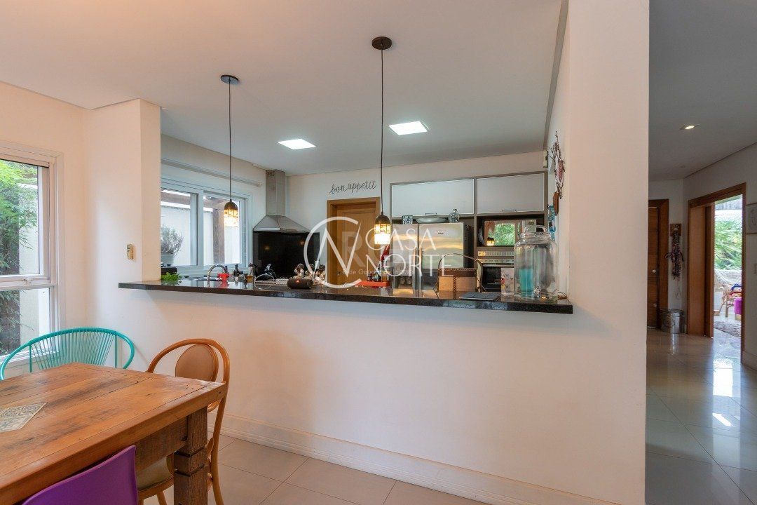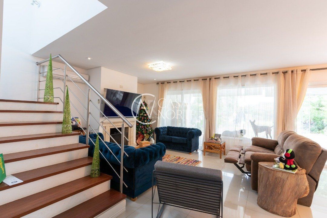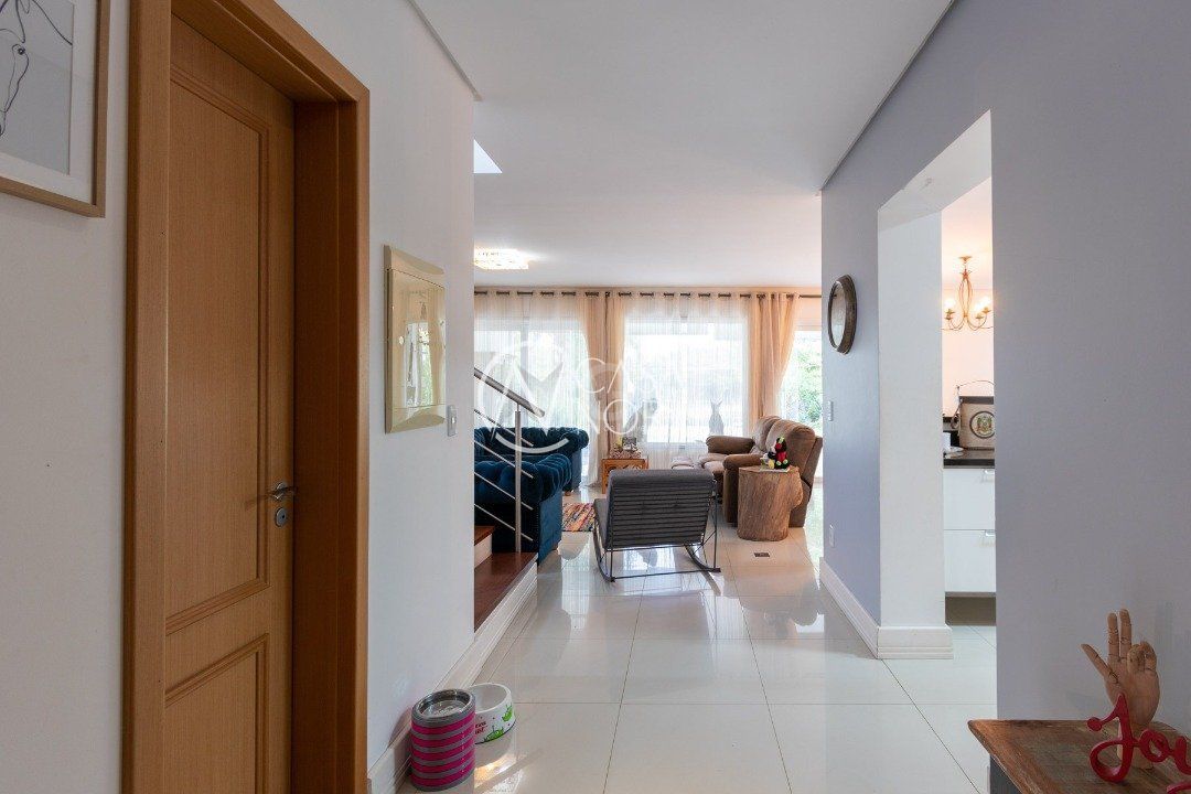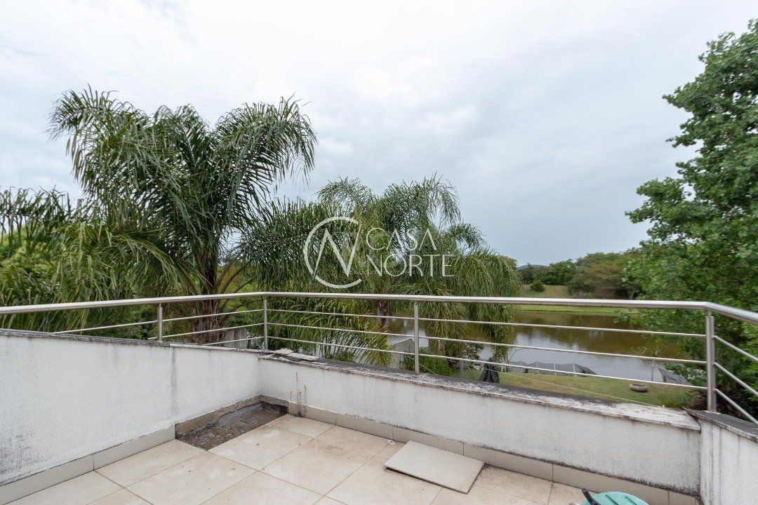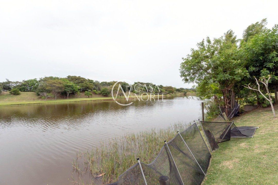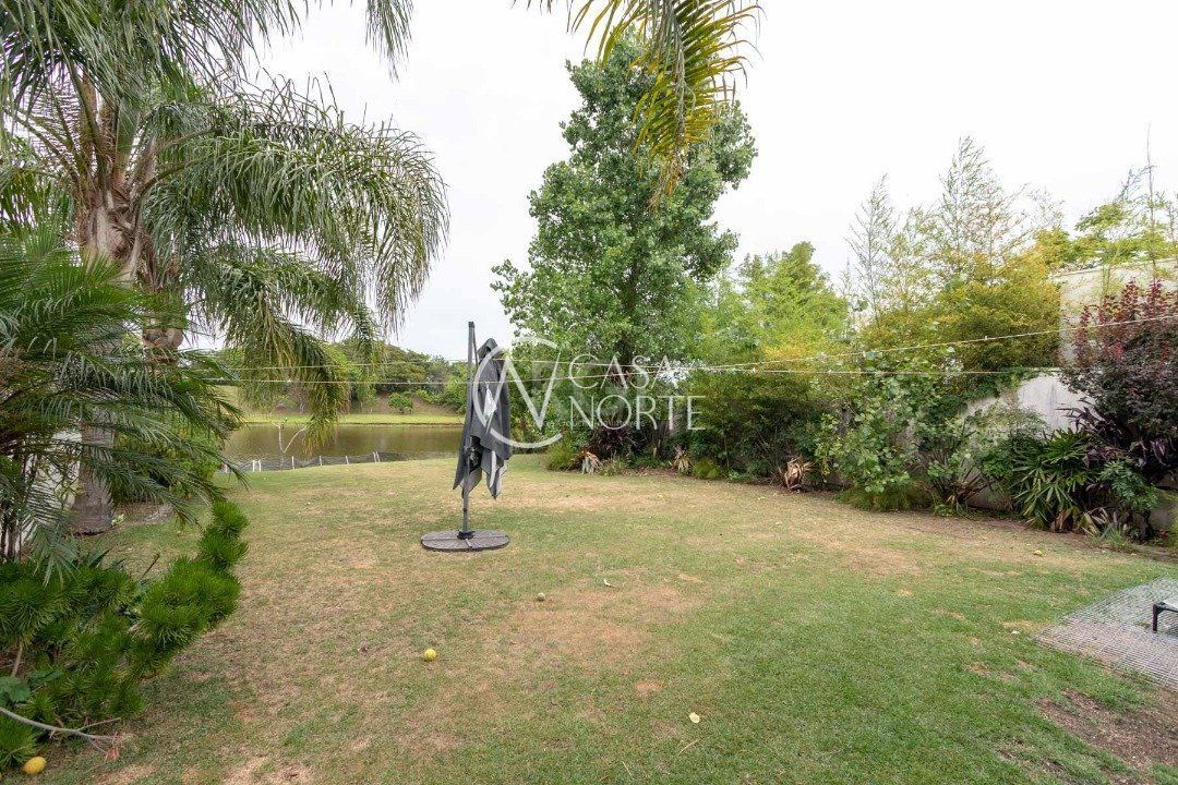 Ela tem um living amplo em dois ambientes com lareira, integrado com varanda e churrasqueira, cozinha americana. Gabinete, lavabo, área de serviço, dependência de empregada completa, belo pátio com fundos para o lago.