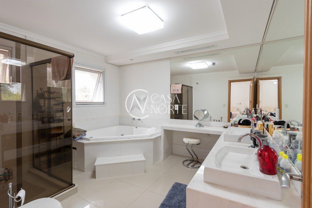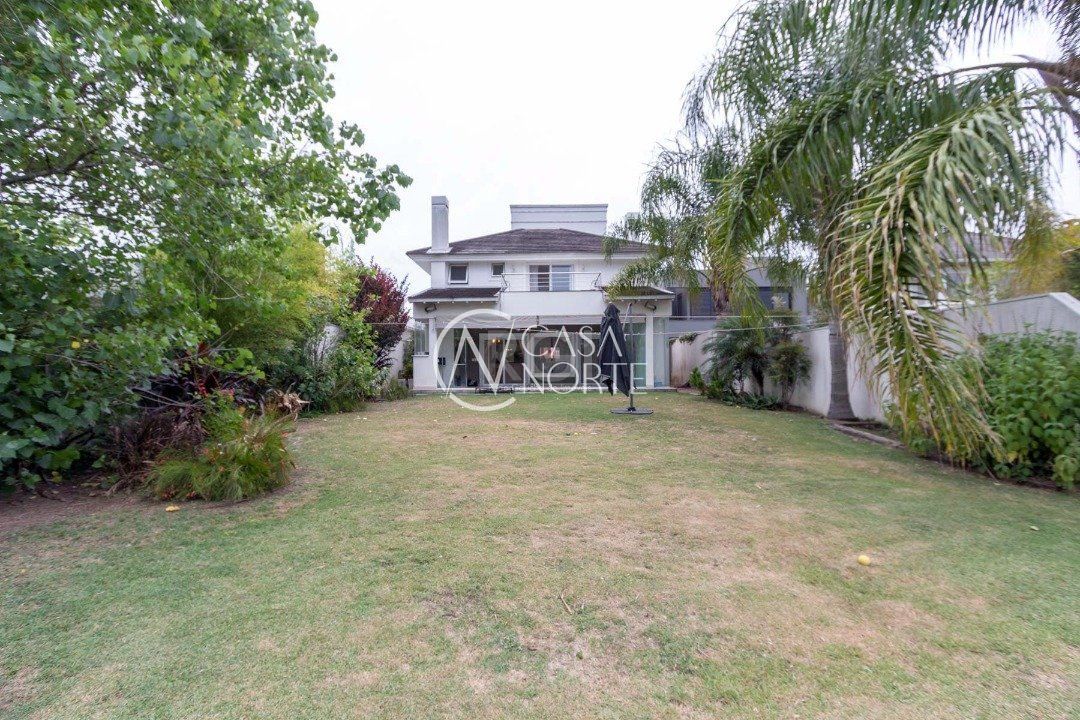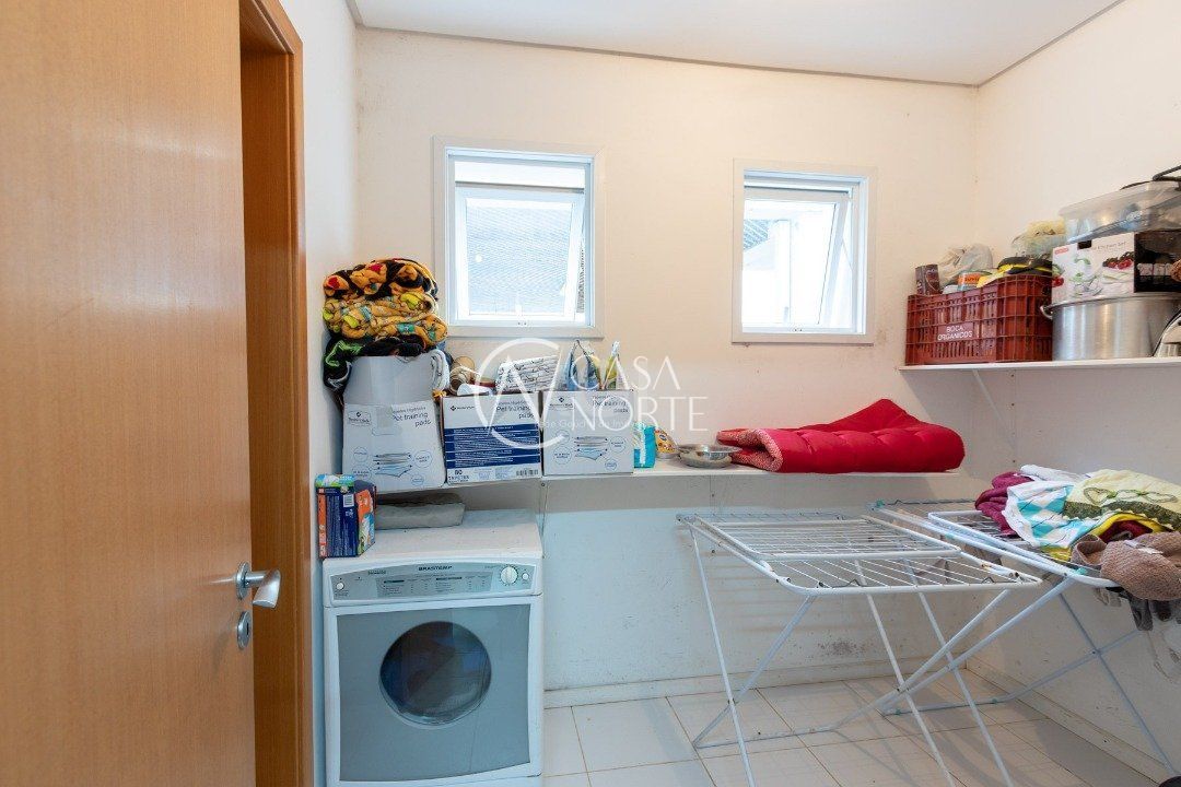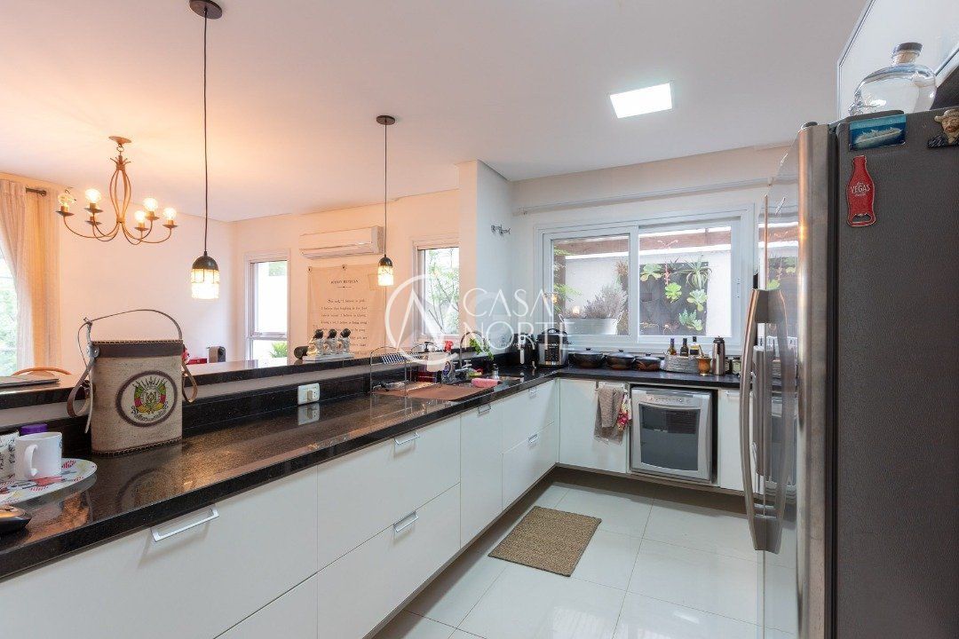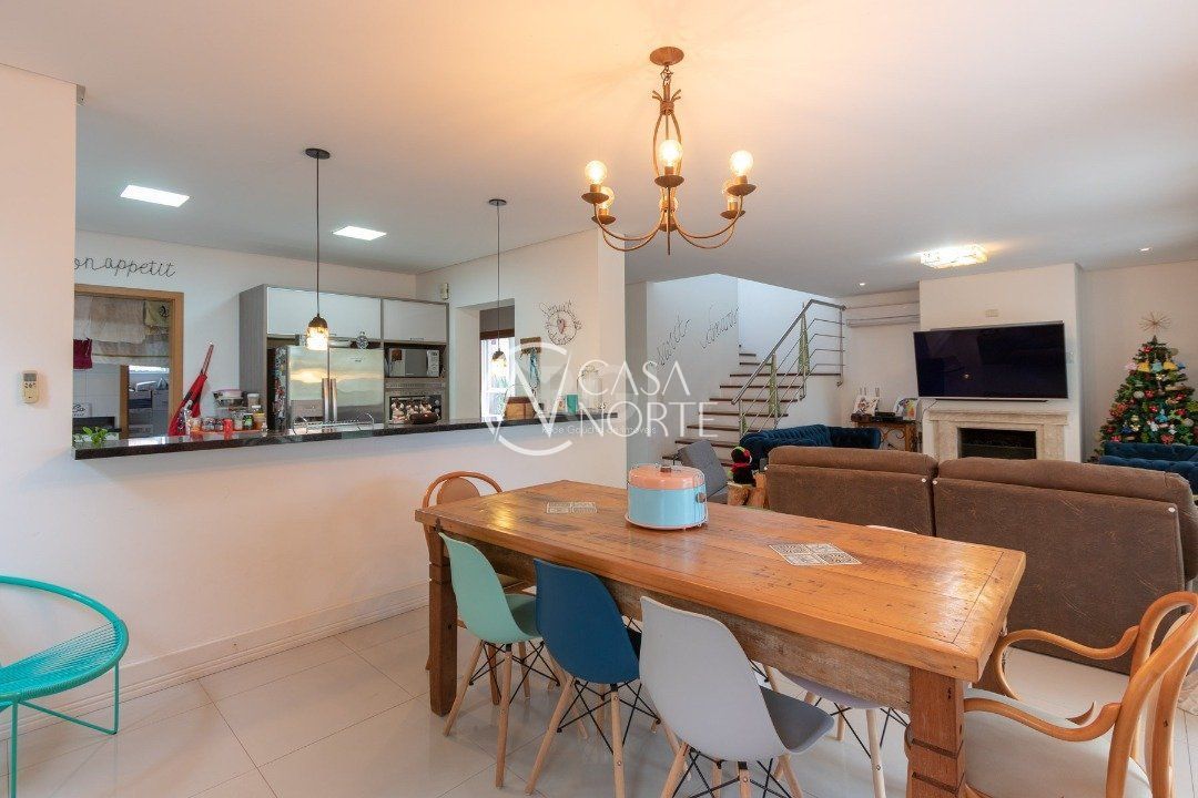 Ela tem um living amplo em dois ambientes com lareira, integrado com varanda e churrasqueira, cozinha americana. Gabinete, lavabo, área de serviço, dependência de empregada completa, belo pátio com fundos para o lago.