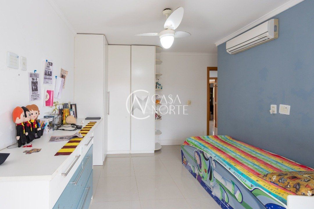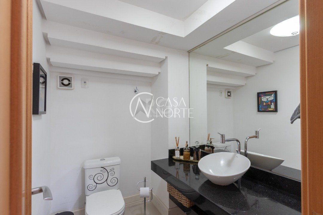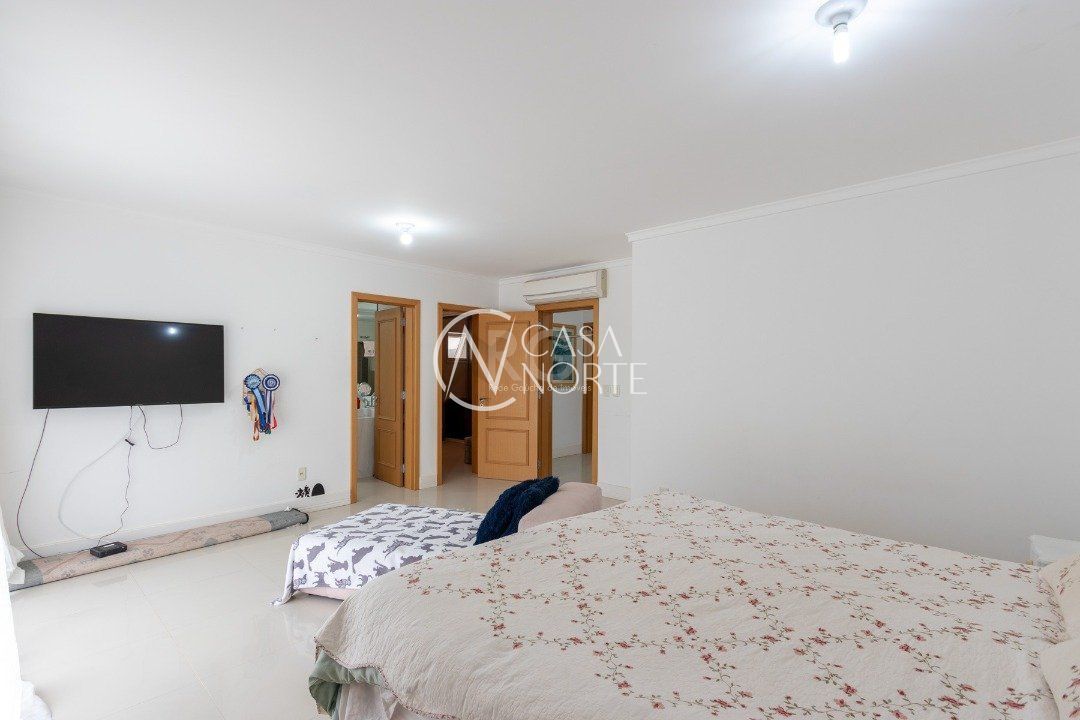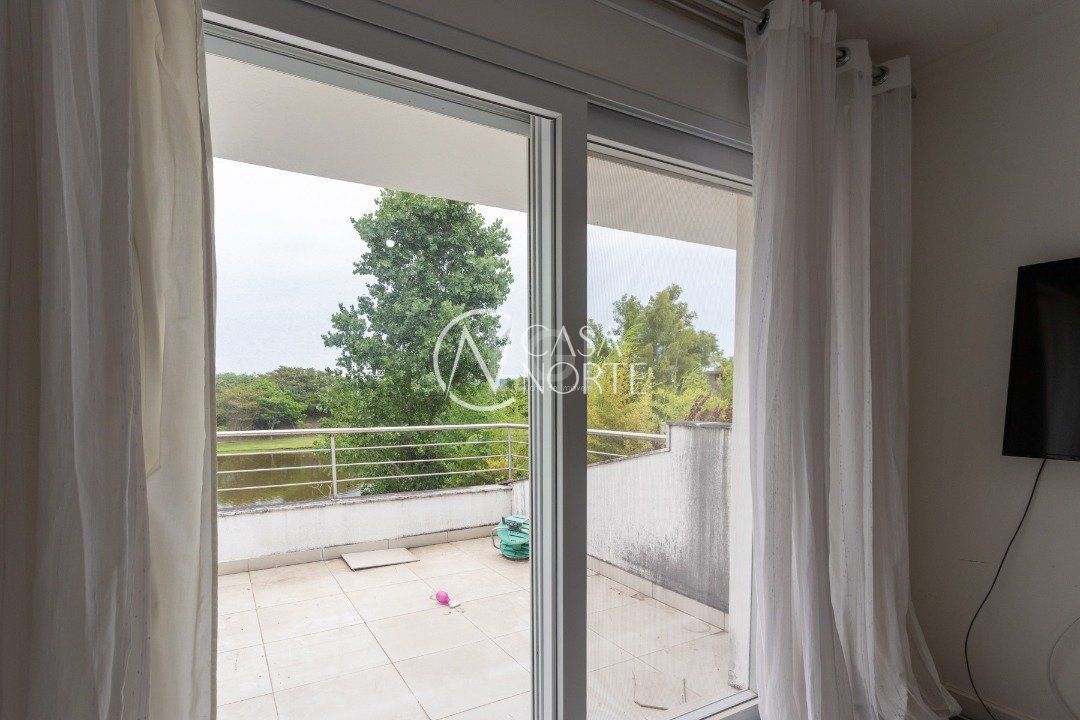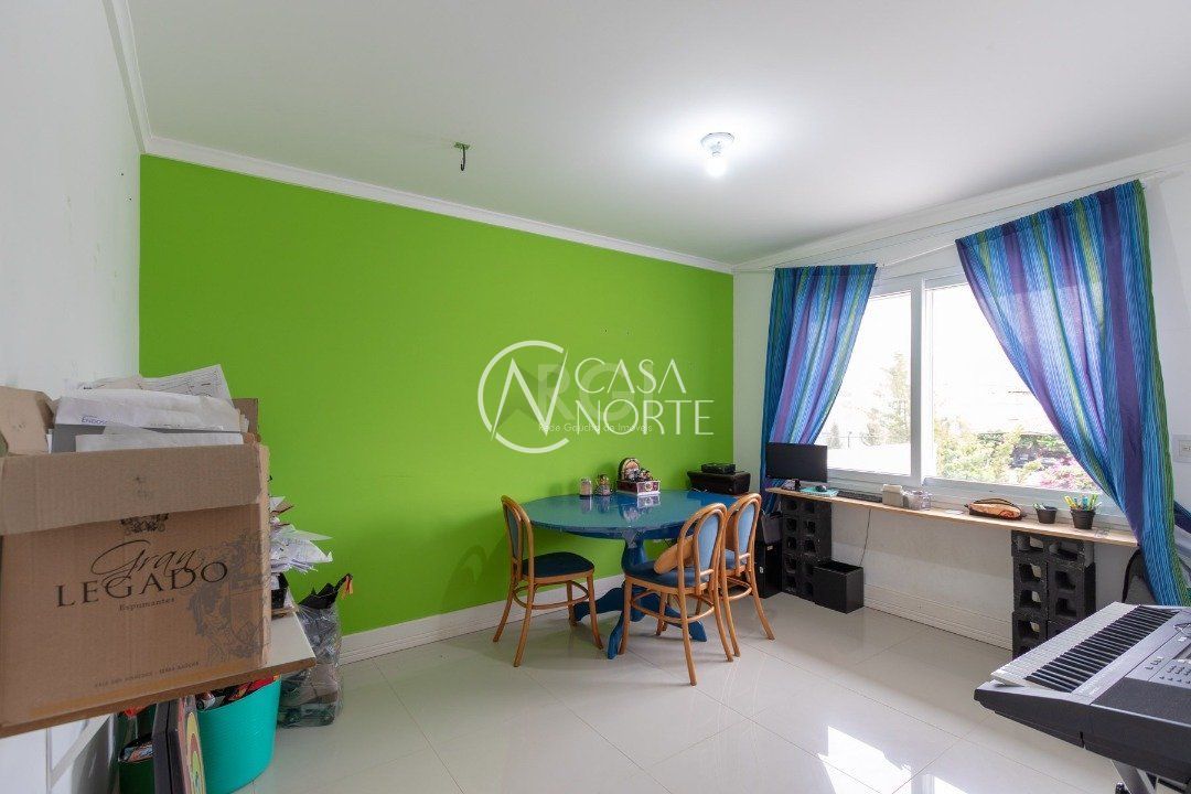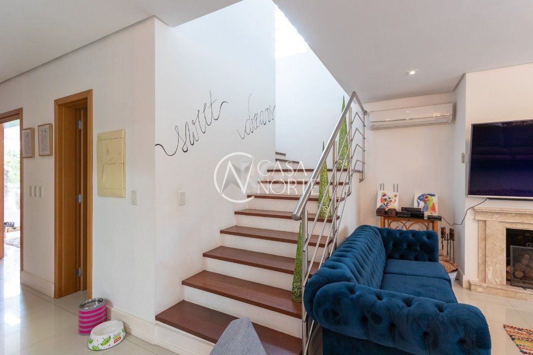 Ela tem um living amplo em dois ambientes com lareira, integrado com varanda e churrasqueira, cozinha americana. Gabinete, lavabo, área de serviço, dependência de empregada completa, belo pátio com fundos para o lago.