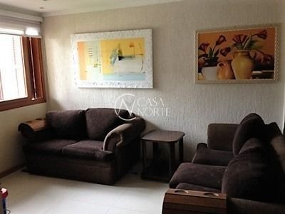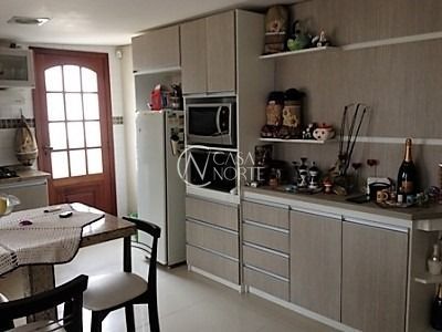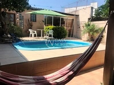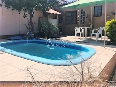 casa 3 dormitórios com suite, living 2 ambientes, cozinha com churrasqueira, banheiro social, salão de festas, área de serviço, banheiro, garagem, jardim e piscina. Gás central.