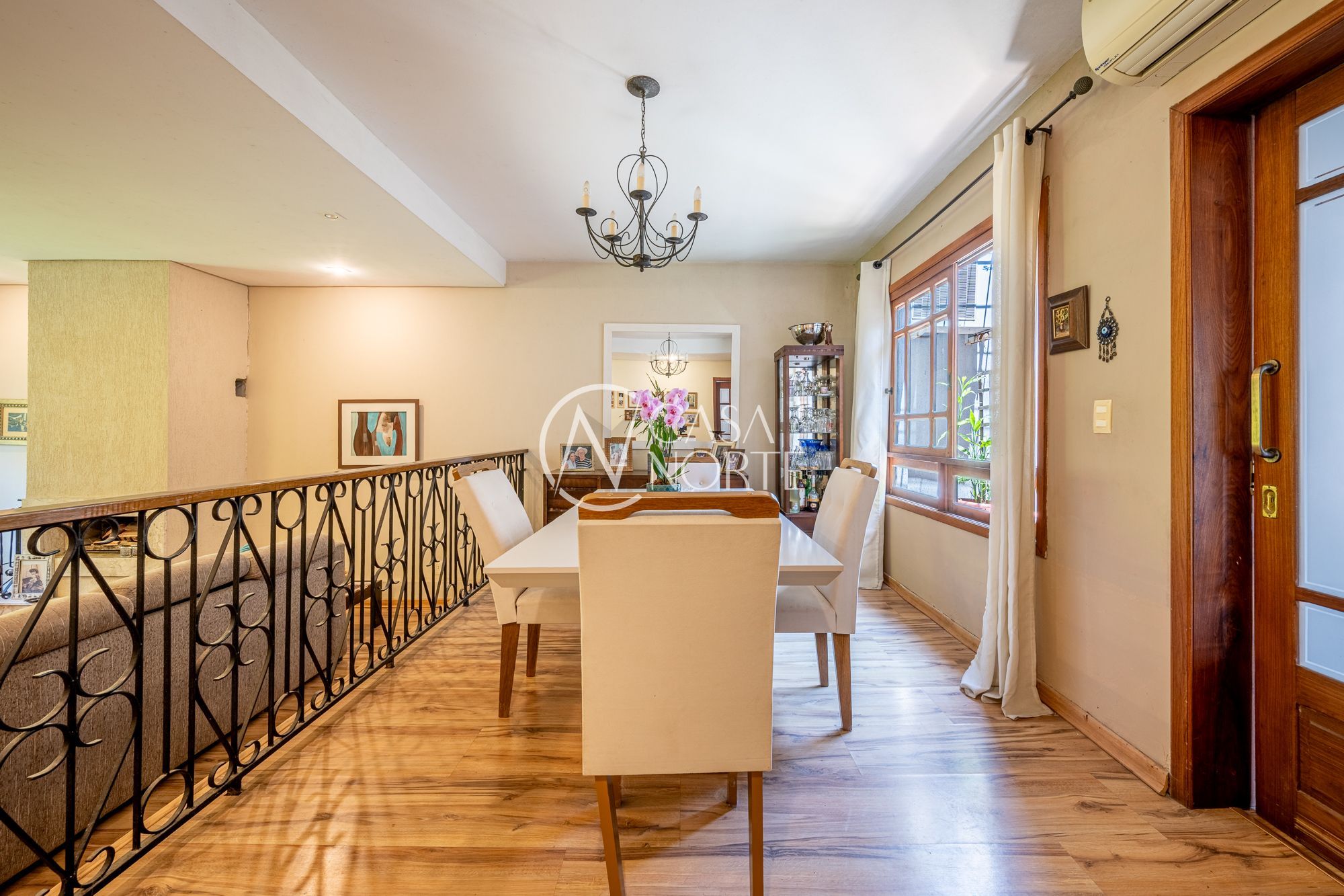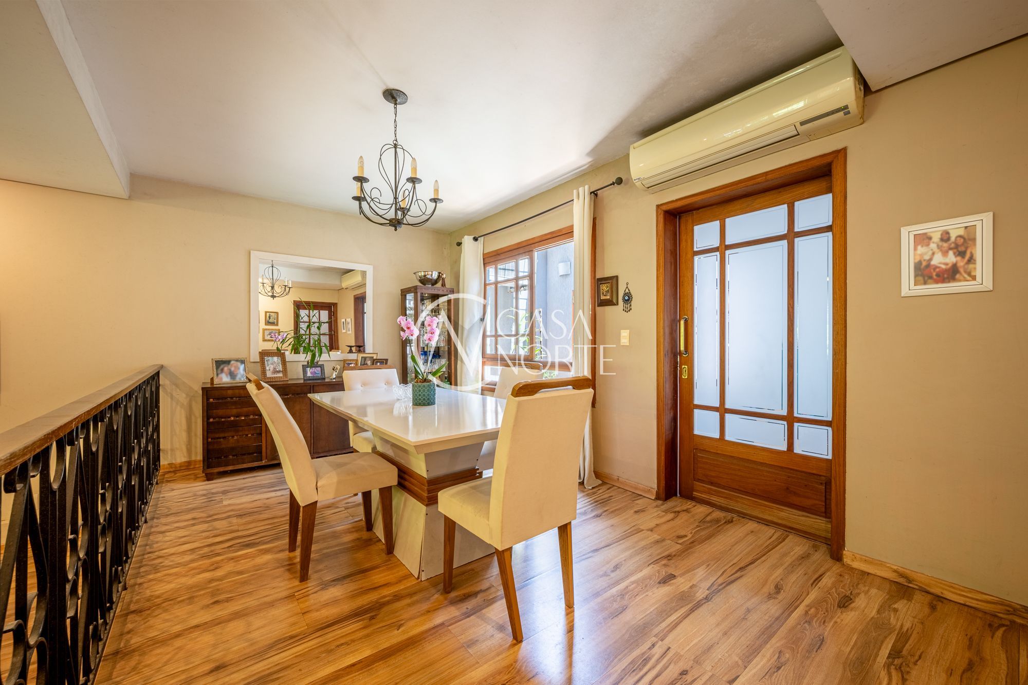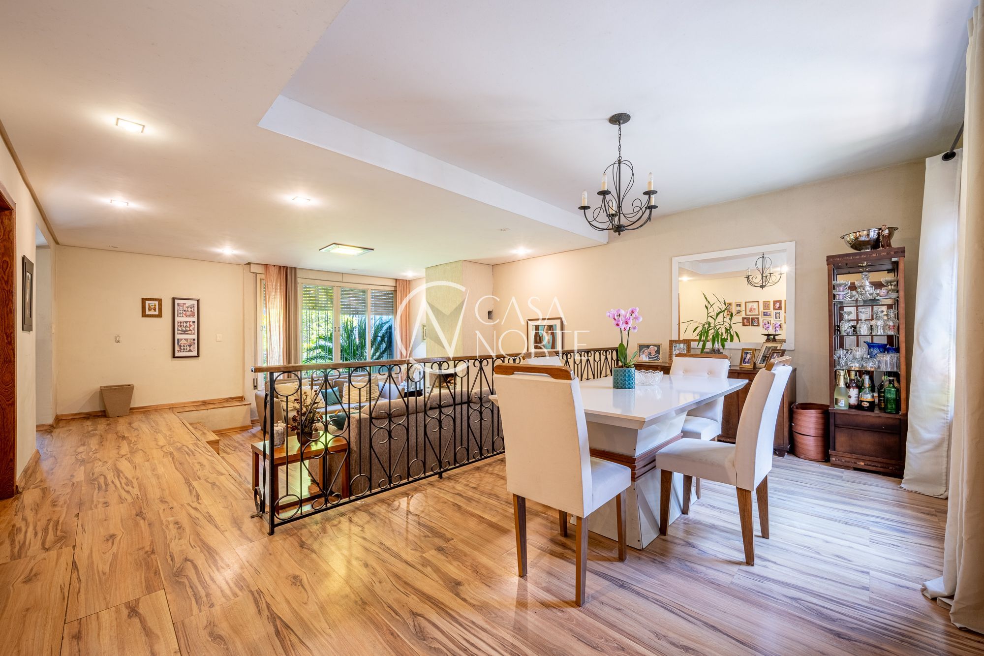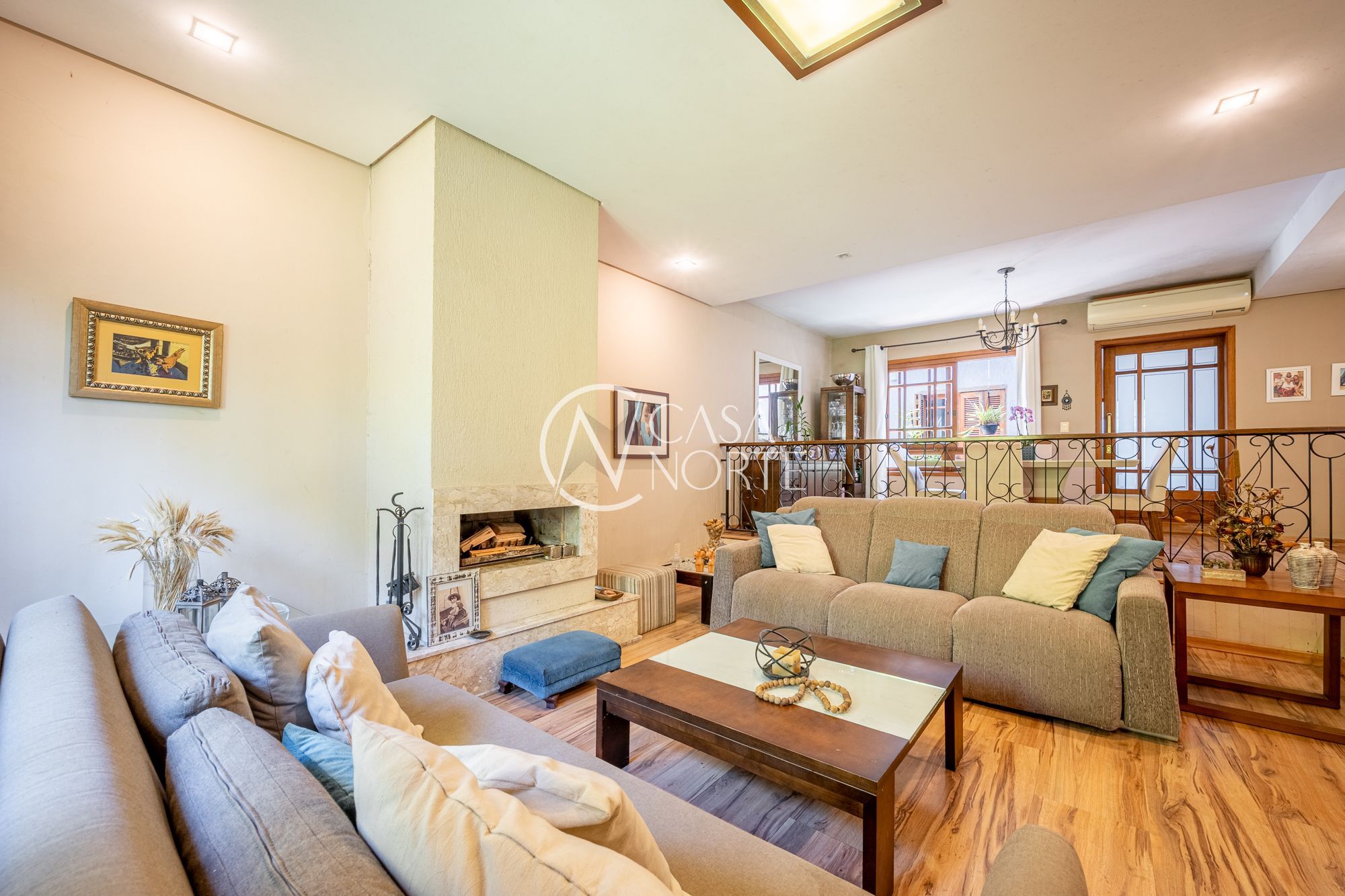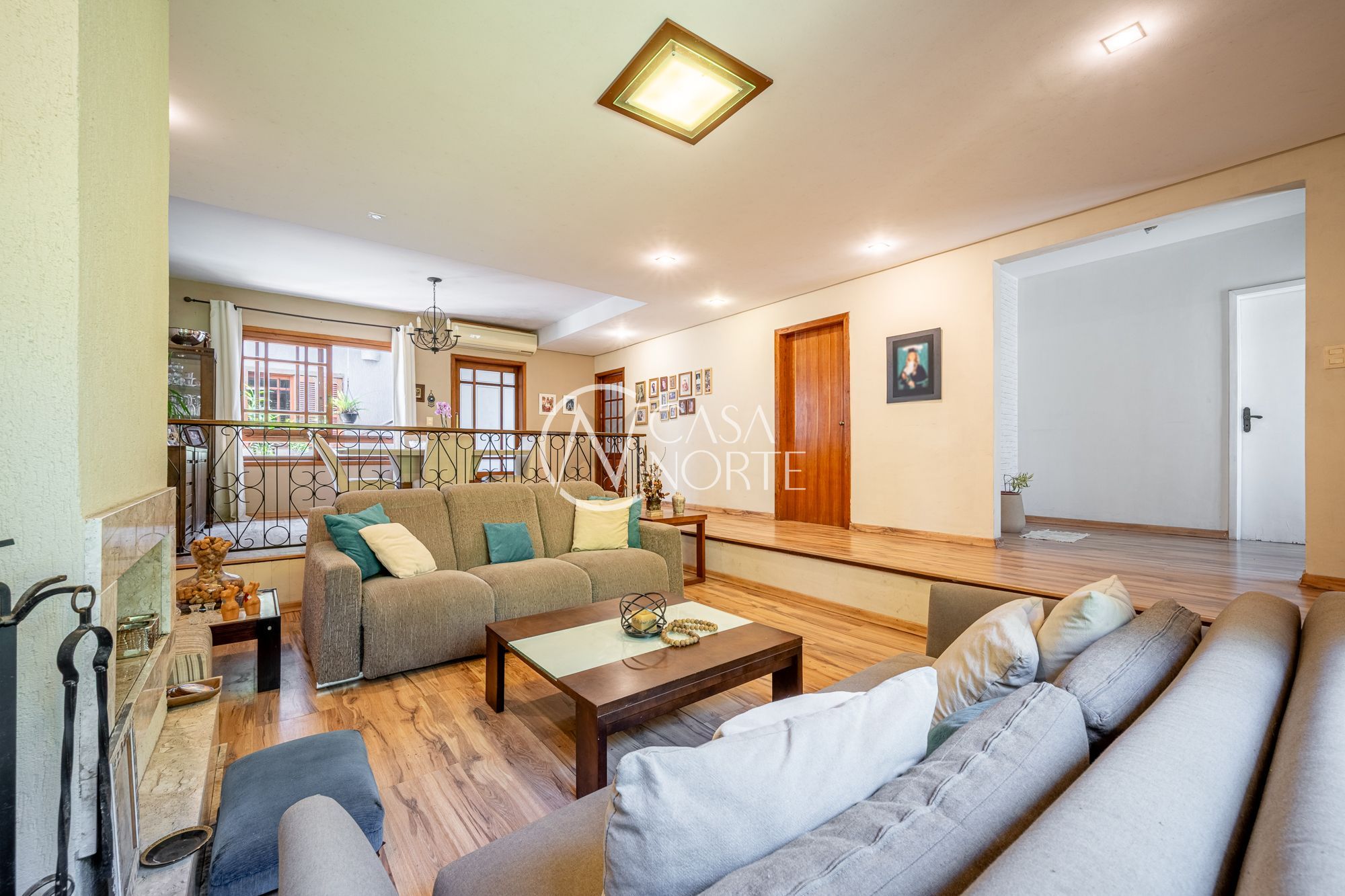 No pavimento principal, a casa conta com 3 dormitórios, sendo 1 suíte, banheiro social, e um escritório espaçoso. O living com lareira integra dois ambientes e ainda possui lavabo e um estar íntimo, ideal para sala de TV ou convivência familiar.