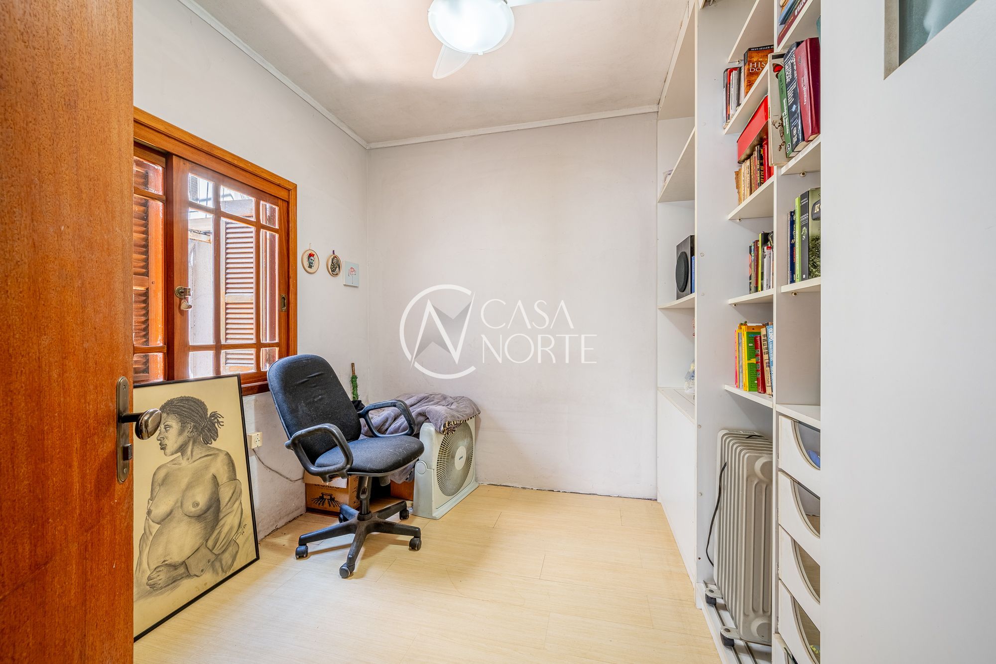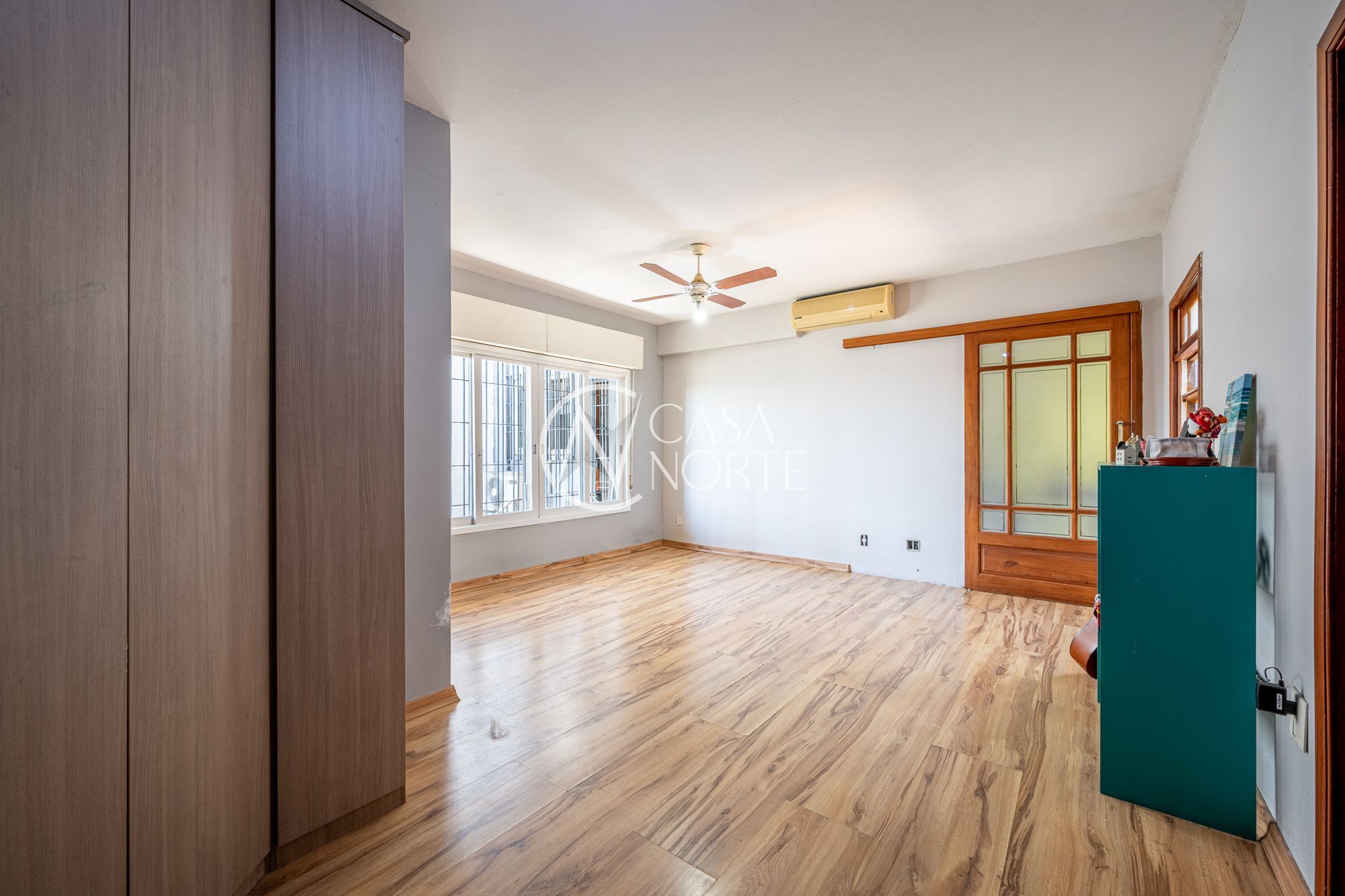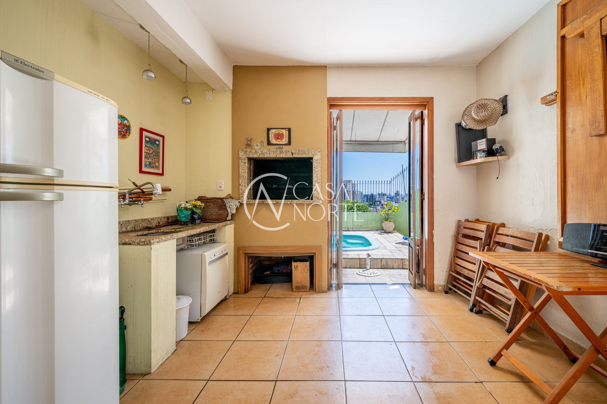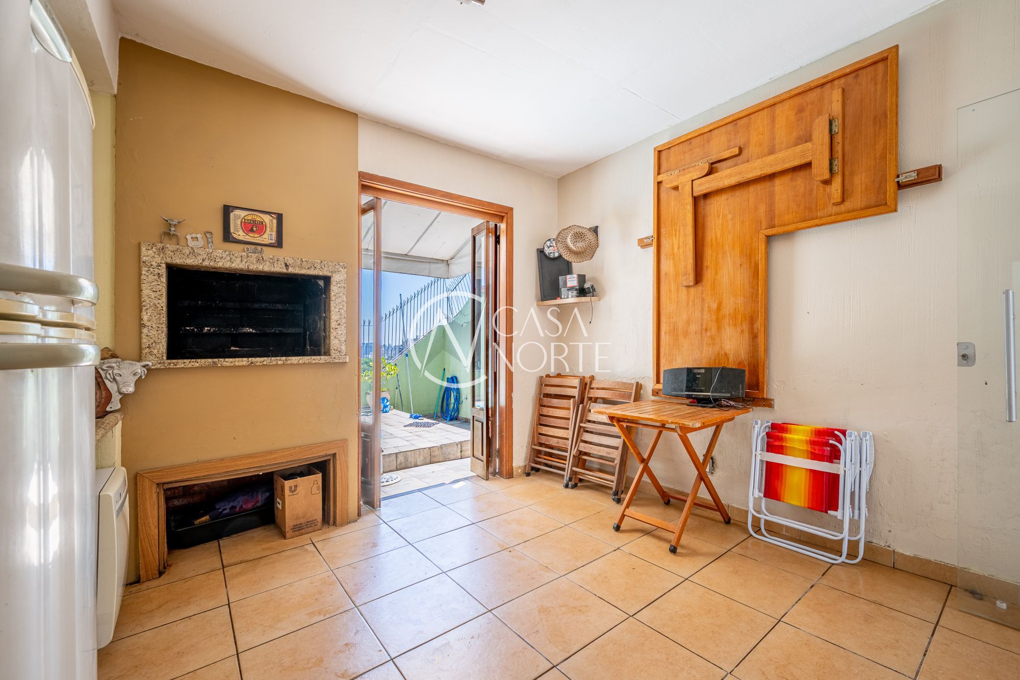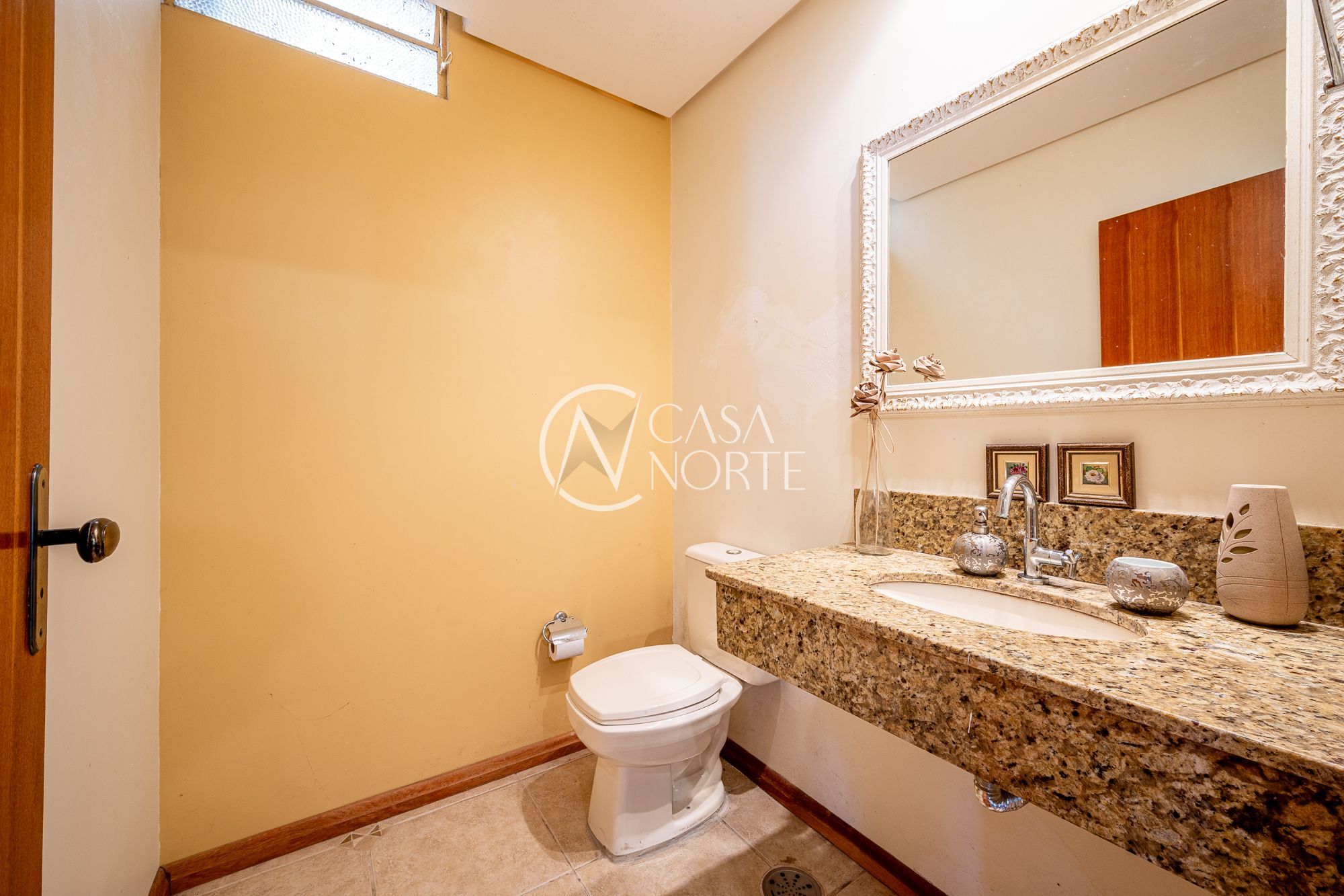 No pavimento principal, a casa conta com 3 dormitórios, sendo 1 suíte, banheiro social, e um escritório espaçoso. O living com lareira integra dois ambientes e ainda possui lavabo e um estar íntimo, ideal para sala de TV ou convivência familiar.