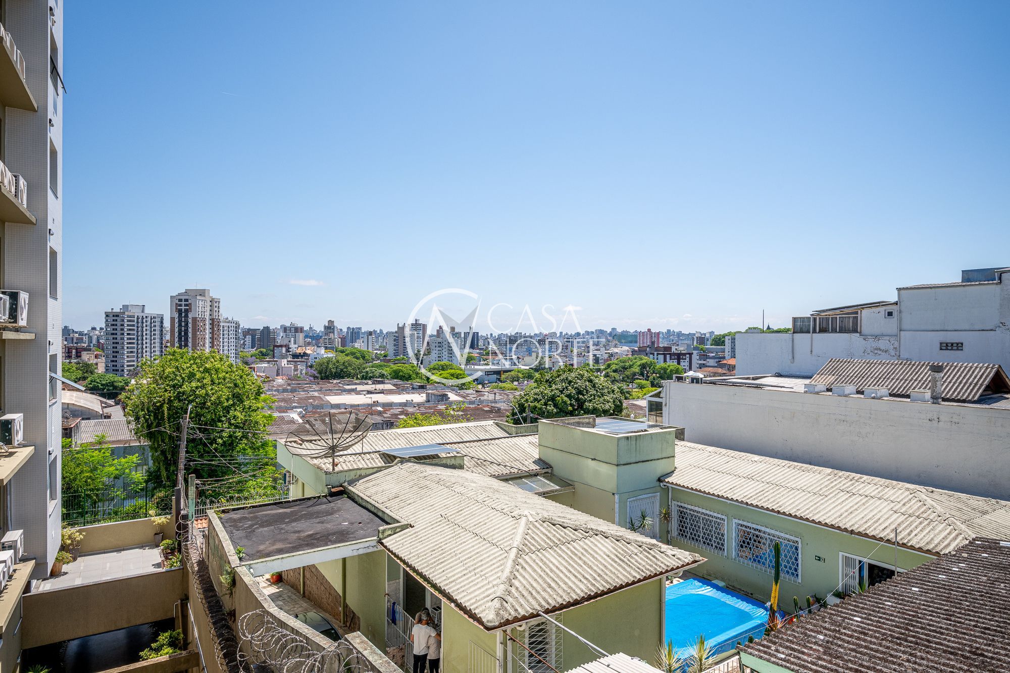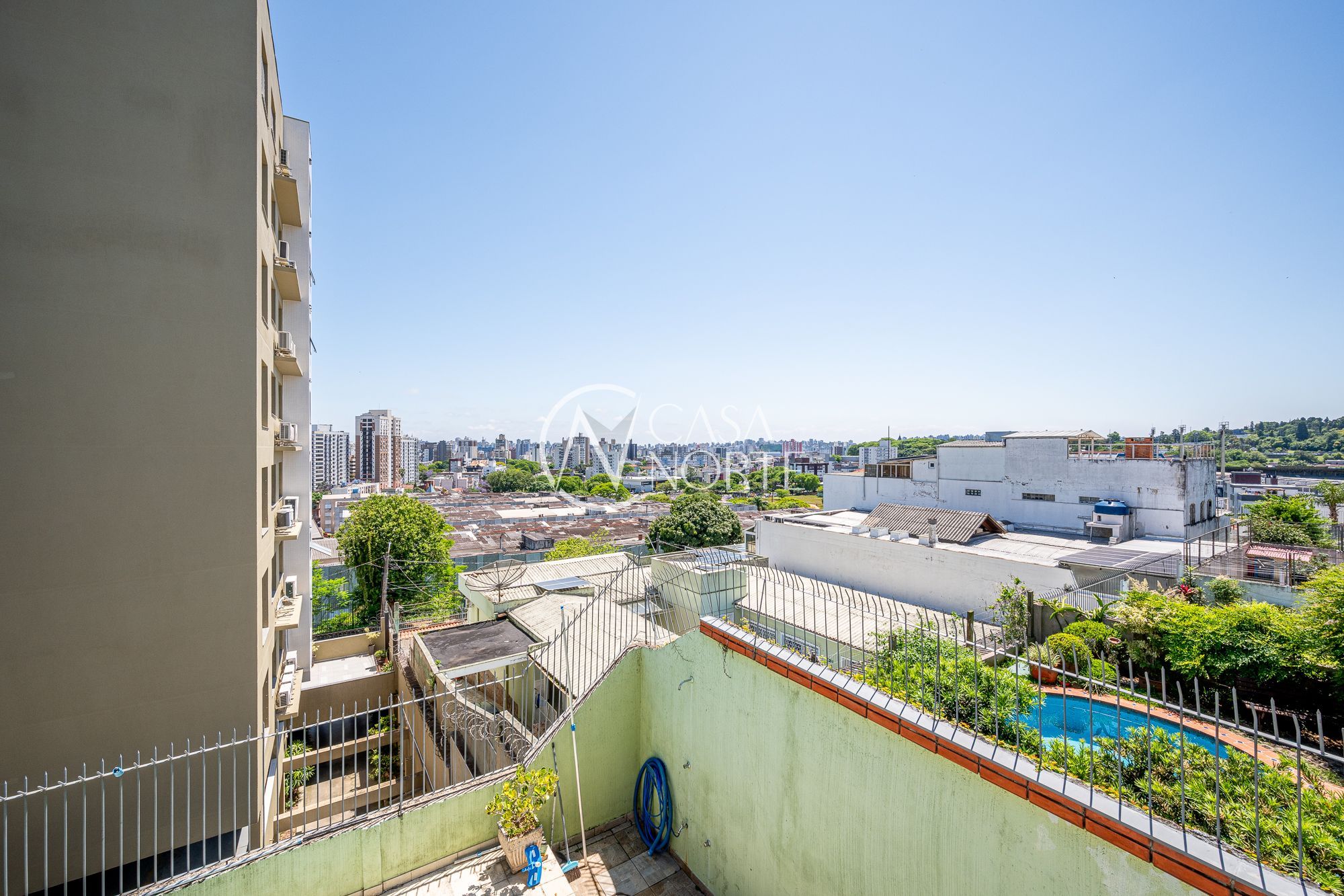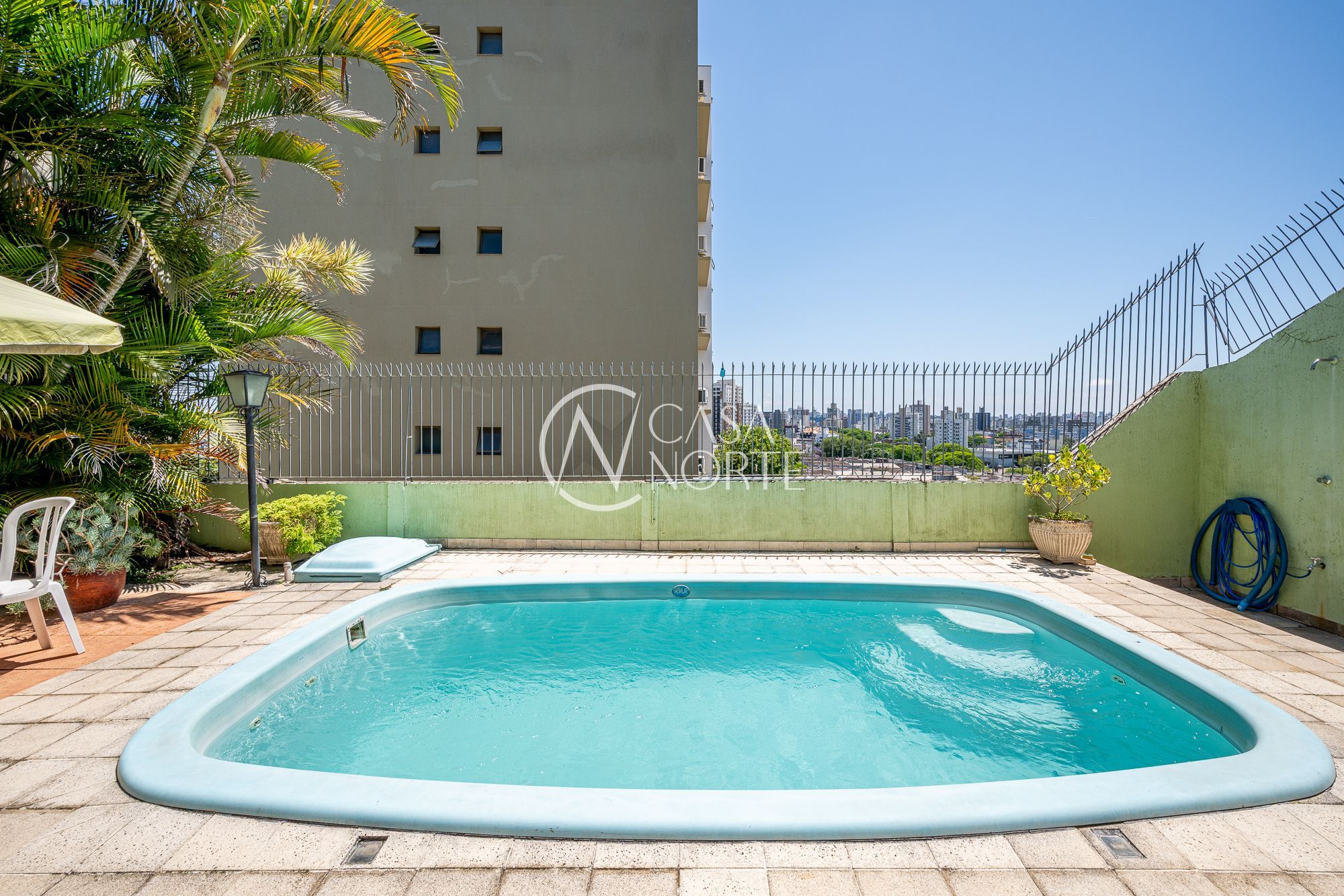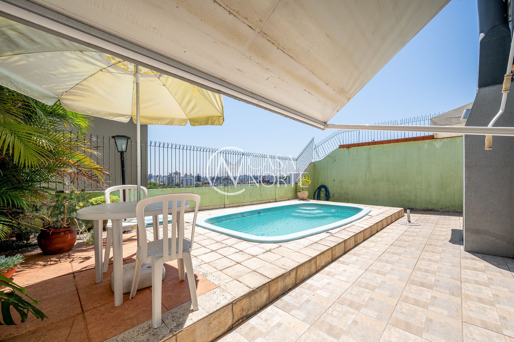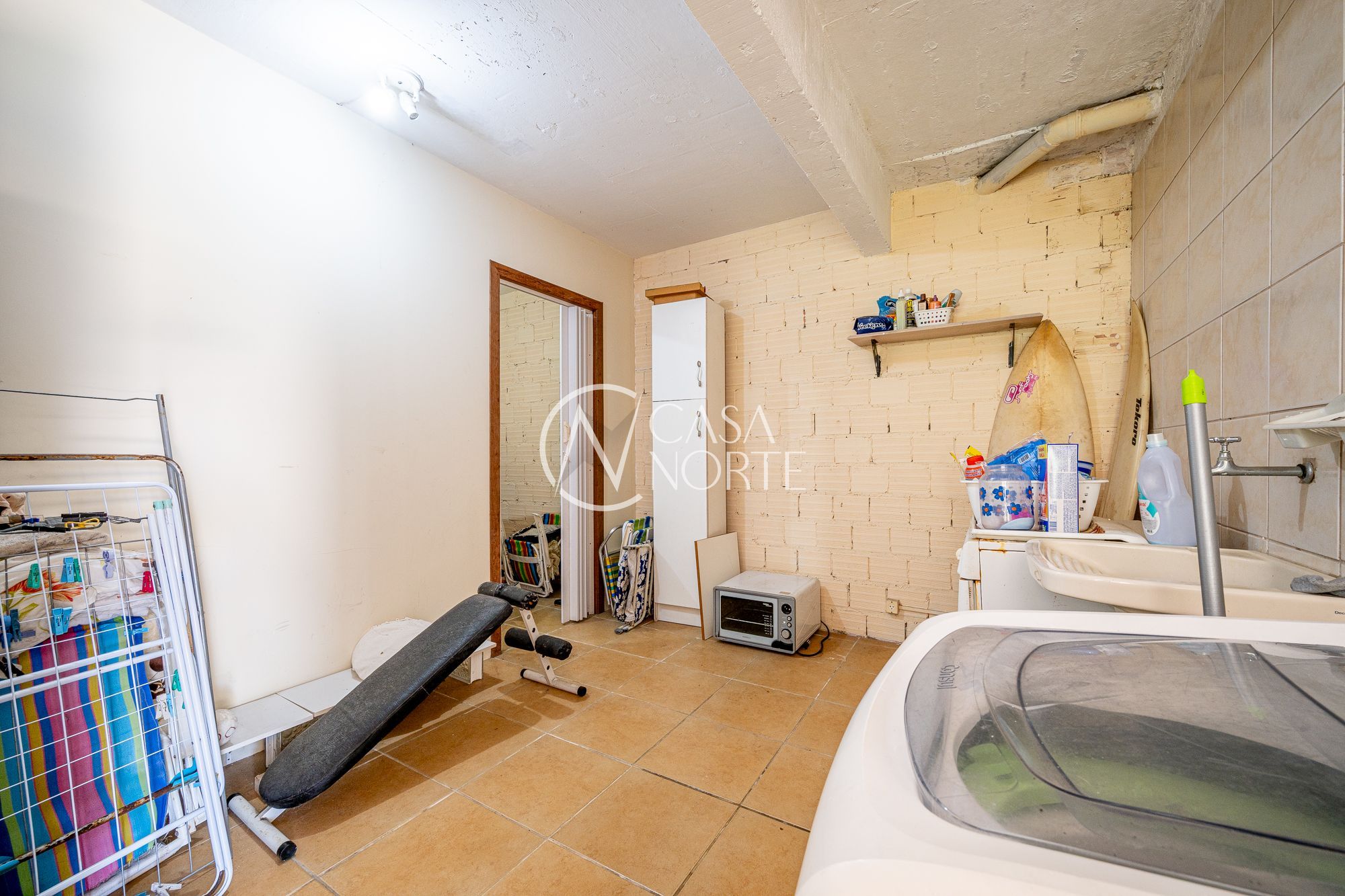 Na parte inferior, há uma área de lazer completa, com piscina, churrasqueira, banheiro de apoio, sala adicional, além de lavanderia ampla e depósito.