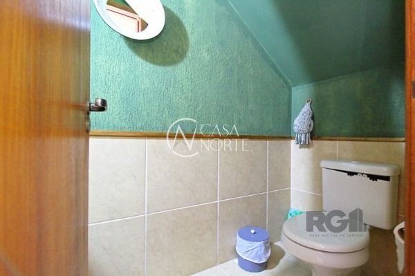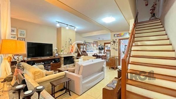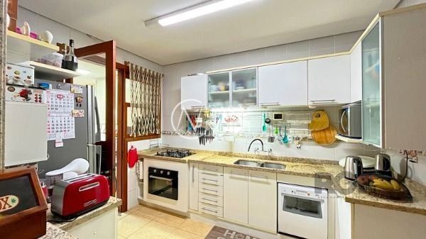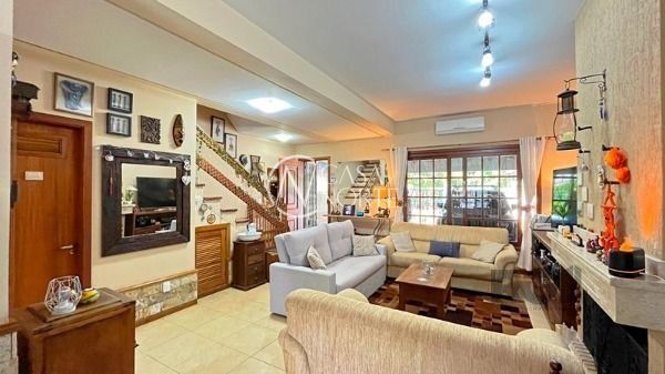 Sobrado de três pavimentos com 274 m² de área construída, garagem coberta para dois carros, ampla sala de estar com lareira de alvenaria, lavabo, sala de jantar, cozinha e área de serviço com móveis planejados. Banheiro auxiliar com chuveiro elétrico, espaço de churrasqueira com armários.