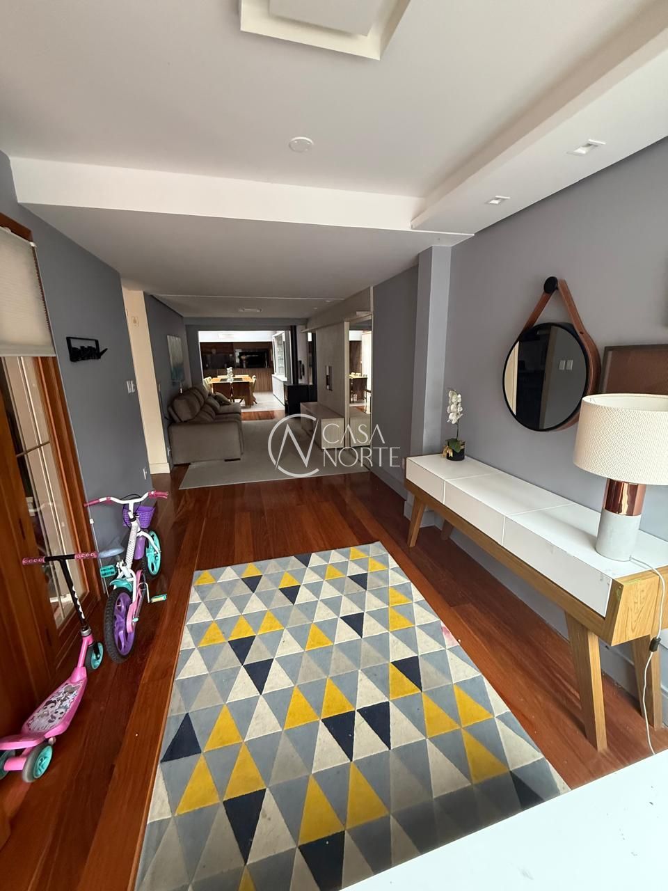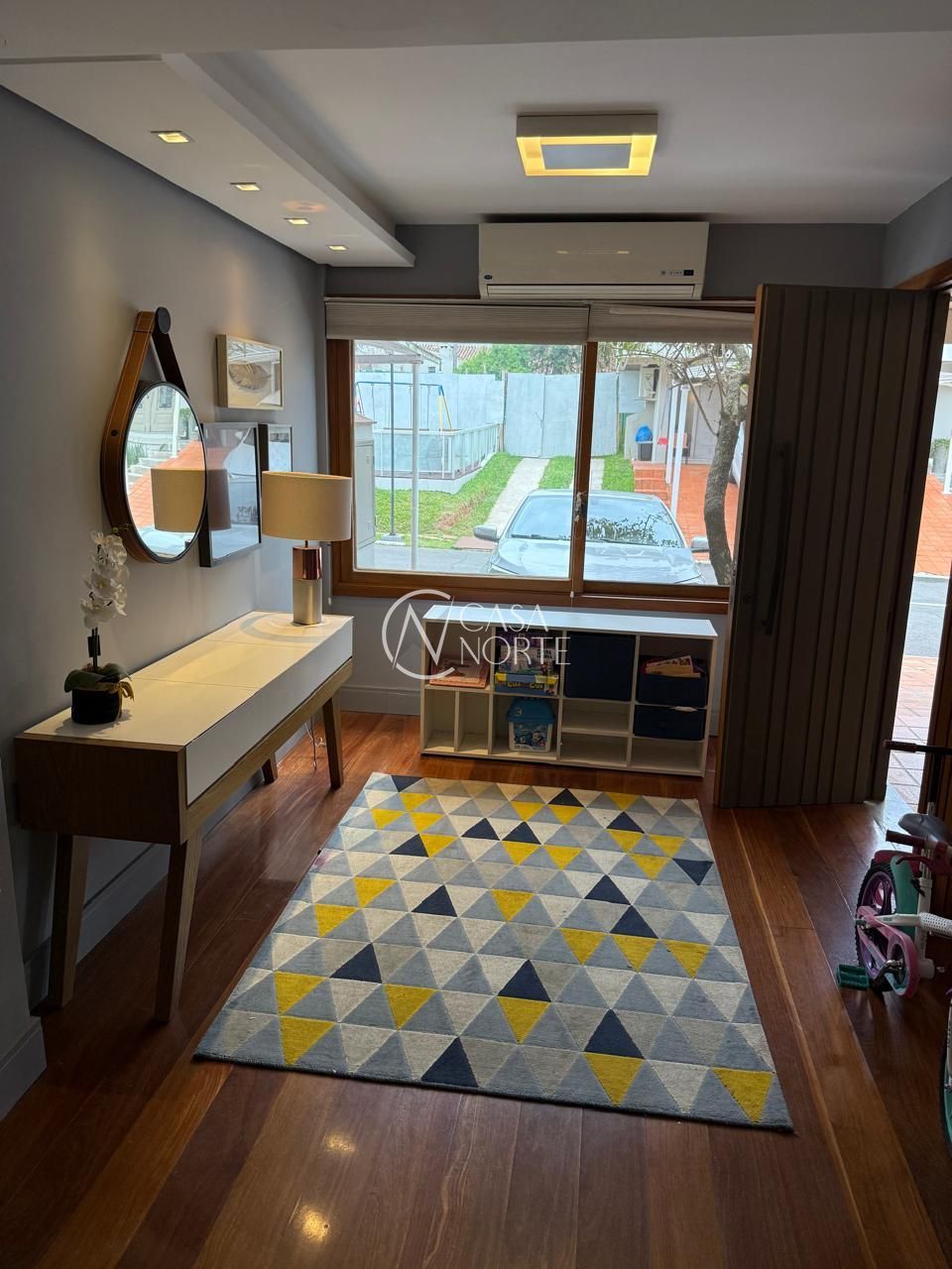Casa com hall de entrada, living 3 ambientes com split, lareira espaço gourmet, lavabo, cozinha, lavanderia, banheiro auxiliar e um amplo terraço.