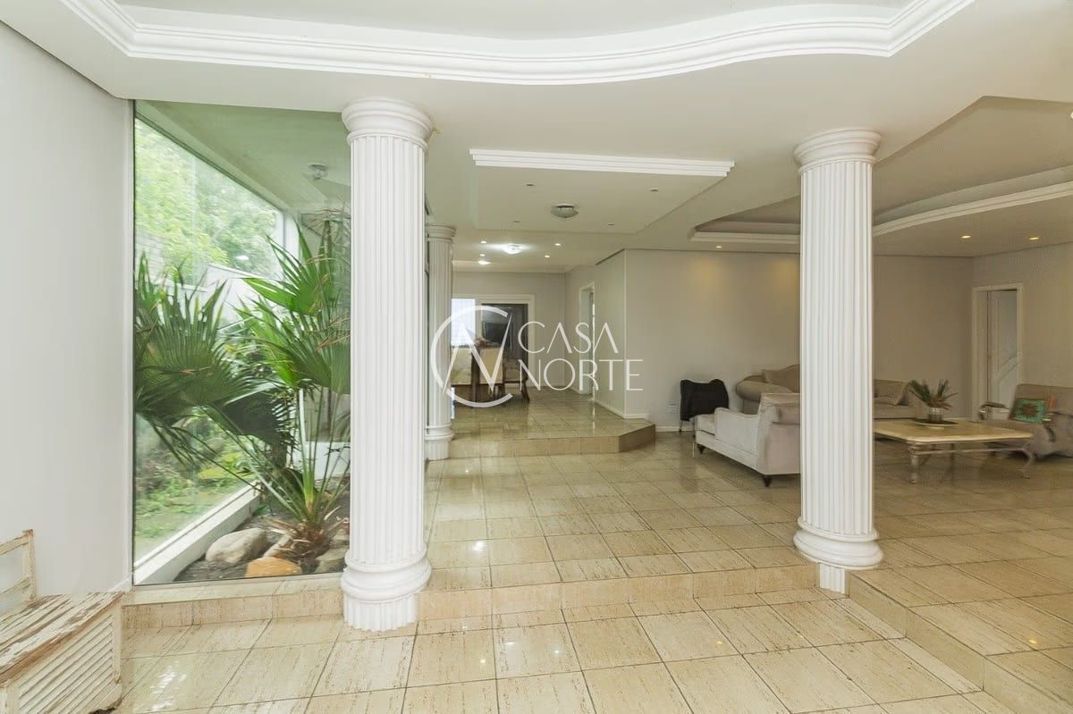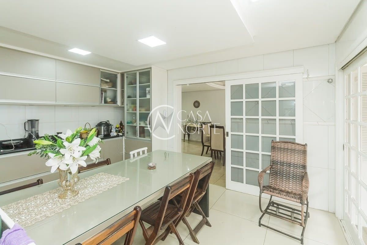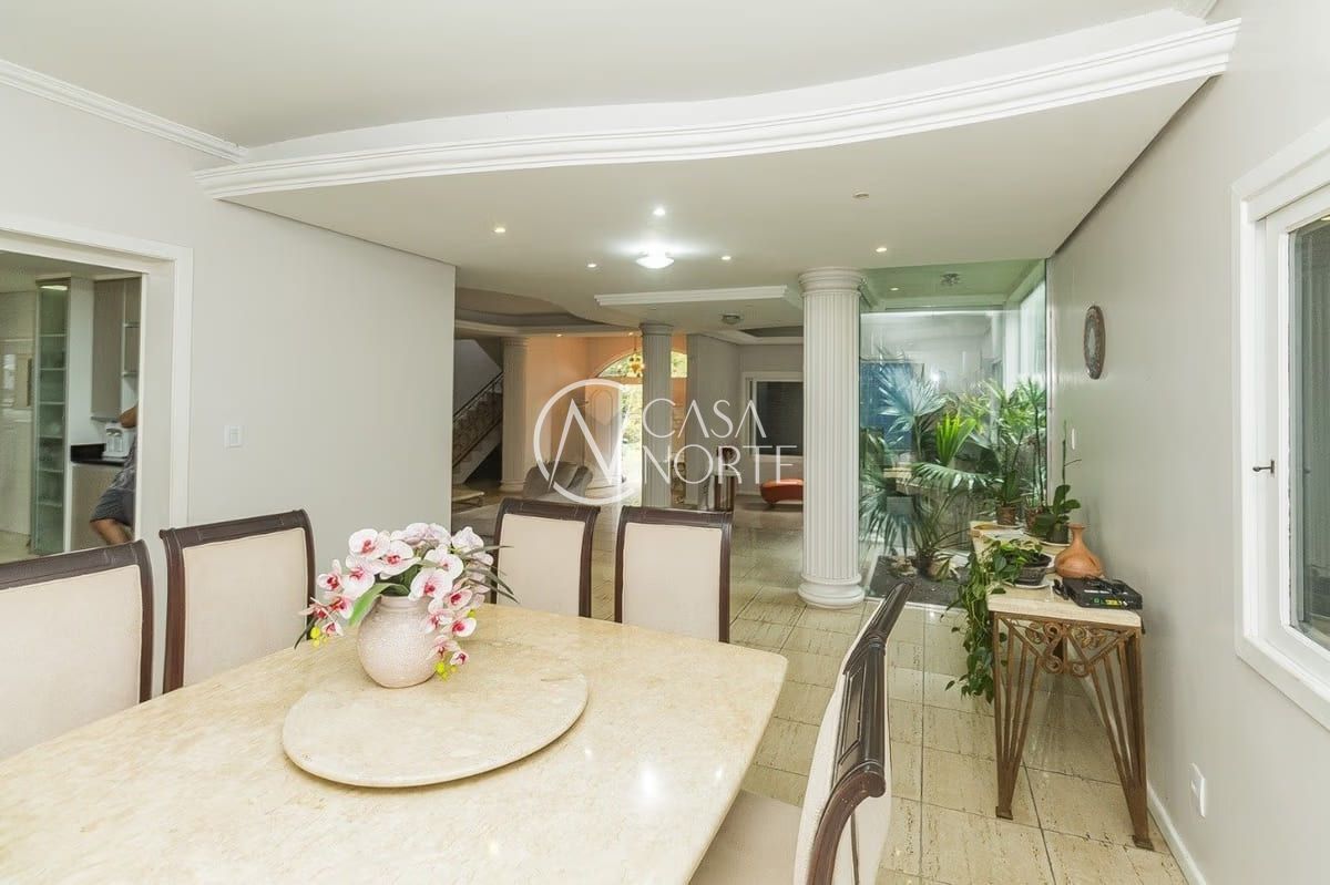 A casa conta com cinco dormitórios, incluindo uma suíte, além de cinco banheiros — três deles equipados com banheira. Os ambientes sociais são amplos e bem distribuídos, com living para dois ambientes e lareira, proporcionando conforto em todas as estações.