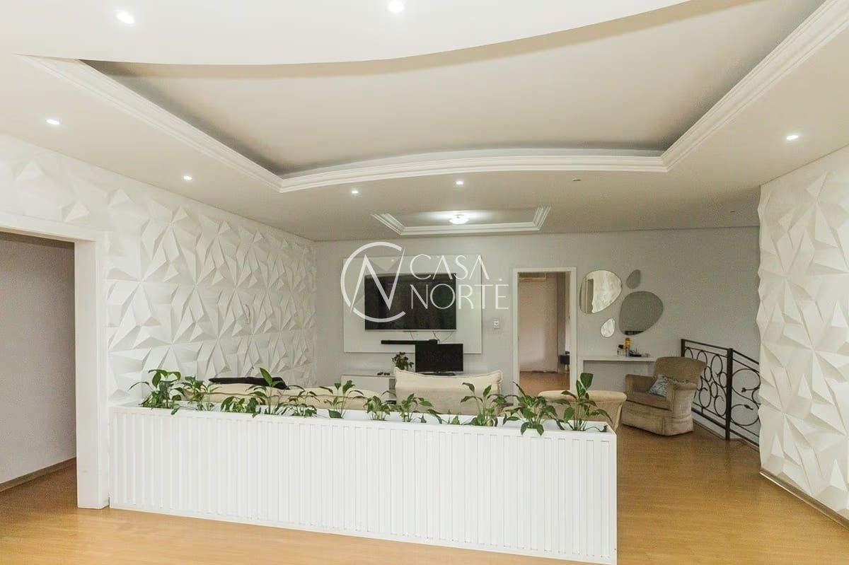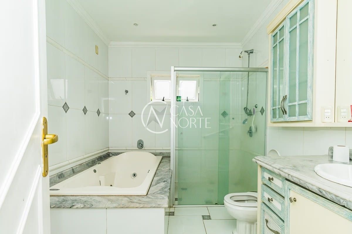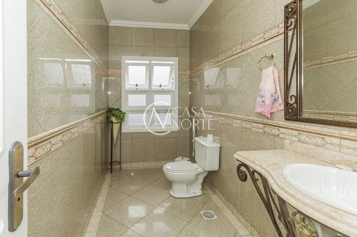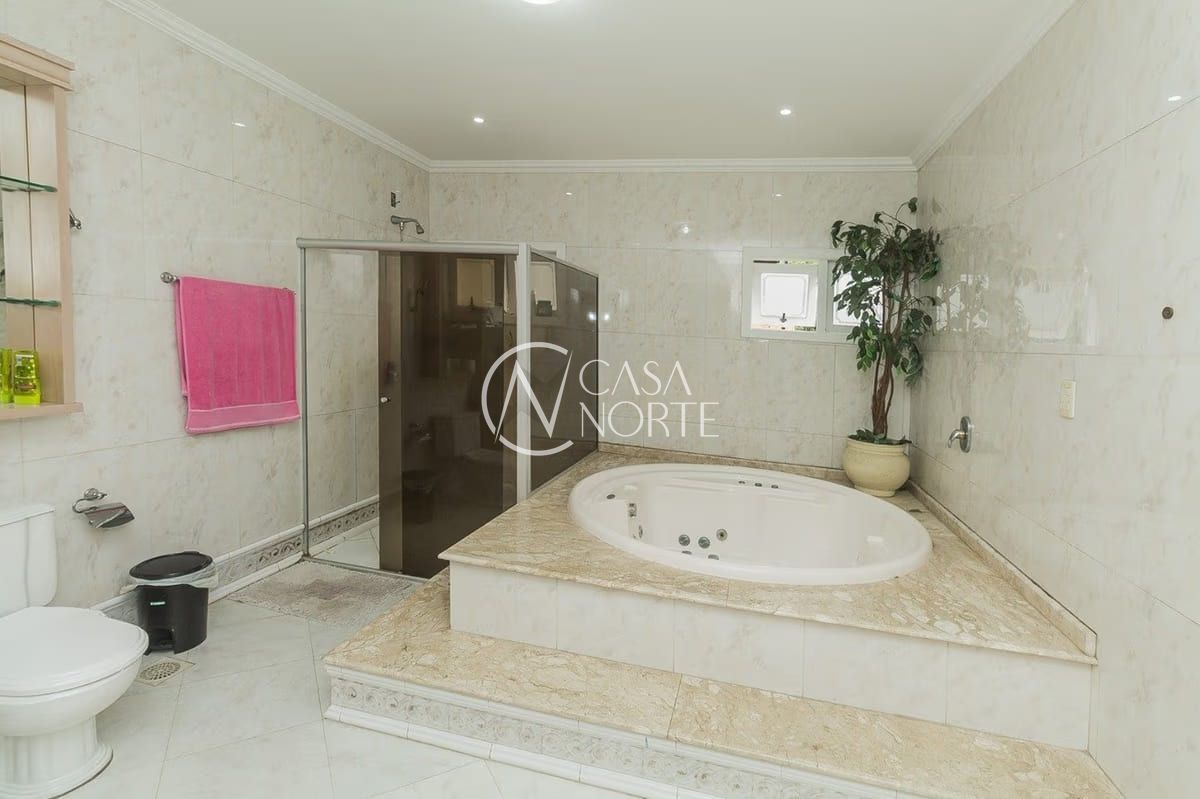 A casa conta com cinco dormitórios, incluindo uma suíte, além de cinco banheiros — três deles equipados com banheira. Os ambientes sociais são amplos e bem distribuídos, com living para dois ambientes e lareira, proporcionando conforto em todas as estações.