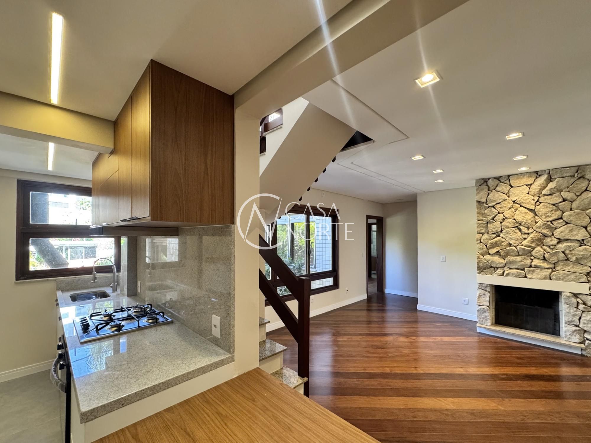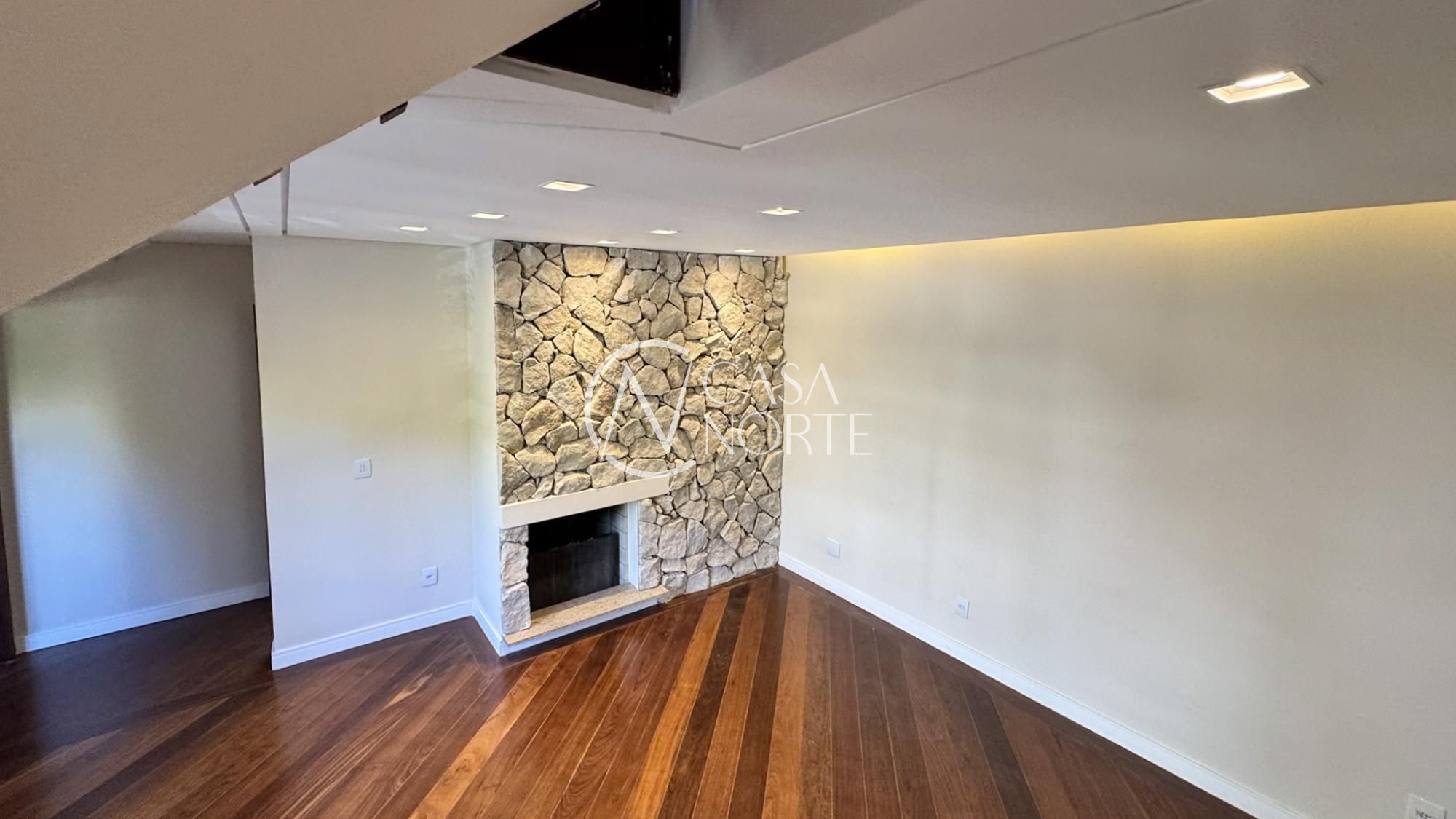 O primeiro pavimento oferece 2 dormitórios sendo 2 suítes, amplo living para dois ambientes com lareira, cozinha americana montada com área de serviço individual e dependência de empregada com banheiro auxiliar.