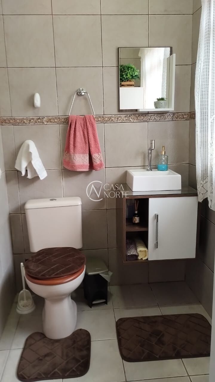A primeira casa, tem dois dormitórios (sendo um c/closet), um banheiro, um lavabo, sala de estar dois ambientes, cozinha/copa ( c/ mobília sob medida). Com aproximadamente 56 m² de área.