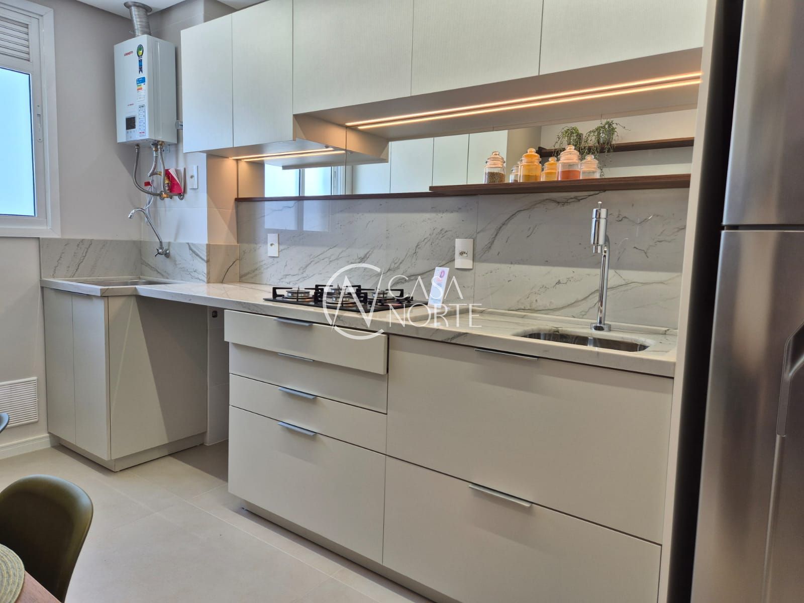 No interior do imóvel, você encontrará uma área de serviço, banheiro social, cozinha equipada, aquecimento a gás, interfone, churrasqueira, internet e telefone, garantindo praticidade e conforto em todos os ambientes.
