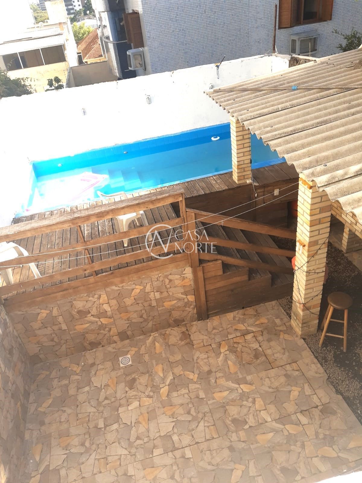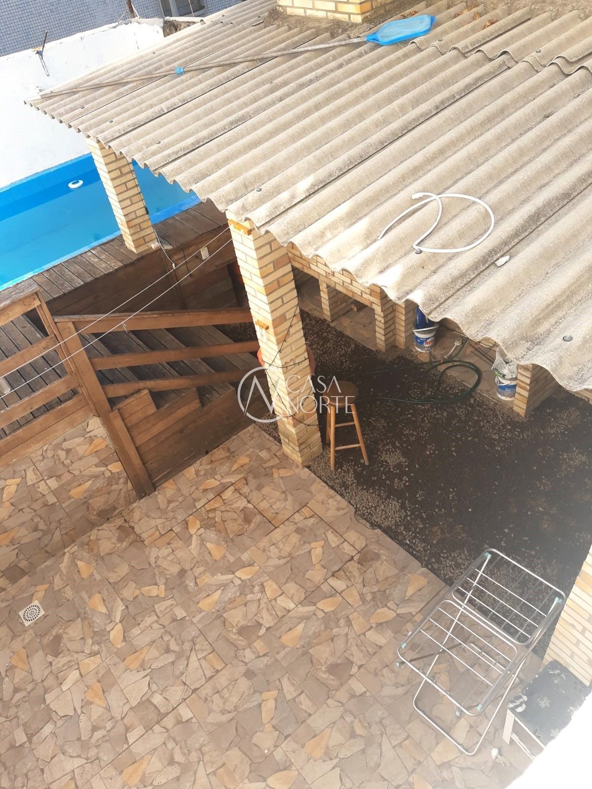 Nível principal com sala de estar ampla, cozinha com armários, área de serviço, 02 banheiros, despensa, lavanderia, garagem para 02 carros e pátio ao fundo com churrasqueira e piscina.