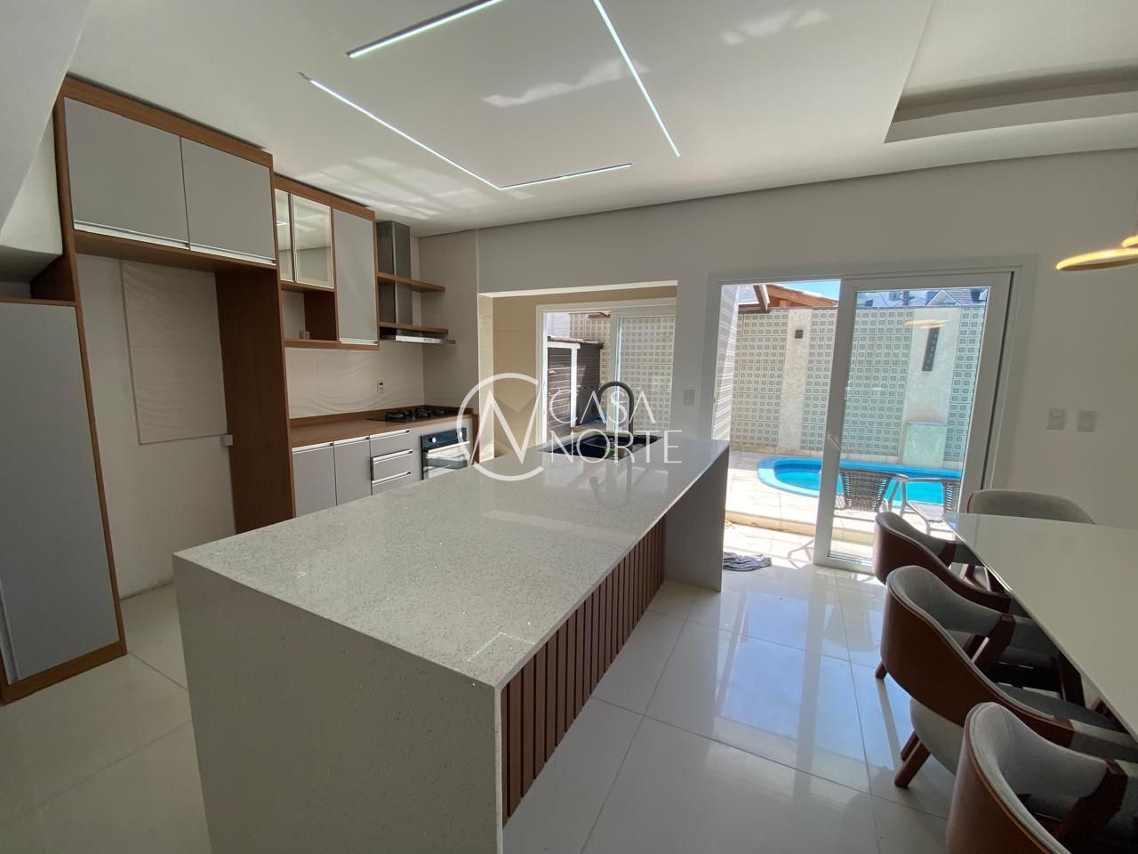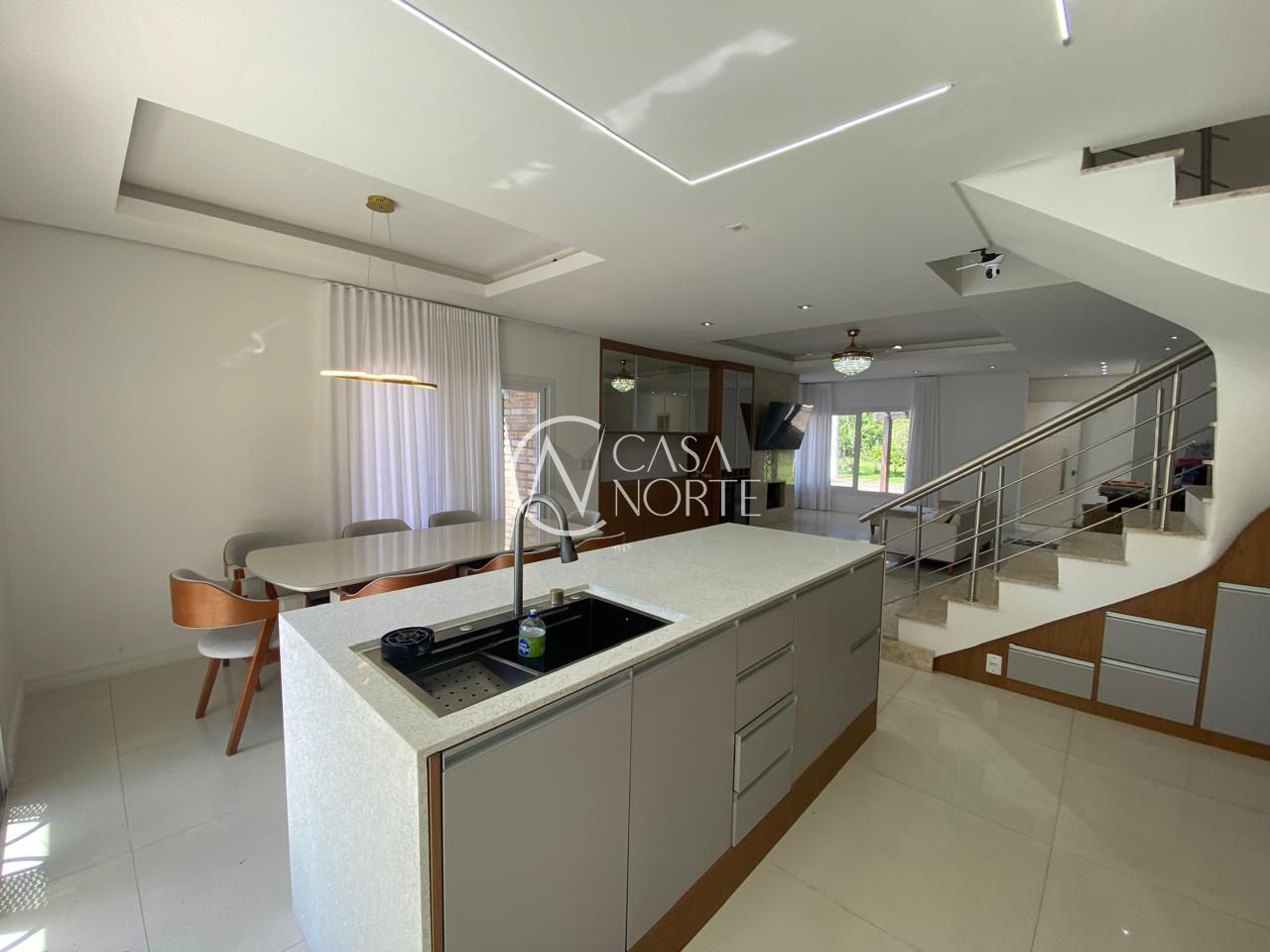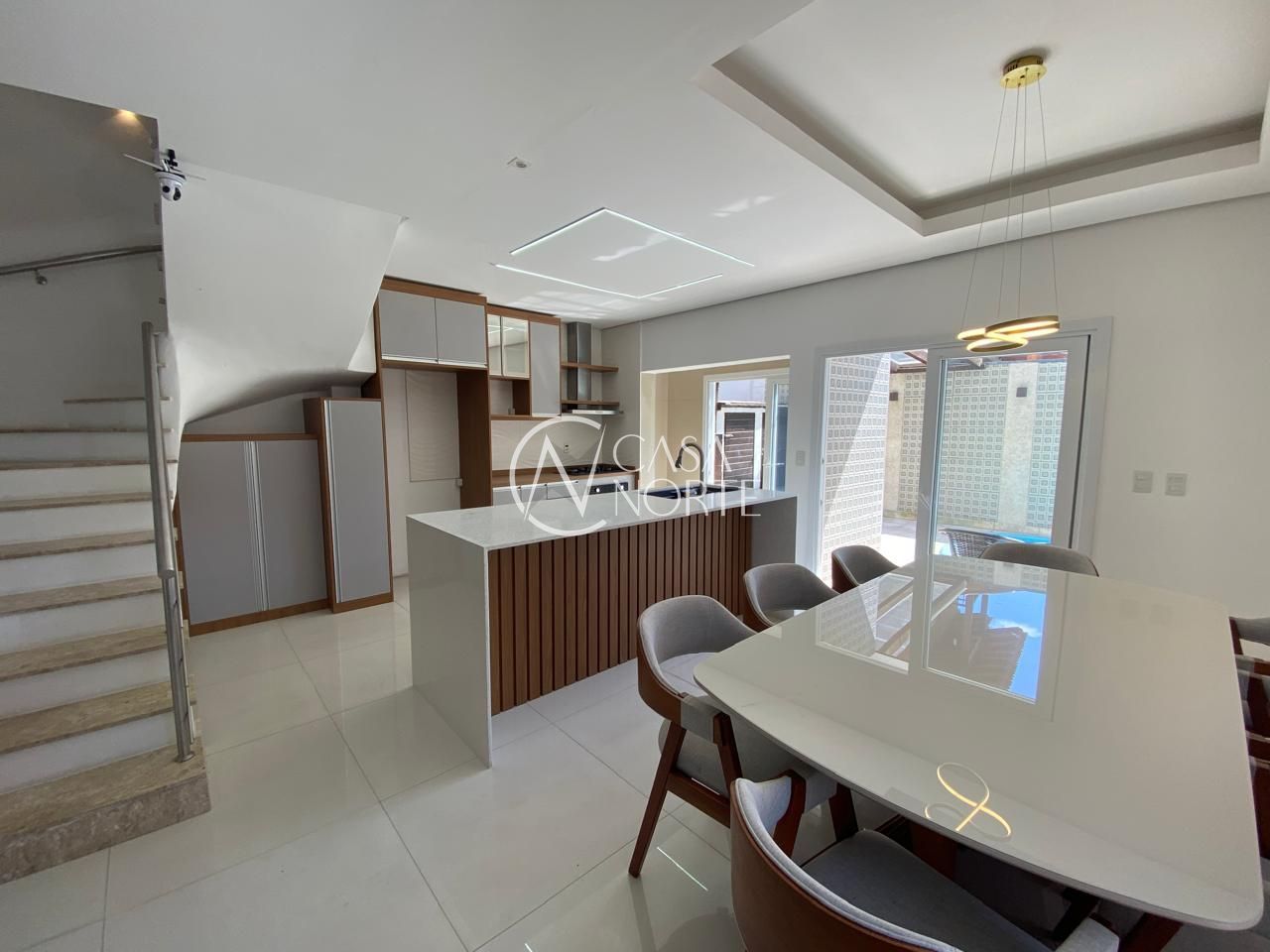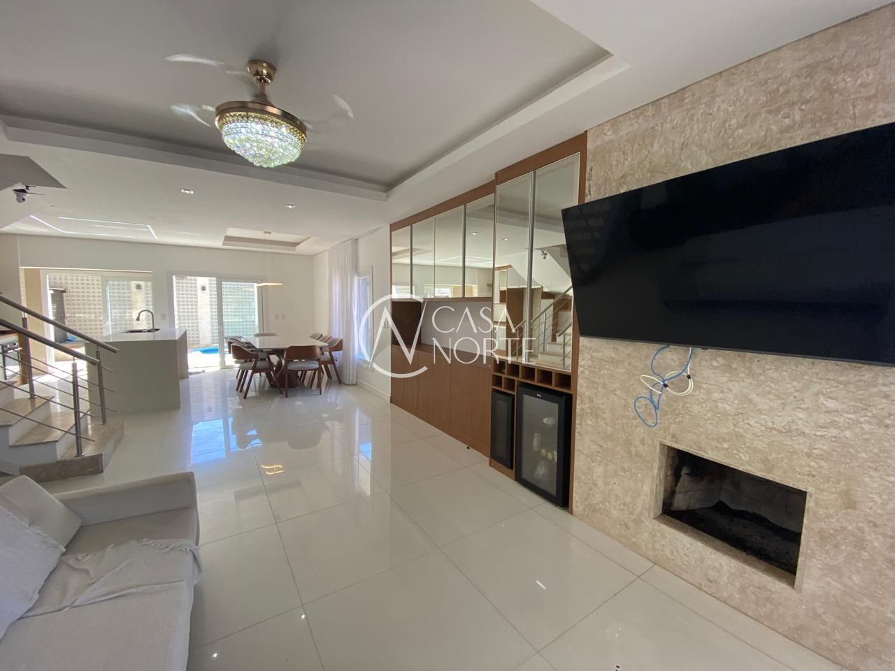 Ao entrar, você será recebido por um ambiente aconchegante, com lareira e uma decoração que une praticidade e elegância. A cozinha americana, equipada com armários planejados, é perfeita para preparar refeições em família. Além disso, a casa conta com ar condicionado, closet, lavabo e uma área de serviço funcional.