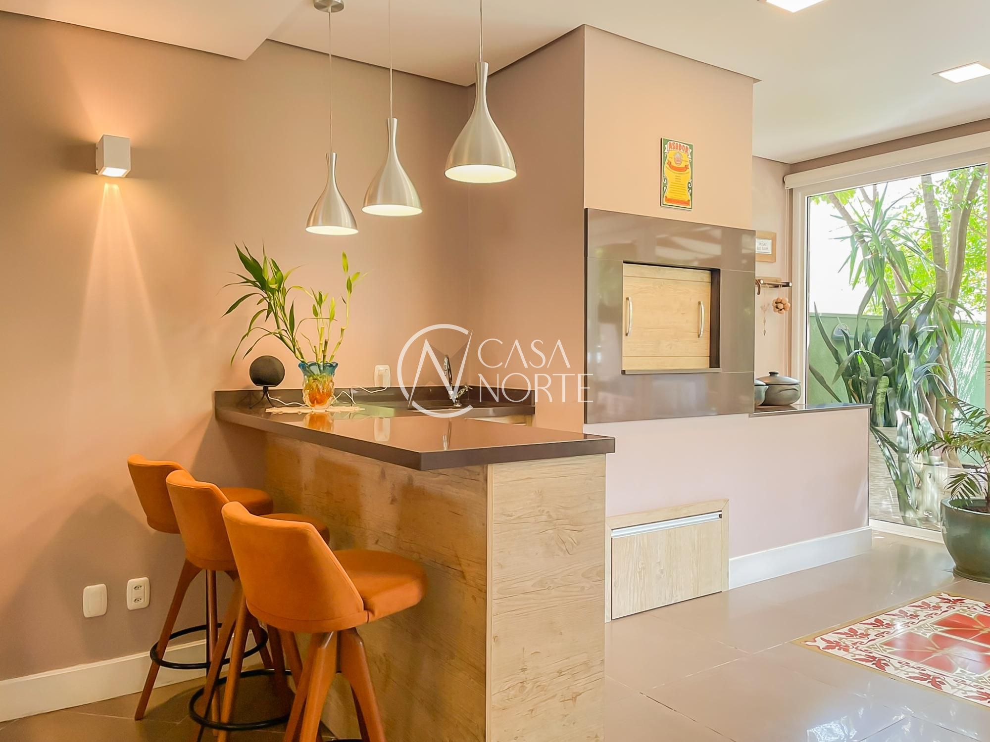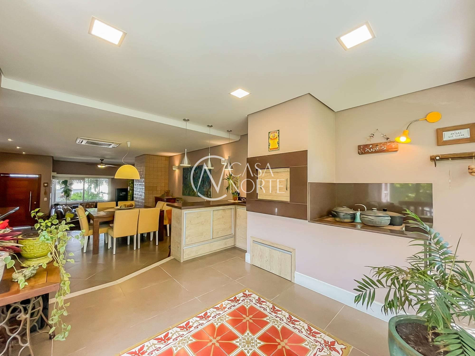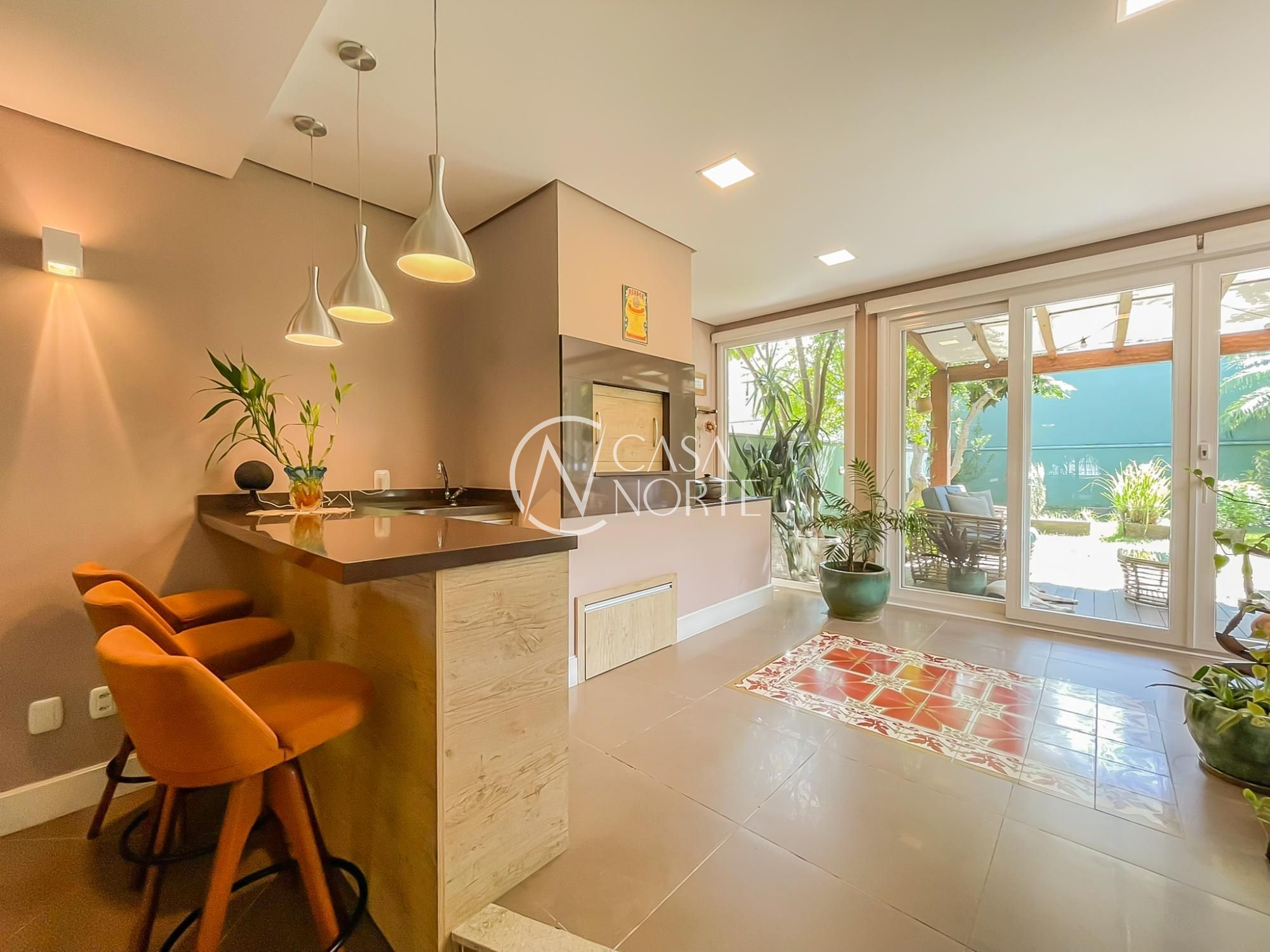 O imóvel conta com um amplo living integrado à sala de jantar e uma área gourmet super aconchegante, equipada com churrasqueira e fogão campeiro. O pátio arborizado, com árvores frutíferas e horta, entrega aquela vibe de refúgio natural dentro da cidade.