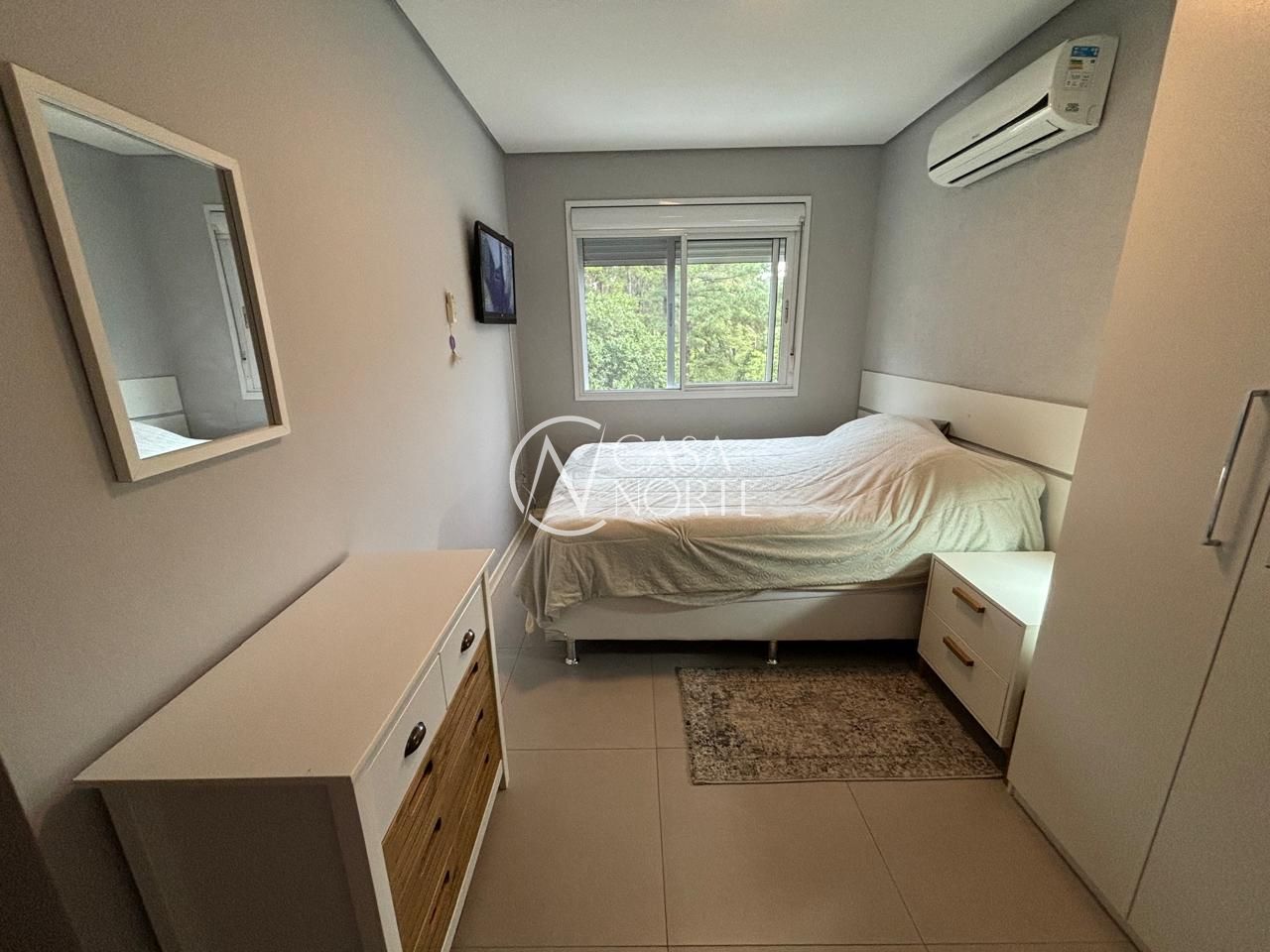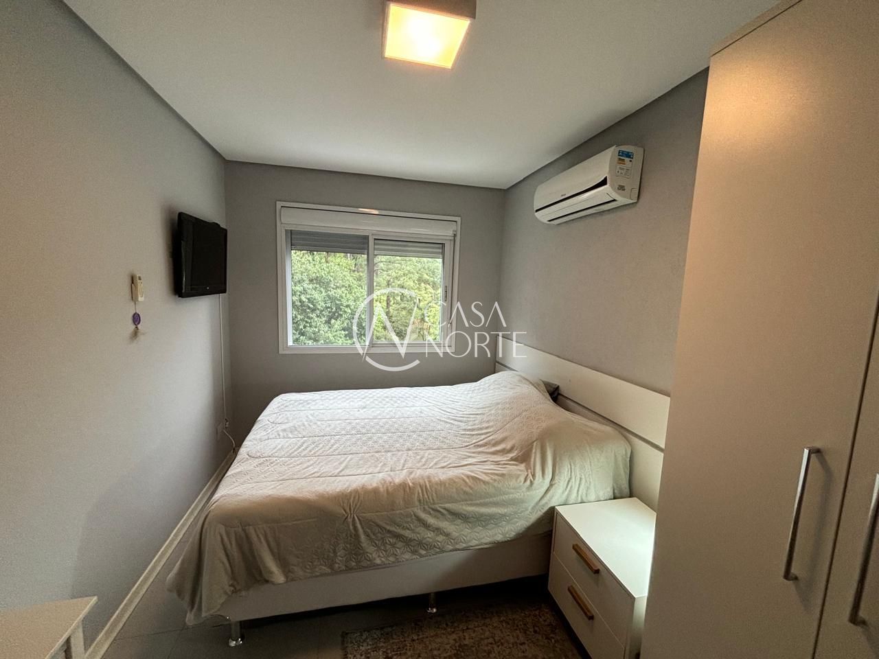 Apartamento mobiliado de 56 metros privativos. Ampla sala dois ambientes com janela grande e split. Cozinha americana com móveis planejados, geladeira, fogão e maquina de lavar. 2 dormitórios com uma suíte. Banheiro social. Duas vagas de garagem escrituradas. Sol da tarde.