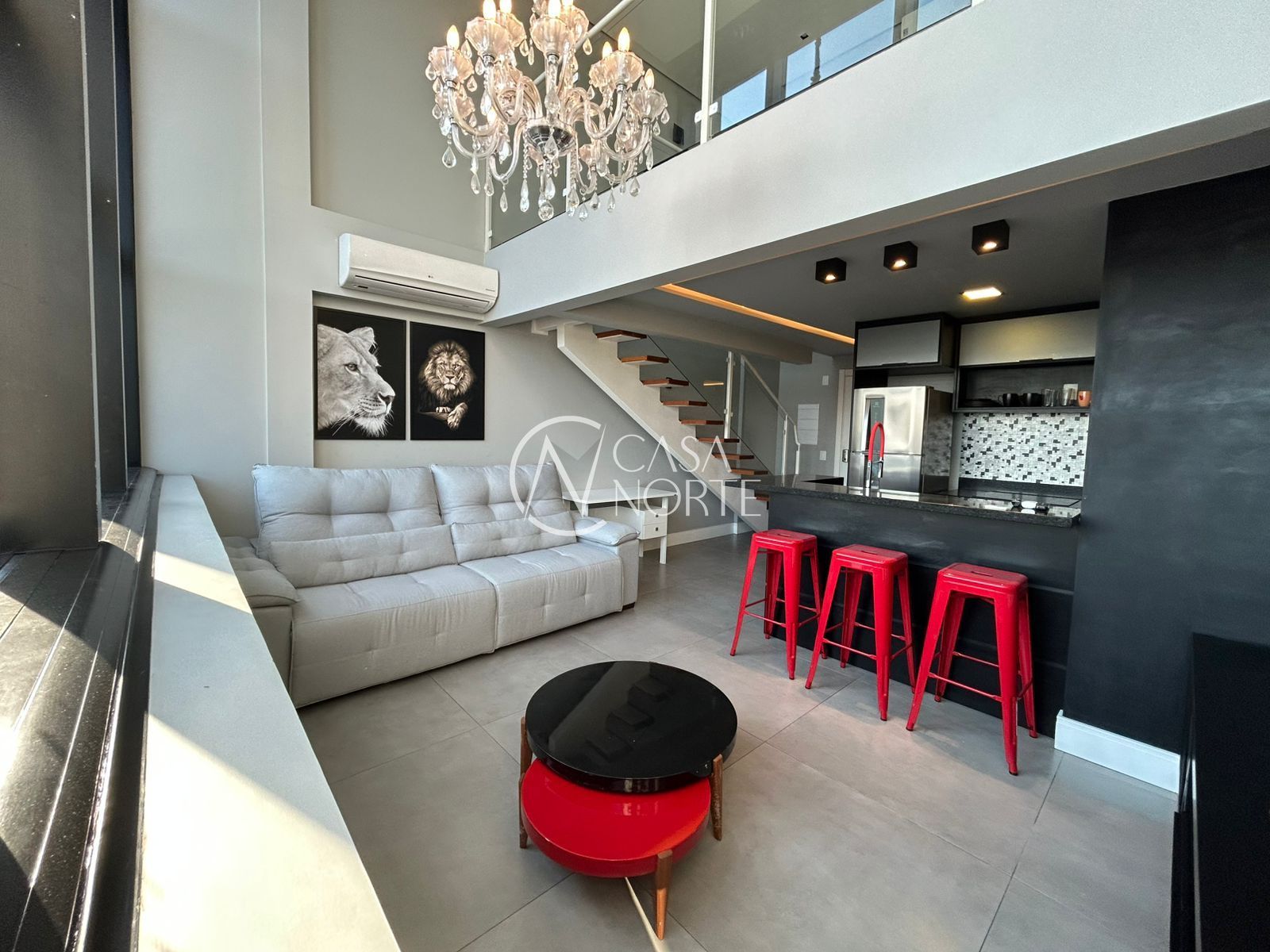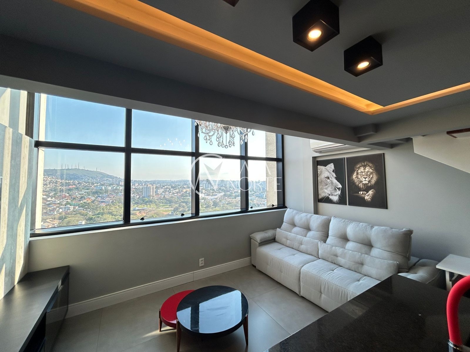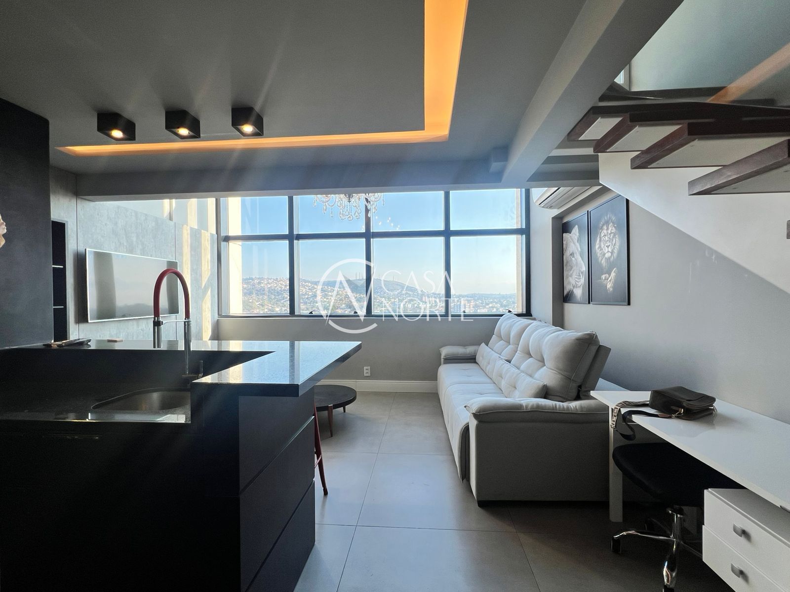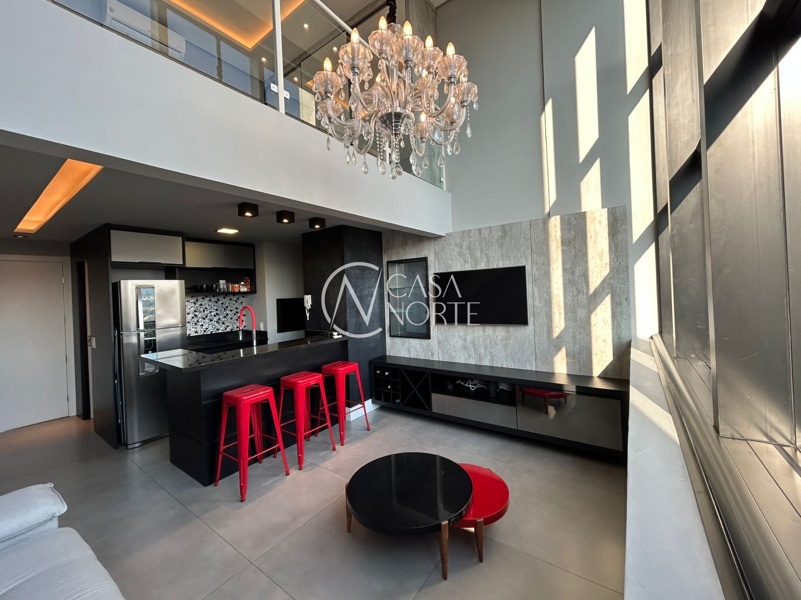 Apartamento duplex de 57 m2 com 1 suíte, decorado e mobiliado, pé direito duplo, churrasqueira, vista panorâmica com pôr do sol e skyline.