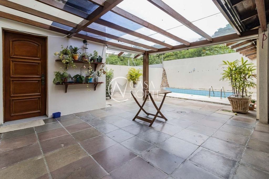 Nos fundos, o espaço externo oferece momentos de lazer com piscina, área com churrasqueira, lavanderia, dependência completa de empregada e banheiro auxiliar. A garagem fechada comporta até três veículos, com espaço adicional no pátio frontal para mais um carro.