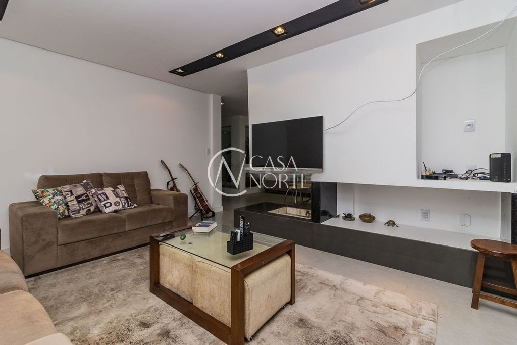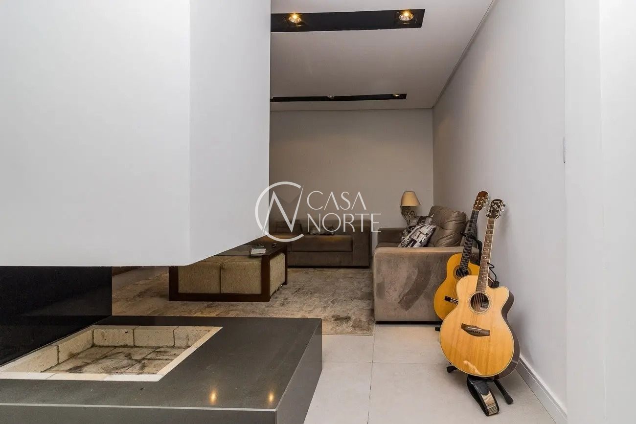 A área social da casa é acolhedora e funcional, com hall de entrada, gabinete, sala de estar com espera para lareira a gás, lavabo, sala de jantar integrada a uma ampla cozinha e mais um estar íntimo com lareira, que proporciona conforto térmico tanto para a cozinha quanto para a área de convivência.