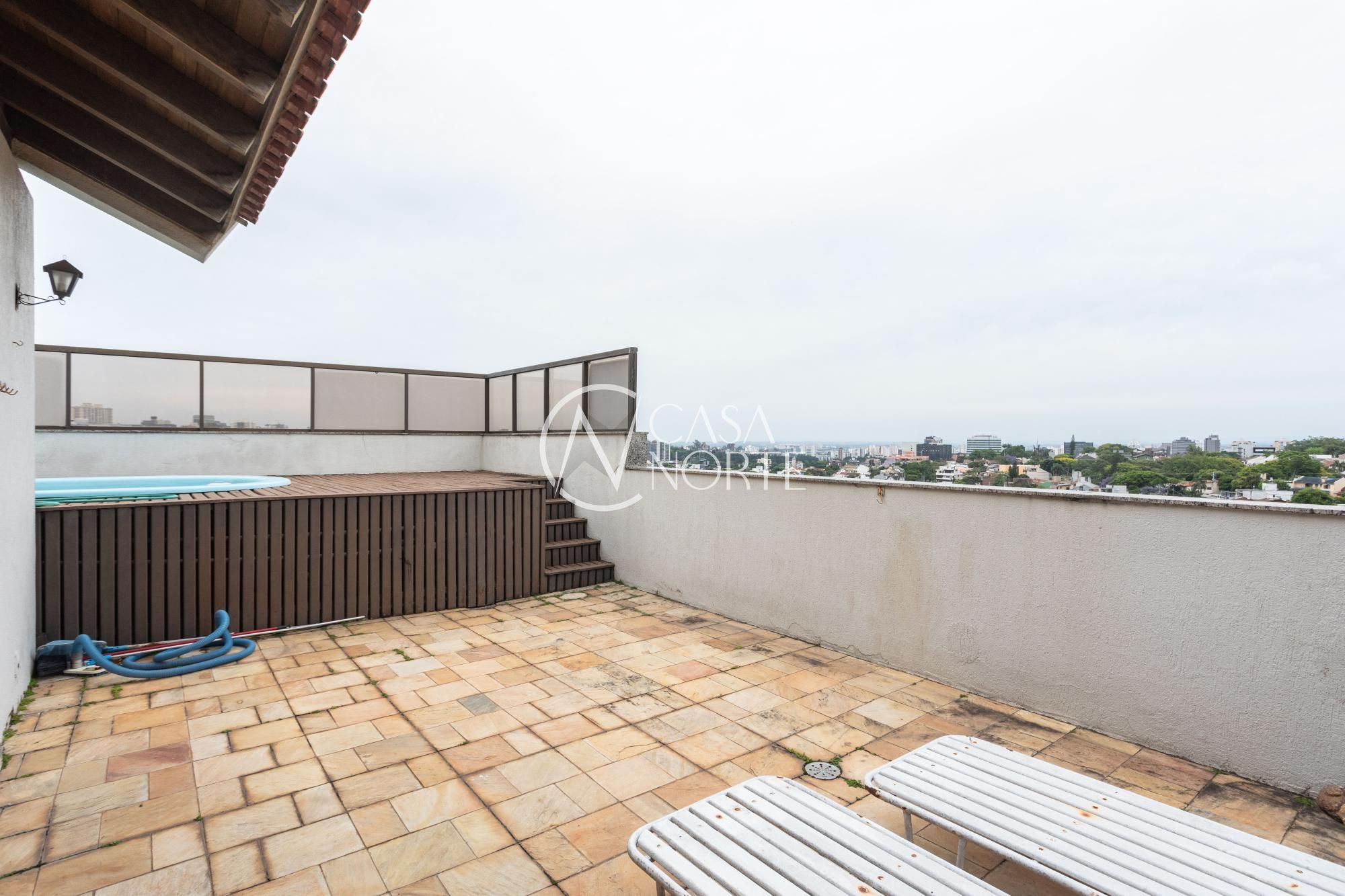 Parte superior com sala de estar, churrasqueira e terraço com piscina