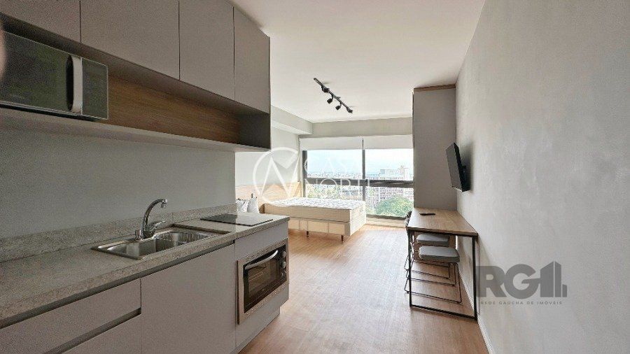 Apartamento novo, 1 quarto, totalmente mobiliado por arquiteto, com uma vista maravilhosa, no 12° andar e com 1 vaga de garagem.
